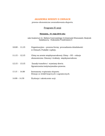 AKADEMIA WIEDZY O CHINACH prawno-ekonomiczne uwarunkowania eksportu. Program IV sesji Warszawa, 19 maja 2016 roku sala Audytorium im. Stefana Czarnowskiego 3,Uniwersytet Warszawski, Budynek Dydaktyczny - Krakowskie Przedmieście 3 10.00 - 11.15 Organizacyjno – prawne formy prowadzenia działalności w Chinach. Podatki i opłaty. 11.15 - 12.15 Chiny na arenie międzynarodowej. Chiny – UE – relacje ekonomiczne. Umowy i traktaty międzynarodowe. 12.15 - 13.15 Zasady transferu i wymiany dewiz. Ograniczenia instytucjonalno-prawne. 13.15 - 14.00 Instrumenty wspierania eksportu. Dotacje ze źródeł krajowych i zagranicznych. 14.00 – 14.30 Dyskusja i zakończenie sesji.