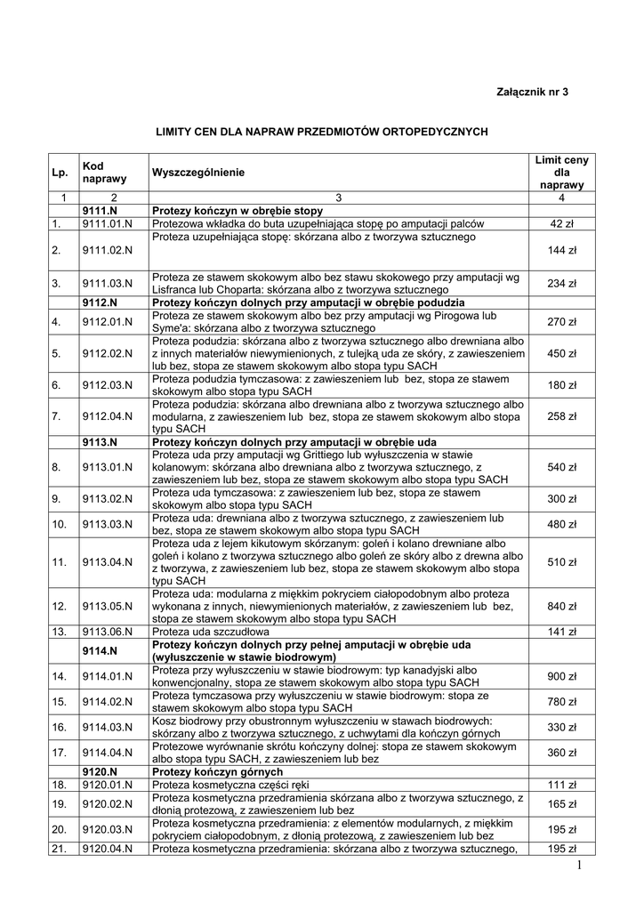 Załącznik nr 3 LIMITY CEN DLA NAPRAW PRZEDMIOTÓW ORTOPEDYCZNYCH Lp. 1 Kod naprawy 1. 2 9111.N 9111.01.N 2. 9111.02.N 3. 9111.03.N 9112.N 4. 9112.01.N 5. 9112.02.N 6. 9112.03.N 7. 9112.04.N 9113.N 8. 9113.01.N 9. 9113.02.N 10. 9113.03.N 11. 9113.04.N 12. 9113.05.N 13. 9113.06.N 9114.N 14. 9114.01.N 15. 9114.02.N 16. 9114.03.N 17. 9114.04.N 18. 9120.N 9120.01.N 19. 9120.02.N 20. 9120.03.N 21. 9120.04.N Wyszczególnienie 3 Protezy kończyn w obrębie stopy Protezowa wkładka do buta uzupełniająca stopę po amputacji palców Proteza uzupełniająca stopę: skórzana albo z tworzywa sztucznego Limit ceny dla naprawy 4 42 zł 144 zł Proteza ze stawem skokowym albo bez stawu skokowego przy amputacji wg Lisfranca lub Choparta: skórzana albo z tworzywa sztucznego Protezy kończyn dolnych przy amputacji w obrębie podudzia Proteza ze stawem skokowym albo bez przy amputacji wg Pirogowa lub Syme'a: skórzana albo z tworzywa sztucznego Proteza podudzia: skórzana albo z tworzywa sztucznego albo drewniana albo z innych materiałów niewymienionych, z tulejką uda ze skóry, z zawieszeniem lub bez, stopa ze stawem skokowym albo stopa typu SACH Proteza podudzia tymczasowa: z zawieszeniem lub bez, stopa ze stawem skokowym albo stopa typu SACH Proteza podudzia: skórzana albo drewniana albo z tworzywa sztucznego albo modularna, z zawieszeniem lub bez, stopa ze stawem skokowym albo stopa typu SACH Protezy kończyn dolnych przy amputacji w obrębie uda Proteza uda przy amputacji wg Grittiego lub wyłuszczenia w stawie kolanowym: skórzana albo drewniana albo z tworzywa sztucznego, z zawieszeniem lub bez, stopa ze stawem skokowym albo stopa typu SACH Proteza uda tymczasowa: z zawieszeniem lub bez, stopa ze stawem skokowym albo stopa typu SACH Proteza uda: drewniana albo z tworzywa sztucznego, z zawieszeniem lub bez, stopa ze stawem skokowym albo stopa typu SACH Proteza uda z lejem kikutowym skórzanym: goleń i kolano drewniane albo goleń i kolano z tworzywa sztucznego albo goleń ze skóry albo z drewna albo z tworzywa, z zawieszeniem lub bez, stopa ze stawem skokowym albo stopa typu SACH Proteza uda: modularna z miękkim pokryciem ciałopodobnym albo proteza wykonana z innych, niewymienionych materiałów, z zawieszeniem lub bez, stopa ze stawem skokowym albo stopa typu SACH Proteza uda szczudłowa Protezy kończyn dolnych przy pełnej amputacji w obrębie uda (wyłuszczenie w stawie biodrowym) Proteza przy wyłuszczeniu w stawie biodrowym: typ kanadyjski albo konwencjonalny, stopa ze stawem skokowym albo stopa typu SACH Proteza tymczasowa przy wyłuszczeniu w stawie biodrowym: stopa ze stawem skokowym albo stopa typu SACH Kosz biodrowy przy obustronnym wyłuszczeniu w stawach biodrowych: skórzany albo z tworzywa sztucznego, z uchwytami dla kończyn górnych Protezowe wyrównanie skrótu kończyny dolnej: stopa ze stawem skokowym albo stopa typu SACH, z zawieszeniem lub bez Protezy kończyn górnych Proteza kosmetyczna części ręki Proteza kosmetyczna przedramienia skórzana albo z tworzywa sztucznego, z dłonią protezową, z zawieszeniem lub bez Proteza kosmetyczna przedramienia: z elementów modularnych, z miękkim pokryciem ciałopodobnym, z dłonią protezową, z zawieszeniem lub bez Proteza kosmetyczna przedramienia: skórzana albo z tworzywa sztucznego, 234 zł 270 zł 450 zł 180 zł 258 zł 540 zł 300 zł 480 zł 510 zł 840 zł 141 zł 900 zł 780 zł 330 zł 360 zł 111 zł 165 zł 195 zł 195 zł 1 22. 9120.05.N 23. 9120.06.N 24. 9120.07.N 25. 9120.08.N 26. 9120.09.N 27. 9120.10.N 28. 9120.11.N 29. 9120.12.N 30. 9120.13.N 31. 32. 33. 9130.N 9130.01.N 9130.02.N 9130.03.N 34. 9130.04.N 35. 36. 37. 9130.05.N 9130.06.N 9130.07.N 38. 9130.08.N 39. 9130.09.N 40. 9130.10.N 41. 9130.11.N 42. 9130.12.N 43. 9130.13.N 44. 9130.14.N 45. 46. 47. 9130.15.N 9130.16.N 9130.17.N 48. 9130.18.N 49. 9130.19.N 50. 9130.20.N 51. 9130.21.N 52. 9130.22.N 53. 9130.23.N 54. 9130.24.N 9131.N 55. 56. 57. 58. 9131.01.N 9131.02.N 9131.03.N 9140.N 9140.01.N z tulejką ramienia, z dłonią protezową Proteza kosmetyczna przedramienia: z elementów modularnych, z tulejką ramienia, z miękkim pokryciem ciałopodobnym, z dłonią protezową Proteza kosmetyczna ramienia: z elementów modularnych, z miękkim pokryciem ciałopodobnym, z dłonią protezową, z zawieszeniem lub bez Proteza kosmetyczna ramienia: skórzana albo z tworzywa sztucznego, lej ze skóry albo z tworzywa, z dłonią protezową, z zawieszeniem lub bez Proteza kosmetyczna całej kończyny górnej: ze stawem barkowym albo bez stawu barkowego, skórzana albo z tworzywa sztucznego, z dłonią protezową, z zawieszeniem lub bez Proteza kosmetyczna całej kończyny górnej: ze stawem barkowym albo bez stawu barkowego, z elementów modularnych, z miękkim pokryciem ciałopodobnym, z dłonią protezową, z zawieszeniem lub bez Proteza robocza mechaniczna części ręki Proteza robocza mechaniczna przedramienia: z dłonią protezową, z zawieszeniem Proteza robocza mechaniczna ramienia: z dłonią protezową, z zawieszeniem Proteza robocza mechaniczna przy pełnej amputacji kończyny górnej: z dłonią protezową, z zawieszeniem Aparaty ortopedyczne na kończyny dolne Aparat korekcyjny palucha koślawego Aparaty odciążająco-korekcyjne dla palców stóp Szyna spiralna z sandałem: strzałkowa albo piszczelowa Szyna strzałkowa: ze strzemieniem do buta, z podciągiem sprężynowym lub bez Aparat na opadającą stopę (stopowo-goleniowy tylny) Podciąg gumowy zapobiegający opadaniu stopy Aparat drutowy do kolana z podciągiem sprężynowym Aparat na opadającą stopę: z mocowaniem do zapiętka obuwia albo z uchwytem żabkowym za obcas albo z regulowanym podciągiem stopy Aparat szynowo-opaskowy na podudzie, ze strzemieniem do buta albo z sandałem Aparat tulejkowy na podudzie: skórzany albo z tworzywa sztucznego, ze strzemieniem do buta albo z sandałem Tutor unieruchamiający stopę i staw skokowy: skórzany albo z tworzywa sztucznego Aparat do kolana 