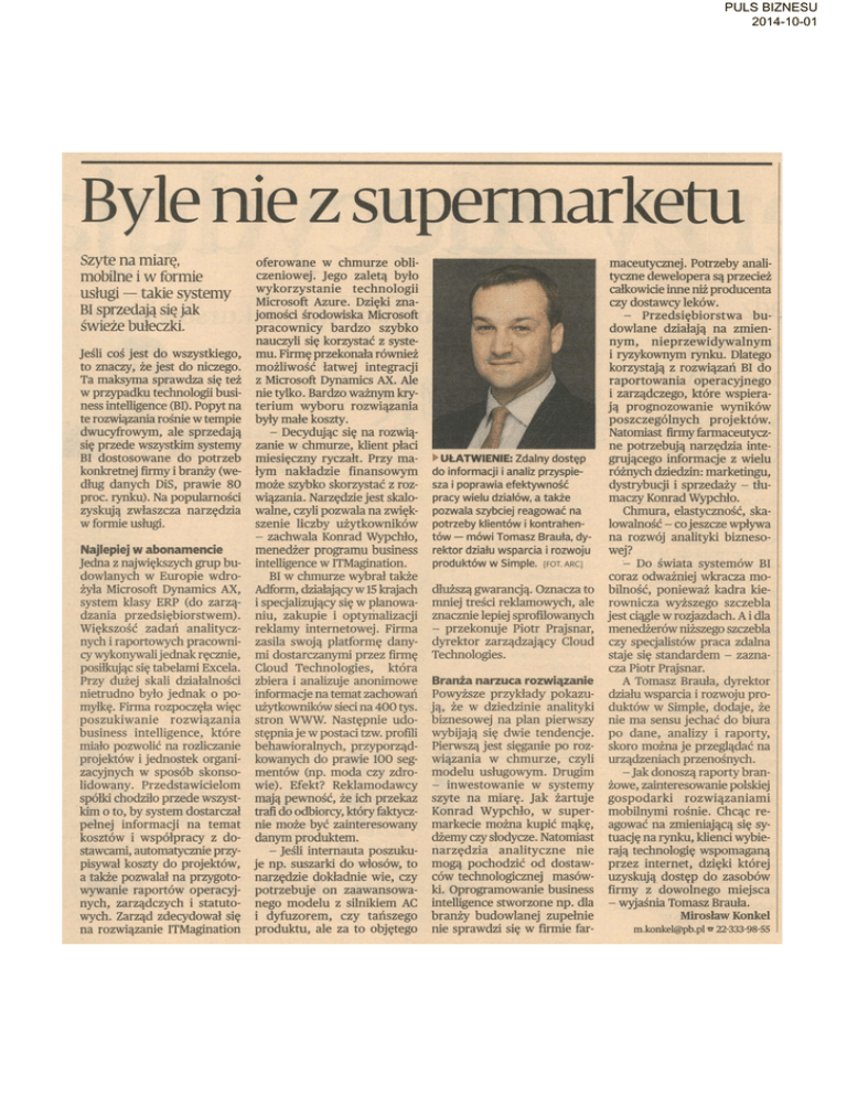 PULS BIZNESU 2014-10-01 Byle nie z supermarketu Szyte na miarę, mobilne i w formie usługi — takie systemy BI sprzedają się jak świeże bułeczki. Jeśli coś jest do wszystkiego, to znaczy, że jest do niczego. Ta maksyma sprawdza się też w przypadku technologii busi ness intelligence (BI). Popyt na te rozwiązania rośnie w tempie dwucyfrowym, ale sprzedają się przede wszystkim systemy BI dostosowane do potrzeb konkretnej firmy ibranży (we dług danych DiS, prawie 80 proc. rynku). Na popularności zyskują zwłaszcza narzędzia w formie usługi. Najlepiej w abonamencie Jedna z największych grup bu dowlanych w Europie wdro żyła Microsoft Dynamics AX, system klasy ERP (do zarzą dzania przedsiębiorstwem). Większość zadań analitycz nych iraportowych pracowni cy wykonywali jednak ręcznie, posiłkując się tabelami Excela. Przy dużej skali działalności nietrudno było jednak o po myłkę. Firma rozpoczęła więc poszukiwanie rozwiązania business intelligence, które miało pozwolić na rozliczanie projektów i jednostek organi zacyjnych w sposób skonso lidowany. Przedstawicielom spółki chodziło przede wszyst kim o to, by system dostarczał pełnej informacji na temat kosztów i współpracy z do stawcami, automatycznie przy pisywał koszty do projektów, a także pozwalał na przygoto wywanie raportów operacyj nych, zarządczych i statuto wych. Zarząd zdecydował się na rozwiązanie ITMagination oferowane w chmurze obli czeniowej. Jego zaletą było wykorzystanie technologii Microsoft Azure. Dzięki zna jomości środowiska Microsoft pracownicy bardzo szybko nauczyli się korzystać z syste mu. Firmę przekonała również możliwość łatwej integracji z Microsoft Dynamics AX. Ale nie tylko. Bardzo ważnymkry terium wyboru rozwiązania były małe koszty. - Decydując się na rozwią zanie w chmurze, klient płaci miesięczny ryczałt. Przy ma łym nakładzie finansowym może szybko skorzystać z roz wiązania. Narzędzie jest skalowalne, czyli pozwala na zwięk szenie liczby użytkowników - zachwala Konrad Wypchło, menedżer programu business intelligence w ITMagination. BI w chmurze wybrał także Adform, działający w 15 krajach i specjalizujący się w planowa niu, zakupie i optymalizacji reklamy internetowej. Firma zasila swoją platformę dany mi dostarczanymi przez firmę Cloud Technologies, która zbiera i analizuje anonimowe informacje na temat zachowań użytkowników sieci na 400 tys. stron WWW. Następnie udo stępnia je w postaci tzw.profili behawioralnych, przyporząd kowanych do prawie 100 seg mentów (np. moda czy zdro wie). Efekt? Reklamodawcy mają pewność, że ich przekaz trafi do odbiorcy, który faktycz nie może być zainteresowany danym produktem. - Jeśli internauta poszuku je np. suszarki do włosów, to narzędzie dokładnie wie, czy potrzebuje on zaawansowa nego modelu z silnikiem AC i dyfuzorem, czy tańszego produktu, ale za to objętego maceutycznej. Potrzeby anali tyczne dewelopera są przecież całkowicie inne niż producenta czy dostawcy leków. - Przedsiębiorstwa bu dowlane działają na zmien nym, nieprzewidywalnym i ryzykownym rynku. Dlatego korzystają z rozwiązań BI do raportowania operacyjnego i zarządczego, które wspiera ją prognozowanie wyników poszczególnych projektów. Natomiast firmy farmaceutycz ne potrzebują narzędzia inte • UŁATWIENIE: Zdalny dostęp grującego informacje z wielu do informacji i analiz przyspie różnych dziedzin: marketingu, sza i poprawia efektywność dystrybucji i sprzedaży - tłu pracy wielu działów, a także maczy Konrad Wypchło. pozwala szybciej reagować na Chmura, elastyczność, skapotrzeby klientów i kontrahen lowalność -co jeszcze wpływa tów — mówi Tomasz Brauła, dy na rozwój analityki bizneso rektor działu wsparcia i rozwoju wej? produktów w Simple. [FOT. ARC] - Do świata systemów BI coraz odważniej wkracza mo dłuższą gwarancją. Oznacza to bilność, ponieważ kadra kie mniej treści reklamowych, ale rownicza wyższego szczebla znacznie lepiej sprofilowanych jest ciągle w rozjazdach. Ai dla - przekonuje Piotr Prajsnar, menedżerów niższego szczebla dyrektor zarządzający Cloud czy specjalistów praca zdalna Technologies. staje się standardem - zazna cza Piotr Prajsnar. Branża narzuca rozwiązanie A Tomasz Brauła, dyrektor Powyższe przykłady pokazu działu wsparcia i rozwoju pro ją, że w dziedzinie analityki duktów w Simple, dodaje, że biznesowej na plan pierwszy nie ma sensu jechać do biura wybijają się dwie tendencje. po dane, analizy i raporty, Pierwszą jest sięganie po roz skoro można je przeglądać na wiązania w chmurze, czyli urządzeniach przenośnych. modelu usługowym. Drugim - Jak donoszą raporty bran - inwestowanie w systemy żowe, zainteresowanie polskiej szyte na miarę. Jak żartuje gospodarki rozwiązaniami Konrad Wypchło, w super mobilnymi rośnie. Chcąc re markecie można kupić mąkę, agować na zmieniającą się sy dżemy czy słodycze. Natomiast tuację na rynku, klienci wybie narzędzia analityczne nie rają technologię wspomaganą mogą pochodzić od dostaw przez internet, dzięki której ców technologicznej masów uzyskują dostęp do zasobów ki. Oprogramowanie business firmy z dowolnego miejsca intelligence stworzone np. dla - wyjaśnia Tomasz Brauła. Mirosław Konkel branży budowlanej zupełnie [email protected]» 22-333-98-55 nie sprawdzi się w firmie far