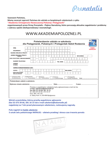 Szanowni Państwo, Mamy zaszczyt zaprosić Państwa do udziału w bezpłatnych szkoleniach z cyklu "Akademia Umiejętności Nowoczesnej Położnej i Pielęgniarki" organizowanych przez firmę Prenatalis - Piękne Narodziny, które poruszają aktualne zagadnienia i problemy z zakresu opieki okołoporodowej i neonatologii. WWW.AKADEMIAPOLOZNEJ.PL Potwierdzenie udziału w szkoleniu dla Pielęgniarek, Położnych i Prelegentek Szkół Rodzenia IMIĘ NAZWISKO NAZWA MIEJSCA PRACY: ADRES MIEJSCA PRACY: ULICA NR DOMU KOD POCZTOWY, MIEJSCOWOŚĆ NUMER TELEFONU ADRES E-MAIL TEL KOM. ........................................................................................................................................................................... ADRES KORESPONDENCYJNY: ULICA NR DOMU KOD POCZTOWY MIEJSCOWOŚĆ Położna POZ środowiskowa Pielęgniarka z o. noworodków Położna z o. noworodków Położna z o.położniczego Prelegentka Szkoły Rodzenia Inne ......................................... Potwierdzam udział w szkoleniu Wybrane miasto szkolenia:.................................................... Data.................................... Podpis ........................................ Prosimy o wypełnienie i odesłanie karty zgłoszeniowej e-mail lub fax e-mail: [email protected] fax (52) 373 39 66, 581 16 15 tel. (52) 373 24 92, 373 43 37 kom. 887 118 118 ul. Stary Port 13, 85-068 Bydgoszcz Wśród uczestników, którzy prześlą wypełnione zgłoszenie (fax 52-373 39 66, 581 16 15 lub e-mail [email protected]) najpóźniej na 7 dni przed planowanym szkoleniem, rozlosujemy nagrody. Pula nagród na każde szkolenie: 3 sztuki żelu położniczego NATALIS1 - ułatwia przebieg i skraca czas trwania porodu