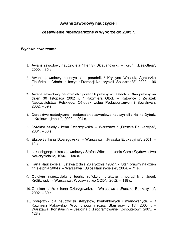 Awans zawodowy nauczycieli Zestawienie bibliograficzne w wyborze do 2005 r. Wydawnictwa zwarte : 1. Awans zawodowy nauczyciela / Henryk Składanowski. – Toruń : „Bea-Bleja”, 2000. – 35 s. 2. Awans zawodowy nauczyciela : poradnik / Krystyna Wasiluk, Agnieszka Zielińska. – Gdańsk : Instytut Promocji Nauczycieli „Solidarność”, 2000. – 96 s. 3. Awans zawodowy nauczycieli : poradnik prawny w hasłach. - Stan prawny na dzień 30 listopada 2002 r. / Kazimierz Głód. – Katowice : Związek Nauczycielstwa Polskiego. Ośrodek Usług Pedagogicznych i Socjalnych, 2002. – 89 s. 4. Doradztwo metodyczne i doskonalenie zawodowe nauczycieli / Halina Dybek. – Kraków : „Impuls”, 2000. – 204 s. 5. Dyrektor szkoły / Irena Dzierzgowska. – Warszawa : „Fraszka Edukacyjna”, 2001. – 36 s. 6. Ekspert / Irena Dzierzgowska. – Warszawa : „Fraszka Edukacyjna”, 2001. – 31 s. 7. Jak osiągnąć sukces zawodowy / Stefan Witek. – Jelenia Góra : Wydawnictwo Nauczycielskie, 1999. – 180 s. 8. Karta Nauczyciela : ustawa z dnia 26 stycznia 1982 r. - Stan prawny na dzieñ 11 sierpnia 2004 r. – Warszawa : „Głos Nauczycielski”, 2004. – 71 s. 9. Opiekun nauczyciela : teoria, refleksja, praktyka : poradnik / Jacek Królikowski. – Warszawa : Wydawnictwo CODN, 2002. – 189 s. 10. Opiekun stażu / Irena Dzierzgowska. – Warszawa : „Fraszka Edukacyjna”, 2002. – 39 s. 11. Podręcznik dla nauczycieli stażystów, kontraktowych i mianowanych. - / Kazimierz Makowski.- Wyd. 5 popr. i rozsz. Stan prawny 1VII 2005 r. – Warszawa, Konstancin – Jeziorna : „Programowanie Komputerów”, 2005. – 128 s. 12. Podstawy prawne awansu zawodowego po zmianach : stan prawny 8 grudnia 2004 r. / Dariusz Dwojewski. – Katowice : Zwi±zek Nauczycielstwa Polskiego. Ośrodek Usług Pedagogicznych i Socjalnych, 2005. – 59 s. 13. Przygotowanie dokumentacji do awansu : poradnik dla nauczycieli / Irena Dzierzgowska. – Warszawa : „Fraszka Edukacyjna”, 2003. – 40 s. 14. Rozwój i awans zawodowy nauczyciela czyli jak uzyskaæ stopieñ nauczyciela kontraktowego, mianowanego i dyplomowanego : poradnik dla nauczycieli i dyrektorów szkół oraz pracowników organów prowadzących i nadzorujących szkoły / Józef Pielachowski. – Wyd. 5. - Poznañ : „eMPi²”, 2005. – 110 s. 15. Rozwój zawodowy nauczyciela / Christopher Day. – Gdańsk : Gdańskie Wydawnictwo Psychologiczne, 2004. – 334 s. 16. Samoaktualizacja w teorii i praktyce kształcenia nauczycieli / Janina Janowska. – Lublin : Wydawnictwo Uniwersytetu Marii Curie-Skłodowskiej, 2000. – 177 s. 17. Stopnie awansu zawodowego nauczyciela : dokumenty, komentarze, plan rozwoju zawodowego – wzory pism. – Lublin : Akademicka Oficyna Wydawnicza, 2000. – 131 s. 18. Uczymy się nauczaæ / Richard I. Arends. - Wyd. 3 zm. – Warszawa : Wydawnictwa Szkolne i Pedagogiczne, 1994. – 531 s. 19. Wykorzystanie technologii komputerowej do przygotowania dokumentacji na stopień awansu zawodowego / Mariola Dąbek-Nagacz, Mirosław Kowalczyk. – Katowice : Zwiazek Nauczycielstwa Polskiego. Ośrodek Usług Pedagogicznych i Socjalnych, 2002. – 67 s. 20. Zmiany w dokumentacji na stopnie awansu zawodowego nauczycieli / Henryka Stachańczyk. – Katowice : Związek Nauczycielstwa Polskiego. Ośrodek Usług Pedagogicznych i Socjologicznych, 2005. – 62 s. Artykuły z czasopism : 21. Autoprezentacja / Marek Kazimierowicz // Nowa Szkoła. – 2003, nr 3, s. 19-21 22. Awans – fikcja czy rzeczywistość / Leszek Pawelski // Nowe w Szkole. – 2004, nr 3, s. 20-22 23. Awans nauczycieli w zreformowanej szkole / Leszek Pawelski // Nowa Szkoła. – 2001, nr 1, s. 11-13 24. Awansowanie (1) / Teresa Konarska // Głos Nauczycielski. – 2004, nr 27, s. IIV / wkładka / 25. Awansowanie (2) / Teresa Konarska // Głos Nauczycielski. – 2004, nr 28, s. IIV / wkładka / 26. Awans zawodowy – jakość pracy nauczyciela / Marek Kazimierowicz // Nowa Szkoła. – 2001, nr 5, s. 50-52 26. Awans zawodowy nauczyciela po nowemu : zmiany w przepisach dotyczących awansu zawodowego / Dorota Strzelecka, Krystyna RatyńskaOlechnowska // Biblioteka w Szkole. – 2005, nr 2, s. 2-4 28. Awans zawodowy nauczyciela. Słownik niektórych terminów i pojêæ / Halina Ogonowska, Dorota Ozimek // Biblioteka w Szkole. – 2003, nr 9, s. 36-37 29. Awans zawodowy nauczycieli. Zestawienie bibliograficzne w wyborze / Elżbieta Gucwa // Biblioteka w Szkole. – 2002, nr 11 s. 26-27 30. Awans zawodowy. Wybór artykułów opublikowanych na łamach „Biblioteki w Szkole” / Grażyna Piątkowska // Biblioteka w Szkole. – 2005, nr 5, s. 15 31. Awansowanie nauczycieli w nowym systemie edukacji – refleksje, praktyka / Andrzej Afgański // Wychowanie na co Dzień. – 2003, nr 9, s. 6-9 32. Byłam opiekunem stażu nauczyciela bibliotekarza / Grażyna Sarna // Biblioteka w Szkole. – 2003, nr 4, s. 8 33. Czy awansować?... / Kamila Palińska // Wychowanie Muzyczne w Szkole. – 2001, nr 2, s. 78-82 34. Czynniki rozwoju zawodowego nauczyciela / Jarosław Michalski // Nowa Szkoła. – 2002, nr 8, s. 53 35. Czytam więc jestem ... nauczycielem – miejsce czytelnictwa w systemie doskonalenia zawodowego nauczycieli / Ewa Murawska // Edukacja, Studia, Badania Innowacje. – 2004, nr 1, s. 78-85 36. Dasz radę // Głos Nauczycielski. – 2005, nr 3, s. 12 37. Doskonalenie zawodowe pod szczególnym nadzorem / Marek Kazimierowicz // Nowa Szkoła. – 2005, nr 7, s. 8-12 38. Dyplom po raz drugi / Irena Iwanicka // Nowa Szkoła. – 2001, nr 1, s. 21-23 39. Ekspert w awansie zawodowym nauczyciela / Jarosław Milczarek // Nowa Szkoła. – 2001, nr 2, s. 61 40. Indywidualny plan rozwoju zawodowego / Marek Misztal // Nowa Szkola. – 2001, nr 1, s. 24-25 41. Jakościowe zmiany w systemie awansu zawodowego / Nowa Szkoła. – 2005, nr 6, s. 4-7 42. Kamień pingwina / Szczepan Barański / Nowa Szkoła. – 2001, nr 3, s. 29-30 43. Konstruowanie planu rozwoju zawodowego nauczyc