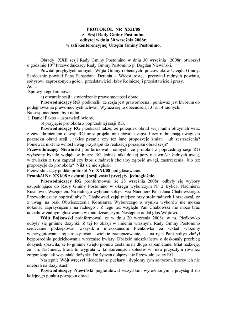 PROTOKÓŁ NR XXII/08 z Sesji Rady Gminy Postomino odbytej w dniu 30 września 2008r. w sali konferencyjnej Urzędu Gminy Postomino. Obrady XXII sesji Rady Gminy Postomino w dniu 30 września 2008r. otworzył o godzinie 1000 Przewodniczący Rady Gminy Postomino p. Bogdan Niewiński. Powitał przybyłych radnych, Wójta Gminy i obecnych pracowników Urzędu Gminy. Serdecznie powitał Pana Sebastiana Derenia – Wicestarostę, przywitał radnych powiatu, sołtysów, zaproszonych gości, przedstawicieli Izby Rolniczej i przedstawicieli prasy. Ad. 1 Sprawy regulaminowe: a) otwarcie sesji i stwierdzenie prawomocności obrad. Przewodniczący RG podkreślił, że sesja jest prawomocna , ponieważ jest kworum do podejmowania prawomocnych uchwał. Wyraża się to obecnością 13 na 14 radnych. Na sesji nieobecni byli radni : 1. Daniel Pakos – usprawiedliwiony. b) przyjęcie protokołu z poprzedniej sesji RG. Przewodniczący RG przekazał także, że porządek obrad sesji radni otrzymali wraz z zawiadomieniem o sesji RG oraz projektami uchwał i zapytał czy radni mają uwagi do porządku obrad sesji , jakieś pytania czy też inne propozycje zmian lub zastrzeżenia? Ponieważ nikt nie wniósł uwag przystąpił do realizacji porządku obrad sesji? Przewodniczący Niewiński poinformował radnych, że protokół z poprzedniej sesji RG wyłożony był do wglądu w biurze RG jednak nikt do tej pory nie wniósł żadnych uwag, w związku z tym zapytał czy ktoś z radnych chciałby zgłosić uwagi, zastrzeżenia lub też propozycje do protokołu? Nikt się nie zgłosił. Przewodniczący poddał protokół Nr XXI/08 pod głosowanie. Protokół Nr XXI/08 z ostatniej sesji został przyjęty jednogłośnie. Przewodniczący RG poinformował, że 28 września 2008r. odbyły się wybory uzupełniające do Rady Gminy Postomino w okręgu wyborczym Nr 2 Bylica, Naćmierz, Rusinowo, Wszędzień. Na radnego wybrano sołtysa wsi Naćmierz Pana Jana Chabowskiego. Przewodniczący poprosił aby P. Chabowski zajął miejsce przy stole radnych i przekazał, że z uwagi na brak Obwieszczenia Komisarza Wyborczego o wyniku wyborów nie można dokonać zaprzysiężenia na radnego . Z tego też względu Pan Chabowski nie może brać udziału w żadnym głosowaniu w dniu dzisiejszym. Następnie oddał głos Wójtowi. Wójt Bojkowski poinformował, że w dniu 20 września 2008r. w m. Pieńkówko odbyły się gminne dożynki. Z tej to okazji w imieniu własnym, Rady Gminy Postomino serdecznie podziękował wszystkim mieszkańcom Pieńkówka za wkład włożony w przygotowanie tej uroczystości i wielkie zaangażowanie, a na ręce Pani sołtys złożył bezpośrednio podziękowania wręczając kwiaty. Dbałość mieszkańców o doskonały przebieg dożynek sprawiła, że to gminne święto plonów zostanie na długo zapamiętane. Miał nadzieję, że m. Naćmierz, która to wygrała w konkurencjach sołectw w roku przyszłym również zorganizuje tak wspaniałe dożynki. Do życzeń dołączył się Przewodniczący RG. Następnie Wójt wręczył nieodebrane puchary i dyplomy tym sołtysom, którzy ich nie odebrali na dożynkach. Przewodniczący Niewiński pogratulował wszystkim wyróżnionym i przystąpił do kolejnego punktu porządku obrad. 2 Ad. 2 Wolna Trybuna. Sołtys Pieńkówka – A. Rój zgłosiła o wprowadzenie ograniczenia prędkości na drodze z Tynia do Pieńkówka, ponieważ kierowca autobusu z MORPOLU jeździ tak szybko, że przyczynia się do dewastacji drogi. Sołtys z Pieszcza P. Morka – stwierdził, że „za błędu u góry płacimy na dole”, ponieważ w latach 2006/2007 uregulowano koryto rzeki Moszczenicki przy regulacji zbudowano 3 mosty w Pieszczu. Te trzy mosty na dzień dzisiejszy nie spełniają żadnej roli, bowiem przed każdym z mostów stoi znak ograniczający nośność mostu. Żeby przejechać na pole obecnym ciągnikiem rolnym trzeba w Pieszczu objechać wieś o 2 km, bo na most wjechać nie można. Ciągniki te nawożą z pól błoto na drogi. Pobocze przy jednej drodze zostało zaniżone do 1/2m i zarywany jest bruk przez ciągniki. Natomiast jak mieszkańcy Pieszcza zrobili sobie kładkę do przejścia to P. Inspektor przysłała pismo o dokonaniu samowoli i zamiarze nałożenia kary w wysokości 125.000zł, co może potwierdzić P. Wójt, P. Kocbus. Nie rozumie jak zostały zaplanowane mosty, które są do niczego nie przydatne, nie spełniają żadnych warunków a można po nich przejechać tylko rowerem ewentualnie małym samochodem. Uważał, że coś z tym należałoby zrobić. Gdyby zrobić jeden most porządny to użytkownik z bazy w Pieszczu na pole ma tylko 100m do przejechania i nie korzystałby z dróg. Radna Krakowska skierowała swoją wypowiedź do Pana Wicestarosty i przekazała, że rzeka Klasztorna w Łącku przechodziła renowację i była odmulana. W roku ubiegłym odmulany był kanał Świdnik, który obecnie jest zarośnięty. Uważała, że działania te prowadzone były na jeden sezon. Przez rok wszystko tak zarosło, że w kanale rosną bazie. Jej zdaniem ktoś powinien to regulować a jest przecież Zarząd Melioracji przy Starostwie Powiatowym i powinien się tym zajmować na bieżąco. Dawniej była to osoba, która na bieżąco zajmowała się kanałem lub rzeką. Obecnie nic się w tym temacie nie robi. Wielokrotnie zwracała się w sprawie rzeki Klasztornej, która zalewa łąki. Zapytała kiedy rzeka Klasztorna będzie odmulona i kiedy kanał Świdnik będzie oczyszczony? Następnie upomniała się o dyplom, ponieważ wieś Łącko w STRONG MAN zajęła I miejsce. Sołtys z Postomina P. Sieradzki – stwierdził, że pojazdy są coraz większe i cięższe i nawiązał do remontu mostu pomiędzy Postominem a Marszewem. Zapytał czy po moście będą dalej jeździły ciężkie pojazdy wojskowe i czy wojsko dokłada środki finansowe do remontu mostu? Czy to w dalszym ciągu idzie z pieniędzy i podatków gminy? Uważał, że cyt.: „Nasza Gmina znowu zo