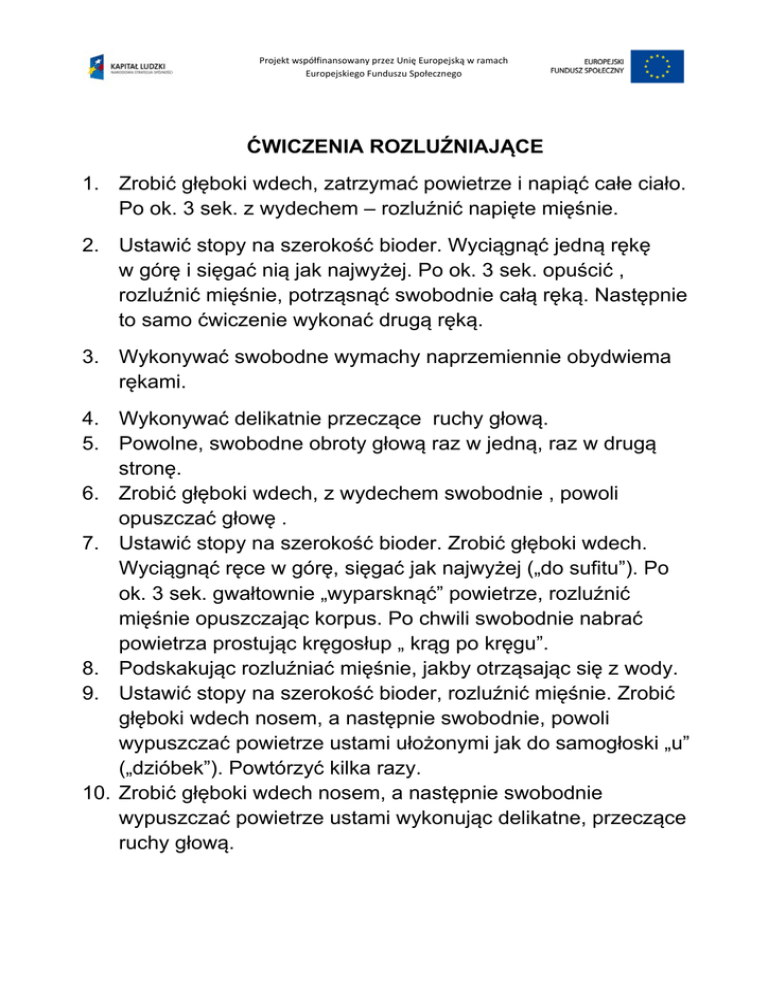 Projekt współfinansowany przez Unię Europejską w ramach Europejskiego Funduszu Społecznego ĆWICZENIA ROZLUŹNIAJĄCE 1. Zrobić głęboki wdech, zatrzymać powietrze i napiąć całe ciało. Po ok. 3 sek. z wydechem – rozluźnić napięte mięśnie. 2. Ustawić stopy na szerokość bioder. Wyciągnąć jedną rękę w górę i sięgać nią jak najwyżej. Po ok. 3 sek. opuścić , rozluźnić mięśnie, potrząsnąć swobodnie całą ręką. Następnie to samo ćwiczenie wykonać drugą ręką. 3. Wykonywać swobodne wymachy naprzemiennie obydwiema rękami. 4. Wykonywać delikatnie przeczące ruchy głową. 5. Powolne, swobodne obroty głową raz w jedną, raz w drugą stronę. 6. Zrobić głęboki wdech, z wydechem swobodnie , powoli opuszczać głowę . 7. Ustawić stopy na szerokość bioder. Zrobić głęboki wdech. Wyciągnąć ręce w górę, sięgać jak najwyżej („do sufitu”). Po ok. 3 sek. gwałtownie „wyparsknąć” powietrze, rozluźnić mięśnie opuszczając korpus. Po chwili swobodnie nabrać powietrza prostując kręgosłup „ krąg po kręgu”. 8. Podskakując rozluźniać mięśnie, jakby otrząsając się z wody. 9. Ustawić stopy na szerokość bioder, rozluźnić mięśnie. Zrobić głęboki wdech nosem, a następnie swobodnie, powoli wypuszczać powietrze ustami ułożonymi jak do samogłoski „u” („dzióbek”). Powtórzyć kilka razy. 10. Zrobić głęboki wdech nosem, a następnie swobodnie wypuszczać powietrze ustami wykonując delikatne, przeczące ruchy głową.