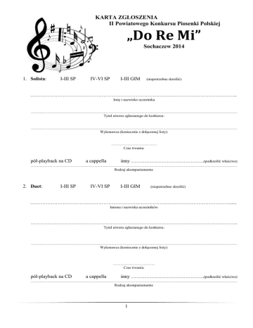 KARTA ZGŁOSZENIA II Powiatowego Konkursu Piosenki Polskiej „Do Re Mi” Sochaczew 2014 1. Solista: I-III SP IV-VI SP I-III GIM (niepotrzebne skreślić) ………………………………………………………………………………………………………….. Imię i nazwisko uczestnika ……………………………………………………………………………………………………………………………………………… Tytuł utworu zgłaszanego do konkursu: ……………………………………………………………………………………………………………………………………………… Wykonawca (koniecznie z dołączonej listy): ……………………………… Czas trwania: pół-playback na CD a cappella inny …………………………………….(podkreślić właściwe) ……………………………………………………………………………………………………………………………………………… Rodzaj akompaniamentu: 2. Duet: I-III SP IV-VI SP I-III GIM (niepotrzebne skreślić) ………………………………………………………………………………………………………...... Imiona i nazwiska uczestników ………………………………………………………………………………………………………….. Tytuł utworu zgłaszanego do konkursu: ……………………………………………………………………………………………………………………………………………… Wykonawca (koniecznie z dołączonej listy): …………………………… Czas trwania: pół-playback na CD a cappella inny …………………………………….(podkreślić właściwe) ……………………………………………………………………………………………………………………………………………… Rodzaj akompaniamentu: 1 3. Imię i nazwisko opiekuna/instruktora wraz z numerem telefonu (nr tel. ułatwi nam komunikowanie się w razie potrzeby): 4. Nazwa placówki delegującej (adres, e-mail, nr tel.): Wyrażam zgodę na bezpłatną rejestrację mojego występu przez media współpracujące z Organizatorem oraz na korzystanie przez Organizatora z w/w materiałów jako materiałów wyłącznie reklamowych i dokumentacyjnych. W związku z powyższym nie wnoszę żadnych roszczeń finansowych. …………………………………………………..….……………………… Podpis zgłaszającego/pieczęć instytucji delegującej 2