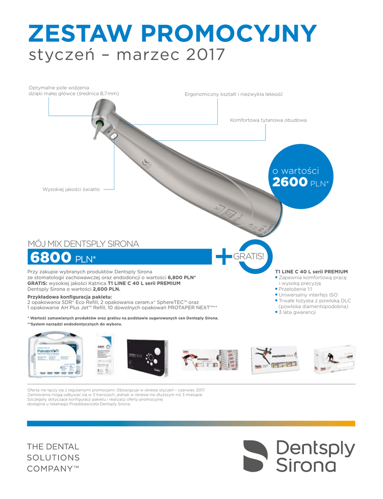 ZESTAW PROMOCYJNY styczeń – marzec 2017 Optymalne pole widzenia dzięki małej główce (średnica 8,7 mm) Ergonomiczny kształt i niezwykła lekkość Komfortowa tytanowa obudowa o wartości 2600 PLN* Wysokiej jakości światło MÓJ MIX DENTSPLY SIRONA 6800 PLN* Przy zakupie wybranych produktów Dentsply Sirona ze stomatologii zachowawczej oraz endodoncji o wartości 6,800 PLN* GRATIS: wysokiej jakości Kątnica T1 LINE C 40 L serii PREMIUM Dentsply Sirona o wartości 2,600 PLN. Przykładowa konfiguracja pakietu: 2 opakowania SDR® Eco Refill, 2 opakowania ceram.x® SphereTEC™ oraz 1 opakowanie AH Plus Jet™ Refill, 10 dowolnych opakowań PROTAPER NEXT™** * Wartość zamawianych produktów oraz gratisu na podstawie sugerowanych cen Dentsply Sirona. **System narzędzi endodontycznych do wyboru. Oferta nie łączy się z regularnymi promocjami. Obowiązuje w okresie styczeń – czerwiec 2017. Zamówienia mogą odbywać się w 3 transzach, jednak w okresie nie dłuższym niż 3 miesiące. Szczegóły dotyczące konfiguracji pakietu i realizacji oferty promocyjnej dostępne u lokalnego Przedstawiciela Dentsply Sirona. GRATIS! T1 LINE C 40 L serii PREMIUM Zapewnia komfortową pracę i wysoką precyzję Przełożenie 1:1 Uniwersalny interfejs ISO Trwałe łożyska z powłoką DLC (powłoka diamentopodobna) 3 lata gwarancji 40 PROTAPER GOLD™ PROTAPER NEXT™ Blistrów 9 990 PLN LUB Przy zakupie 40 dowolnych opakowań PROTAPER GOLD™ (1 opakowanie = 6 pilników) oraz 10 opakowań PROGLIDER™ (1 opakowanie = 3 pilniki) o wartości 9 990 PLN* GRATIS: mikrosilnik X-Smart™ Plus o wartości 4 000 PLN* 10 Blistrów 9 990 PLN Przy zakupie 50 dowolnych opakowań PROTAPER NEXT™ (1 opakowanie = 3 pilniki) oraz 10 opakowań PROGLIDER™ (1 opakowanie = 3 pilniki) o wartości 9 990 PLN* GRATIS: mikrosilnik X-Smart™ Plus o wartości 4 000 PLN* o wartości GRATIS! 50 Blistrów 4000 PLN* 10 Blistrów o wartości GRATIS! 4000 PLN* * Wartość zamawianych produktów oraz gratisu na podstawie sugerowanych cen Dentsply Sirona. PROTAPER GOLD™ Następca systemu narzędzi PROTAPER® UNIVERSAL 675 PLN GRATIS! Przy zakupie 3 dowolnych opakowań PROTAPER GOLD™ (1 opakowanie = 6 pilników) GRATIS: 2 opakowania narzędzi ręcznych K-File rozm. 10, K-File asortyment rozm. 15-40 (1 opakowanie = 6 pilników) oraz jedno opakowanie asortymentu C+Files (1 opakowanie = 6 pilników) PROTAPER NEXT™ Zaawansowany system narzędzi rotacyjnych 570 PLN GRATIS! Przy zakupie 3 dowolnych opakowań PROTAPER NEXT™ (1 opakowanie = 3 pilniki) GRATIS: 1 opakowanie kalibrowanych ćwieków gutaperkowych i sączków papierowych WaveOne® Gold Jednopilnikowy system narzędzi recyprokalnych 606 PLN GRATIS! Przy zakupie 3 dowolnych opakowań WaveOne® Gold (1 opakowanie = 3 pilniki) GRATIS: 1 opakowanie PROGLIDER™ (1 opakowanie = 3 pilniki) Oferta promocyjna dostępna poprzez dystrybutorów firmy Dentsply Sirona. Materiały gratisowe są przesyłane z biura Dentsply Sirona w momencie wystawienia oraz dosłania przez dystrybutora faktury sprzedaży dot. zakupu produktów wchodzących w skład promocji. Informacje szczegółowe oraz zamówienia u przedstawicieli Dentsply Sirona. Przelicznik według kursu 1 euro=4,45 PLN. Oferta ważna w okresie: od 1 stycznia do 31 marca 2017 r. lub do wyczerpania zapasów. Ze względu na dostępność materiałów gratisowych realizacja promocji jest gwarantowana dla faktury przesłanej nie później niż 2 tygodnie od dnia jej wystawienia. SDR® 742 PLN GRATIS! Przy zakupie opakowania SDR® Eco Refill z 50 kompiulami GRATIS: 1 opakowanie SDR® z 10 kompiulami ceram.x® SphereTEC™ 625 PLN GRATIS! Zestaw wprowadzający ceram.x® SphereTEC™ zawiera 5 strzykawek po 3 g każda w odcieniach: A1; A2; A3; A3,5; A4 oraz samotrawiący system wiążący P&B One Select 3,5 ml. Do opakowania dołączona jest dodatkowa strzykawka w kolorze A2 (3 g) oraz GRATIS: 1 opakowanie SDR® z 4 kompiulami ceram.x® SphereTEC™ 420 PLN GRATIS! Przy zakupie 3 dowolnych strzykawek ceram.x® SphereTEC™ GRATIS: strzykawka w kolorze A2 (3 g) Palodent® V3 Intro Kit GRATIS! 1485 PLN Przy zakupie zestawu Palodent® V3 Intro Kit zawierającego 2 pierścienie, 100 szt. formówek, 75 szt. klinów, 30 szt. klinów ochronnych, kleszcze, pęsetę GRATIS: 1 uniwersalny pierścień oraz opakowanie klinów ochronnych (50 szt.) w średnim rozmiarze (medium) GRATIS! Palodent® V3 formówki 534 PLN Przy zakupie 3 opakowań formówek Palodent® V3 w dowolnym rozmiarze GRATIS: 1 opakowanie klinów ochronnych (50 szt.) w średnim rozmiarze (medium) Niniejsza gazetka ma charakter informacyjny i nie stanowi oferty handlowej w rozumieniu art. 66 Kodeksu Cywilnego. Firma Dentsply Sirona nie ponosi odpowiedzialności za błędy w publikacji. GRATIS! Aquasil™ Soft Putty 498 PLN GRATIS! Przy zakupie precyzyjnej masy wyciskowej Aquasil™ Soft Putty Standard Pack (2 x 450 ml) GRATIS: 2 naboje II warstwy (LV i XLV) po 50 ml każdy AH Plus Jet™ Refill 580 PLN GRATIS! Przy zakupie uszczelniacza kanałowego AH Plus Jet™ Refill (2 strzykawki po 15 g każda) GRATIS: 4 opakowania narzędzi ręcznych K-file w rozmiarach: 06; 08; 10; asortyment w rozm. 15-40 PRZEDSTAWICIEL DENTSPLY SIRONA Małgorzata Mrowińska Rejon północno-zachodni Szczecin, Koszalin, Gorzów Wlk., Piła +48 663 888 539 [email protected] Anna Łokuciewska Rejon pomorski Trójmiasto +48 663 888 512 [email protected] Monika Suchowierska Rejon północno-wschodni Białystok, Suwałki +48 663 888 606 [email protected] Anna Pałągiewicz-Gajoch Rejon kujawsko-pomorski Bydgoszcz, Toruń, Włocławek +48 721 140 021 [email protected] Katarzyna Piernikowska Rejon środkowo-zachodni Poznań, Zielona Góra +48 663 888 514 [email protected] Natalia Wiktorska Rejon centralny Łódź, Kielce +48 663 888 528 [email protected] Dominika Makowska Rejon mazowiecki Warszawa Płd, Radom +48 663 888 923 [email protected] Tomasz Skrabel Rejon śląski Bielsko-Biała, Rybnik, Gliwice +48