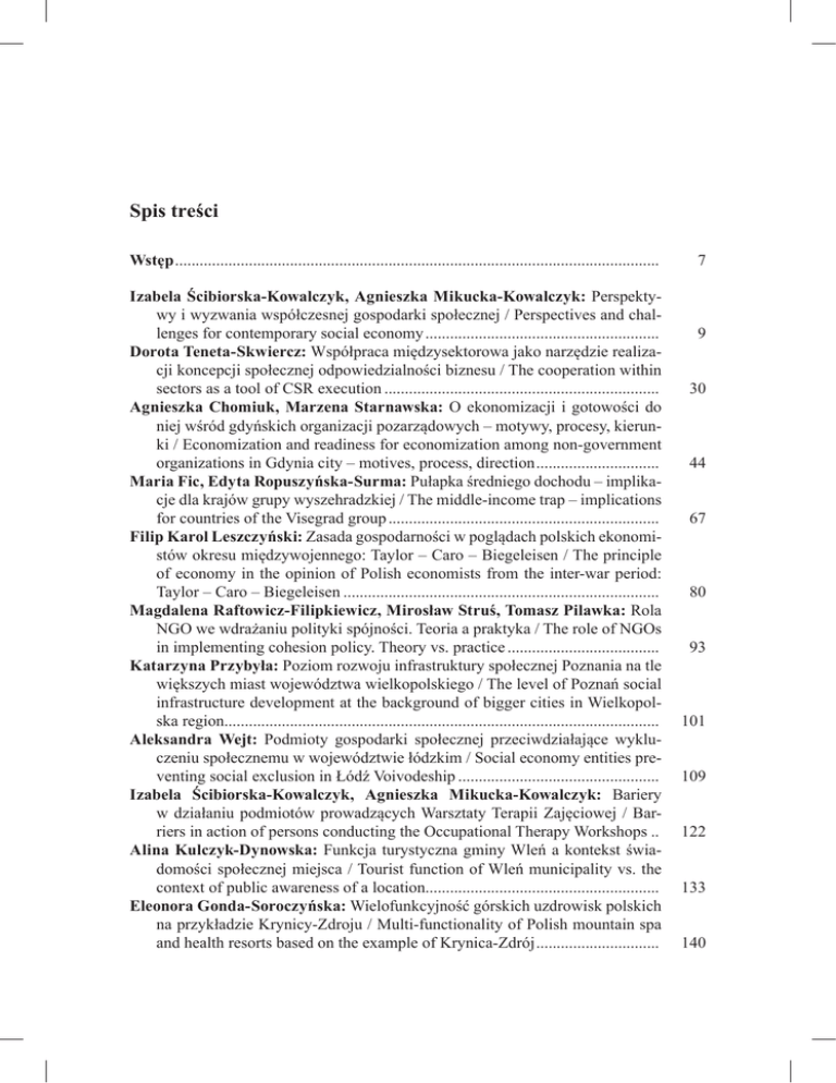 Spis treści Wstęp....................................................................................................................... 7 Izabela Ścibiorska-Kowalczyk, Agnieszka Mikucka-Kowalczyk: Perspektywy i wyzwania współczesnej gospodarki społecznej / Perspectives and challenges for contemporary social economy.......................................................... 9 Dorota Teneta-Skwiercz: Współpraca międzysektorowa jako narzędzie realizacji koncepcji społecznej odpowiedzialności biznesu / The cooperation within sectors as a tool of CSR execution.................................................................... 30 Agnieszka Chomiuk, Marzena Starnawska: O ekonomizacji i gotowości do niej wśród gdyńskich organizacji pozarządowych – motywy, procesy, kierunki / Economization and readiness for economization among non-government organizations in Gdynia city – motives, process, direction............................... 44 Maria Fic, Edyta Ropuszyńska-Surma: Pułapka średniego dochodu – implikacje dla krajów grupy wyszehradzkiej / The middle-income trap – implications for countries of the Visegrad group................................................................... 67 Filip Karol Leszczyński: Zasada gospodarności w poglądach polskich ekonomistów okresu międzywojennego: Taylor – Caro – Biegeleisen / The principle of economy in the opinion of Polish economists from the inter-war period: Taylor – Caro – Biegeleisen.............................................................................. 80 Magdalena Raftowicz-Filipkiewicz, Mirosław Struś, Tomasz Pilawka: Rola NGO we wdrażaniu polityki spójności. Teoria a praktyka / The role of NGOs in implementing cohesion policy. Theory vs. practice...................................... 93 Katarzyna Przybyła: Poziom rozwoju infrastruktury społecznej Poznania na tle większych miast województwa wielkopolskiego / The level of Poznań social infrastructure development at the background of bigger cities in Wielkopolska region.......................................................................................................... 101 Aleksandra Wejt: Podmioty gospodarki społecznej przeciwdziałające wykluczeniu społecznemu w województwie łódzkim / Social economy entities preventing social exclusion in Łódź Voivodeship.................................................. 109 Izabela Ścibiorska-Kowalczyk, Agnieszka Mikucka-Kowalczyk: Bariery w działaniu podmiotów prowadzących Warsztaty Terapii Zajęciowej / Barriers in action of persons conducting the Occupational Therapy Workshops... 122 Alina Kulczyk-Dynowska: Funkcja turystyczna gminy Wleń a kontekst świadomości społecznej miejsca / Tourist function of Wleń municipality vs. the context of public awareness of a location......................................................... 133 Eleonora Gonda-Soroczyńska: Wielofunkcyjność górskich uzdrowisk polskich na przykładzie Krynicy-Zdroju / Multi-functionality of Polish mountain spa and health resorts based on the example of Krynica-Zdrój............................... 140 Wstęp Mamy przyjemność oddać w ręce Czytelników kolejny tom Prac Naukowych wydawanych przez Uniwersytet Ekonomiczny we Wrocławiu, zatytułowany „Społeczne gospodarowanie”. W ostatnich latach obserwujemy rosnące zainteresowanie szeroko rozumianą problematyką społecznego gospodarowania, która jest przedmiotem badań ekonomistów, socjologów, prawników i teologów. Czym właściwie jest społeczne gospodarowanie? Trudne, a wręcz niemożliwe jest jednoznaczne sformułowanie jednej definicji. Artykuły zawarte w Pracach Naukowych UE stanowią próbę zaprezentowania dyskusji, jaka towarzyszy problematyce społecznego gospodarowania, oraz badań empirycznych będących próbą uwzględnienia różnorodności problemów, które ona obejmuje. Egzemplifikacją szeroko rozumianej koncepcji społecznego gospodarowania są podmioty gospodarki społecznej funkcjonujące w warunkach gospodarki rynkowej. Artykuł Izabeli Ścibiorskiej-Kowalczyk i Agnieszki Mikuckiej-Kowalczyk poświęcony jest perspektywom i wyzwaniom podmiotów trzeciego sektora. Autorki wskazują, że obecny stan instytucji nie sprzyja osiąganiu celów podmiotów gospodarki społecznej. Jest to niejako punkt wyjścia do interesujących rozważań dotyczących związków i różnych form współpracy między sektorami: prywatnym, publicznym i społecznym. Dorota Teneta-Skwiercz zauważa, że nie tylko z roku na rok rośnie liczba przedsiębiorstw, które angażują się w różne formy współpracy z sektorem publicznym i społecznym, lecz przede wszystkim udaje się rozwiązywać niektóre problemy społeczne oraz efektywniej wykorzystywać posiadane zasoby. W kolejnym artykule Agnieszka Chomiuk i Marzena Starnawska na podstawie badań empirycznych gdańskich organizacji pozarządowych podejmują próbę odpowiedzi na fundamentalne pytanie stawiane w kontekście działań III sektora. A mianowicie: Czy i w jaki sposób organizacje pozarządowe mogą budować swoją stabilność i niezależność finansową? Autorki wskazują, że jednym ze sposobów uniezależniania się podmiotów non-governmental organizations (NGO) od sektora publicznego jest tworzenie i rozwijanie przedsiębiorczości społecznej. Kolejny artykuł przynosi rozważania teoretyczne i analizę empiryczną danych statystycznych na temat „pułapki średniego dochodu” w państwach grupy wyszehradzkiej (V4). Maria Fic i Edyta Ropuszyńska-Surma omawiają czynniki sprzyjające oraz zapobiegające wpadnięciu w pułapkę średniego dochodu w Czechach, Polsce, Słowacji i na Węgrzech. W następnym interesującym artykule Filip Leszczyński przedstawia historyczne interpretacje zasady gospodarności. Analiza obejmuje okres międzywojenny, a Autor, przedstawiając różnice w interpretacji zasady gospodarności – Leopolda Caro, Edwarda Taylora oraz Leona Władysława Biegeleisena
