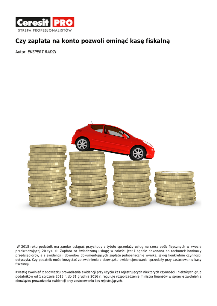 Czy zapłata na konto pozwoli ominąć kasę fiskalną Autor: EKSPERT RADZI W 2015 roku podatnik ma zamiar osiągać przychody z tytułu sprzedaży usług na rzecz osób fizycznych w kwocie przekraczającej 20 tys. zł. Zapłata za świadczoną usługę w całości jest i będzie dokonana na rachunek bankowy przedsiębiorcy, a z ewidencji i dowodów dokumentujących zapłatę jednoznacznie wynika, jakiej konkretnie czynności dotyczyła. Czy podatnik może korzystać ze zwolnienia z obowiązku ewidencjonowania sprzedaży przy zastosowaniu kasy fiskalnej? Kwestię zwolnień z obowiązku prowadzenia ewidencji przy użyciu kas rejestrujących niektórych czynności i niektórych grup podatników od 1 stycznia 2015 r. do 31 grudnia 2016 r. reguluje rozporządzenie ministra finansów w sprawie zwolnień z obowiązku prowadzenia ewidencji przy zastosowaniu kas rejestrujących. W rozporządzeniu tym ustawodawca przewidział dwa rodzaje zwolnień: ● ● dla określonych grup podatników (zwolnienie podmiotowe), dla konkretnych czynności (zwolnienie przedmiotowe). Z obowiązku ewidencjonowania w danym roku podatkowym, nie dłużej jednak niż do 31 grudnia 2016 r., zwolnieni są podatnicy, u których obrót zrealizowany na rzecz osób fizycznych nieprowadzących działalności gospodarczej oraz rolników ryczałtowych nie przekroczył w poprzednim roku podatkowym 20 tys. zł. A w przypadku podatników rozpoczynających w poprzednim roku podatkowym dostawę towarów lub świadczenie usług na rzecz osób fizycznych nieprowadzących działalności gospodarczej oraz rolników ryczałtowych, jeżeli obrót z tego tytułu nie przekroczył w proporcji do okresu wykonywania tych czynności w poprzednim roku podatkowym 20 tys. zł. Z obowiązku ewidencjonowania w danym roku podatkowym, nie dłużej jednak niż do 31 grudnia 2016 r., zwolnione są także czynności wymienione w załączniku do rozporządzenia. W części II tego załącznika znajduje się sprzedaż dotycząca szczególnych czynności. W poz. 38 znajduje się świadczenie usług na rzecz osób fizycznych nieprowadzących działalności gospodarczej oraz rolników ryczałtowych, jeżeli świadczący usługę otrzyma w całości zapłatę za wykonaną czynność za pośrednictwem poczty, banku lub spółdzielczej kasy oszczędnościowo-kredytowej (odpowiednio na rachunek bankowy podatnika lub na rachunek podatnika w spółdzielczej kasie oszczędnościowo-kredytowej, której jest członkiem), a z ewidencji i dowodów dokumentujących zapłatę jednoznacznie wynika, jakiej konkretnie czynności dotyczyła. W konsekwencji, aby podatnik mógł skorzystać ze zwolnienia z obowiązku ewidencjonowania obrotu przy zastosowaniu kasy na podstawie par. 2 ust. 1 rozporządzenia w powiązaniu z poz. 38 załącznika do rozporządzenia, muszą łącznie zostać spełnione następujące warunki: ● ● ● świadczący usługę otrzyma w całości zapłatę za wykonaną czynność za pośrednictwem poczty lub banku na rachunek bankowy podatnika; z ewidencji i dowodów dokumentujących zapłatę jednoznacznie wynika, jakiej konkretnie czynności dotyczyła; podatnik nie dokonuje dostaw towarów, ani nie świadczy usług określonych w par. 4 rozporządzenia. Brak spełnienia choć jednego z tych warunków pozbawi podatnika prawa do zwolnienia z obowiązku. Zatem przedsiębiorca świadcząc opisane usługi, za które otrzyma w całości zapłatę za pośrednictwem banku na rachunek bankowy, a z ewidencji i dowodów dokumentujących zapłatę jednoznacznie wynika, jakiej konkretnie czynności dotyczyła, będzie korzystał ze zwolnienia z obowiązku ewidencjonowania obrotu i kwot podatku należnego przy zastosowaniu kas rejestrujących do końca 2016 r. Takie stanowisko zaprezentował również dyrektor Izby Skarbowej w Katowicach w interpretacji z 17 kwietnia 2015 r., nr IBPP3/4512-105/15/KG. © 2013 Henkel Polska sp. z o.o.