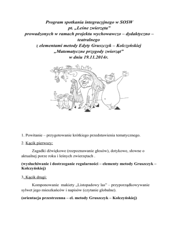 Program spotkania integracyjnego w SOSW pt. „Leśne zwierzęta” prowadzonych w ramach projektu wychowawczo – dydaktyczno – teatralnego z elementami metody Edyty Gruszczyk – Kolczyńskiej „Matematyczne przygody zwierząt” w dniu 19.11.2014r. 1. Powitanie – przygotowanie krótkiego przedstawienia tematycznego. 2. Kącik pierwszy: Zagadki dźwiękowe (rozpoznawanie głosów), dotykowe, słowne o aktualnej porze roku i leśnych zwierzętach . (wysłuchiwanie i dostrzeganie regularności – elementy metody Gruszczyk – Kolczyńskiej) 3. Kącik drugi: Komponowanie makiety „Listopadowy las” – przyporządkowywanie sylwet jego mieszkańców i napisów (czytanie globalne). (orientacja przestrzenna – el. metody Gruszczyk – Kolczyńskiej) 4. Kącik trzeci: Zwierzęta leśne – układanie / kontynuowanie serii obrazków we właściwej kolejności według wzoru. (rytmy – el. metody Gruszczyk – Kolczyńskiej) 5. Kącik czwarty: Polisensoryczne poznawanie darów Pani Jesieni – segregowanie do odpowiednich koszyków wiklinowych. „Liście” – układanie w kolejności tych ze znakami graficznymi cyfr lub z odpowiednią ilością kropek, łączenie w pary oraz tworzenie zbiorów według koloru, kształtu, wielkości. (klasyfikowanie, zbiory, ustawianie po kolei, numerowanie, przybliżanie dzieciom aspektu kardynalnego i porządkowego liczby – el. metody Gruszczyk – Kolczyńskiej) 6. Kącik piąty: Maskotka lub pacynka – wiewiórka ukryta wśród orzechów nie może sobie policzyć zapasów na zimę, robi błędy, liczy orzechy nie radząc sobie. Dzieci pomagają rachować wiewiórce korzystając ze sznurków z koralikami / drutów z jarzębiną – zwracają uwagę na niewłaściwe liczenie, uczą wiewiórkę, jak robić to prawidłowo. (kształtowanie umiejętności liczenia obiektów – el. metody Gruszczyk – Kolczyńskiej) 7. Kącik szósty: Praca manualna zespołowa „Jeżyk” z wykorzystaniem dyni i patyczków. 8. Kącik siódmy: Skonstruowanie i rozegranie gier matematycznych (el. metody Gruszczyk – Kolczyńskiej) z materiałem przyrodniczym, ilustracją, kostką. Spinacze ze zwierzętami leśnymi, pasek papieru z kartonu. Spinacze ze zwierzętami przypina się do paska papieru równocześnie opowiadając o nich historyjkę, która wymaga od dziecka dodawania i odejmowania. Kostka matematyczna, pionki – zwierzęta zrobione z kasztanów, żołędzi, szyszek lub dzieci w maskach zwierząt leśnych, plansze przedstawiające chodnik, labirynt, serpentynę itp. Dwóch graczy ściga się. Dwie pierwsze kostki wyznaczają, ile kroków można zrobić do przodu, trzecia wskazuje, ile trzeba się cofnąć. Można wykorzystać jedną kostkę i trzy ruchy. Edukacyjno – motoryczno – terapeutyczny tor przeszkód. (dodawanie i odejmowanie, długość – el. metody Gruszczyk – Kolczyńskiej) 9. Poczęstunek, rozdanie dyplomów i upominków, pożegnanie gości z Przedszkola Publicznego nr 20. Opracowanie: mgr Elżbieta Troszyńska – Pieprzycka