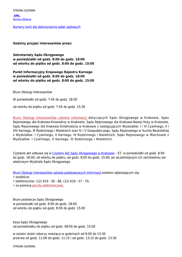 STRONA GŁÓWNA XML Strona Główna Numery kont dla dokonywania opłat sądowych Godziny przyjęć interesantów przez: Sekretariaty Sądu Okręgowego w poniedziałki od godz. 8:00 do godz. 18:00 od wtorku do piątku od godz. 8:00 do godz. 15:00 Punkt Informacyjny Krajowego Rejestru Karnego w poniedziałki od godz. 8:00 do godz. 18:00 od wtorku do piątku od godz. 8:00 do godz. 15:00 Biuro Obsługi Interesantów W poniedziałki od godz. 7:45 do godz. 18:00 od wtorku do piątku od godz. 7:45 do godz. 15:30 Biuro Obsługi Interesantów udziela informacji dotyczących Sądu Okręgowego w Krakowie, Sądu Rejonowego dla Krakowa-Krowodrzy w Krakowie, Sądu Rejonowego dla Krakowa-Nowej Huty w Krakowie, Sądu Rejonowego dla Krakowa-Śródmieścia w Krakowie z następujących Wydziałów: I i VI Cywilnego, II i XIV Karnego, III Rodzinnego i Nieletnich oraz IV i V Gospodarczego, Sądu Rejonowego w Suchej Beskidzkiej z Wydziałów: I Cywilnego, II Karnego, III Rodzinnego i Nieletnich, Sądu Rejonowego w Miechowie z Wydziałów: I Cywilnego, II Karnego, III Rodzinnego i Nieletnich. Czytanie akt odbywa się w Czytelni Akt Sądu Okręgowego w Krakowie – E7, w poniedziałki od godz. 8:00 do godz. 18:00, od wtorku do piątku, od godz. 8:00 do godz. 15:00, po wcześniejszym ich zamówieniu we właściwym Wydziale Sądu Okręgowego. Biuro Obsługi Interesantów udziela podstawowych informacji osobom zgłaszającym się: • osobiście, • telefonicznie: (12) 619 - 50 - 86, (12) 619 - 57 - 70, • za pomocą poczty elektronicznej. Biuro podawcze Sądu Okręgowego w poniedziałki od godz. 8:00 do godz. 18:00 od wtorku do piątku od godz. 8:00 do godz. 15:00 Kasa Sądu Okręgowego od poniedziałku do piątku od godz. 08:00 do godz. 15:00 w ostatni dzień roboczy miesiąca w godzinach od 8:00 do 13:30 przerwa od godz. 11:00 do godz. 11:15 i od godz. 13:15 do godz. 13:30 STRONA GŁÓWNA STRONA GŁÓWNA tel. 12 619-58-36 Sekretariat Opiniodawczego Zespołu Sądowych Specjalistów od poniedziałku do piątku od godziny 8:00 do godziny 15:00 Podmiot publikujący Sąd Okręgowy w Krakowie Wytworzył Sąd Okręgowy w Krakowie 2008-12-09 Publikujący Arkadiusz Malinowski 2008-12-09 12:10 Modyfikacja Admin Administrator 2017-02-22 14:28 Rejestr zmian STRONA GŁÓWNA
