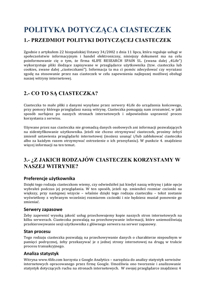 POLITYKA DOTYCZĄCA CIASTECZEK 1.- PRZEDMIOT POLITYKI DOTYCZĄCEJ CIASTECZEK Zgodnie z artykułem 22 hiszpańskiej Ustawy 34/2002 z dnia 11 lipca, która reguluje usługi w społeczeństwie informacyjnym i handel elektroniczny, niniejszy dokument ma na celu poinformowanie cię o tym, że firma 4LIFE RESEARCH SPAIN SL. (zwana dalej „4Life”) wykorzystuje pliki śledzące zapisywane w przeglądarce użytkownika (tzw. ciasteczka lub cookies, zwane dalej „ciasteczkami”). Informacja ta ma ci pomóc zdecydować czy wyrażasz zgodę na stosowanie przez nas ciasteczek w celu zapewnienia najlepszej możliwej obsługi naszej witryny internetowej. 2.- CO TO SĄ CIASTECZKA? Ciasteczka to małe pliki z danymi wysyłane przez serwery 4Life do urządzenia końcowego, przy pomocy którego przeglądasz naszą witrynę. Ciasteczka pomagają nam zrozumieć, w jaki sposób surfujesz po naszych stronach internetowych i odpowiednio usprawnić proces korzystania z serwisu. Używane przez nas ciasteczka nie gromadzą danych osobowych ani informacji pozwalających na zidentyfikowanie użytkownika. Jeżeli nie chcesz otrzymywać ciasteczek, prosimy żebyś zmienił ustawienia przeglądarki internetowej (możesz usunąć i/lub zablokować ciasteczka albo za każdym razem otrzymywać ostrzeżenie o ich przesyłaniu). W punkcie 4. znajdziesz więcej informacji na ten temat. 3.- ¿Z JAKICH RODZAJÓW CIASTECZEK KORZYSTAMY W NASZEJ WITRYNIE? Preferencje użytkownika Dzięki tego rodzaju ciasteczkom wiemy, czy odwiedziłeś już kiedyś naszą witrynę i jakie opcje wybrałeś podczas jej przeglądania. W ten sposób, jeżeli np. zmieniłeś rozmiar czcionki na większy, przy następnej wizycie – właśnie dzięki tego rodzaju ciasteczku – tekst zostanie wyświetlony z wybranym wcześniej rozmiarem czcionki i nie będziesz musiał ponownie go zmieniać. Serwery zapasowe Żeby zapewnić wysoką jakość usług przechowujemy kopie naszych stron internetowych na kilku serwerach. Ciasteczka pozwalają na przechowywanie informacji, które uniemożliwiają przekierowywanie sesji użytkownika z głównego serwera na serwer zapasowy. Stan procesu Tego rodzaju ciasteczka pozwalają na przechowywanie danych o charakterze niepoufnym w pamięci podręcznej, żeby przekazywać je z jednej strony internetowej na drugą w trakcie procesu transakcyjnego. Analiza statystyk Witryna www.4life.com korzysta z Google Analytics – narzędzia do analizy statystyk serwisów internetowych opracowanego przez firmę Google. Umożliwia ono tworzenie i analizowanie statystyk dotyczących ruchu na stronach internetowych. W swojej przeglądarce znajdziesz 4 ciasteczka związane z tym narzędziem (Google.com w połączeniu z nazwami _ga, _utma, _utmb, _utmc, _utmz). Są to ciasteczka własne, dotyczące sesji i analityczne. Dzięki narzędziom do analizy statystyk od Google Analytics otrzymujemy informacje na temat ilości użytkowników odwiedzających naszą witrynę, ilości przeglądanych przez nich stron, powtórnych wizyt, ich częstotliwości i czasu trwania, jak również rodzaju przeglądarki stosowanej przez użytkownika, nazwy operatora świadczącego usługę, języka i rodzaju urządzenia końcowego, z którego korzysta użytkownik czy miasta, do którego jest przypisany jego adres IP. Informacje te pozwalają na polepszenie jakości i usprawnienie działania naszego serwisu internetowego. Ciasteczka innych firm Może się zdarzyć, że w przeglądarce użytkownika zostaną zainstalowane ciasteczka innych firm, mimo że nie jest on zarejestrowany w danym serwisie – w takim przypadku nie będą one zawierały danych osobowych ani innych ważnych danych. Zdarza się to zwykle w przypadku kliknięcia na ikonkę któregoś z portali społecznościowych w górnej części strony, co przekierowuje użytkownika do odnośnego serwisu. W tym przypadku ciasteczko nie pochodzi od nas – jego źródłem jest docelowy serwis i to on powinien udostępnić ci stosowną informację. Jednak często użytkownik wraca później bezpośrednio do naszego portalu. Zdarza się to zwłaszcza w przypadku dzielenia się informacjami na portalach społecznościowych. Poniżej podajemy nazwy ciasteczek najczęściej używanych przez poszczególne portale (z czasem mogą się one zmieniać): YouTube: YSC, PREF, VISITOR_INFO1_LIVE, PREF, CheckConnectionTempCookie497. Firma YouTube jest zainteresowana faktem, że jej filmy udostępniane są na naszej stronie internetowej, gdyż w ten sposób może wyświetlać różne adekwatne informacje. Więcej informacji na stronie dotyczącej prywatności portalu YouTube. PayPal: kiedy płacisz za nasze produkty za pośrednictwem portalu PayPal, zostajesz czasowo przekierowany do ich serwisu, po czym wracasz na naszą stronę. PayPal stosuje całą serię ciasteczek. Oto niektóre z nich: ppLsoTest.sol i settings.sol (tzw. flash cookies), cookie_check, Apache, navcmd, abc_swithc_cross_paypal, s_pers, s_sess, ts, c_vi, JSESSIONID. Więcej informacji na stronie dotyczącej prywatności portalu PayPal. Twitter: 4Life korzysta z serwisu Twitter, który stosuje swoje własne ciasteczka, na przykład: guest_id, (Google analytics _utma, _utmb, _utmc, _utmz), original_referer y _twitter_sess. Ich zastosowanie jest opisane na stronie dotyczącej prywatności portalu Twitter. LinkedIn: ten serwis również używa ciasteczek, np.: bcookie, lidc, X-‐-‐ LI-‐-‐ IDC, JSESSIONID, visit, eo_auth_token, lang, bscookie w celach opisanych na stronie dotyczącej prywatności portalu LinkedIn. Pinterest: używa ciasteczek za każdym razem, kiedy dzielisz się z kimś obrazami 4Life -‐ żeby pamiętać, że użytkownik się zalogował lub jakiego używa języka. Więcej informacji na stronie dotyczącej prywatności portalu Pinterest. Instagram: używa ciasteczek, żeby umożliwić sprawniejsze korzystanie z portalu. Więcej informacji na stronie dotyczącej prywatności portalu Instagram. 4.- USTAWIENIA DOTYCZĄCE CIASTECZEK W P