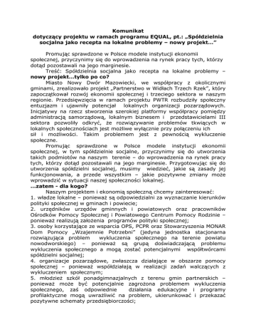 Komunikat dotyczący projektu w ramach programu EQUAL, pt.: „Spółdzielnia socjalna jako recepta na lokalne problemy – nowy projekt…” Promując sprawdzone w Polsce modele instytucji ekonomii społecznej, przyczynimy się do wprowadzenia na rynek pracy tych, którzy dotąd pozostawali na jego marginesie. Treść: Spółdzielnia socjalna jako recepta na lokalne problemy – nowy projekt…tylko po co? Miasto Nowy Dwór Mazowiecki, we współpracy z okolicznymi gminami, zrealizowało projekt „Partnerstwo w Widłach Trzech Rzek”, który zapoczątkował rozwój ekonomii społecznej i trzeciego sektora w naszym regionie. Przedsięwzięcia w ramach projektu PWTR rozbudziły społeczny entuzjazm i ujawniły potencjał lokalnych organizacji pozarządowych. Inicjatywy na rzecz stworzenia szerokiej platformy współpracy pomiędzy administracją samorządową, lokalnym biznesem i przedstawicielami III sektora pozwoliły odkryć, że rozwiązywanie problemów tkwiących w lokalnych społecznościach jest możliwe wyłącznie przy połączeniu ich sił i możliwości. Takim problemem jest z pewnością wykluczenie społeczne. Promując sprawdzone w Polsce modele instytucji ekonomii społecznej, w tym spółdzielnie socjalne, przyczynimy się do utworzenia takich podmiotów na naszym terenie – do wprowadzenia na rynek pracy tych, którzy dotąd pozostawali na jego marginesie. Przygotowując się do utworzenia spółdzielni socjalnej, musimy wiedzieć, jakie są zasady jej funkcjonowania, a przede wszystkim – jakie pozytywne zmiany może wprowadzić w sytuacji naszej społeczności lokalnej. …zatem - dla kogo? Naszym projektem i ekonomią społeczną chcemy zainteresować: 1. władze lokalne – ponieważ są odpowiedzialni za wyznaczanie kierunków polityki społecznej w gminach i powiecie; 2. urzędników urzędów gminnych i powiatowych oraz pracowników Ośrodków Pomocy Społecznej i Powiatowego Centrum Pomocy Rodzinie – ponieważ realizują założenia programów polityki społecznej; 3. osoby korzystające ze wsparcia OPS, PCPR oraz Stowarzyszenia MONAR Dom Pomocy „Wzajemnie Potrzebni” (jedyna jednostka stacjonarna rozwiązująca problem wykluczenia społecznego na terenie powiatu nowodworskiego) – ponieważ są grupą doświadczającą problemu wykluczenia społecznego a mogą zostać potencjalnymi współtwórcami spółdzielni socjalnej; 4. organizacje pozarządowe, zwłaszcza działające w obszarze pomocy społecznej – ponieważ współdziałają w realizacji zadań walczących z wykluczeniem społecznym; 5. młodzież szkół ponadgimnazjalnych z terenu gmin partnerskich – ponieważ może być potencjalnie zagrożona problemem wykluczenia społecznego, zaś odpowiednie działania edukacyjne i programy profilaktyczne mogą uwrażliwić na problem, ukierunkować i przekazać pozytywne schematy przedsiębiorczości; 6. mieszkańców gmin partnerskich – ponieważ istnieje potrzeba pogłębienia tematyki ekonomii społecznej wśród społeczności lokalnej i wytworzenia sprzyjającego klimatu dla rozwoju gospodarki społecznej i spółdzielni socjalnych. …a co się będzie działo? W ramach naszego projektu zaplanowaliśmy: - wyjazd studyjny zespołu projektowego do Partnerstwa „MOŻEMY WIĘCEJ”– żeby nawiązać jeszcze ściślejszą współpracę z Partnerstwem „MOŻEMY WIĘCEJ”, którego rezultat Model insercji społecznej i zawodowej młodych osób wykluczonych społecznie” będziemy promować w ramach naszego projektu; - seminarium „MOŻEMY WIĘCEJ – innowacyjny model spółdzielczości w środowisku lokalnym” – będzie skierowane do osób odpowiedzialnych za kreowanie polityki społecznej w gminach i powiecie tj, władz lokalnych, urzędników gminnych i powiatowych, w tym pracowników Ośrodków Pomocy Społecznej i Powiatowego Centrum Pomocy Rodzinie w Nowym Dworze Mazowieckim, zaś jego celem jest umożliwienie nabycia przez uczestników fachowej wiedzy dotyczącej spółdzielczości społecznej; - konkurs fotograficzny „Ekonomia społeczna w obiektywie” – będzie dotyczył problematyki ekonomii społecznej i spółdzielczości socjalnej, jego celem jest uwrażliwienie młodzieży na rozmaite przejawy marginalizacji społecznej; - szkolenia pt. „Model insercji społecznej i zawodowej młodych osób wykluczonych społecznie” dla urzędników gminnych, pracowników Ośrodków Pomocy Społecznej, Powiatowego Centrum Pomocy Rodzinie, przedstawicieli biur rachunkowych i prawnych oraz przedstawicieli organizacji pozarządowych – program szkolenia będzie zogniskowany wokół zagadnień ekonomii społecznej, aspektów prawnych i technicznych modelu spółdzielni socjalnej dla osób wykluczonych społecznie, przygotowania edukacyjnego potencjalnych beneficjentów do uruchomienia i prowadzenia spółdzielni socjalne oraz analizy możliwości wsparcia spółdzielni socjalnych przez samorządy i przedsiębiorców; - warsztaty „Gadu-gadu… o przedsiębiorczości społecznej” dla młodzieży szkół ponadgimnazjalnych – których celem jest zapoznanie młodych ludzi z takimi zagadnieniami ekonomii społecznej i wspólna dyskusja na tym, o co chodzi w EQUAL-u, po co tworzy się spółdzielnie socjalne, jak można walczyć z dyskryminacją w swoim otoczeniu, jak rozwijać przedsiębiorczość społeczną; - warsztaty ożywienia gospodarczego „Razem lepiej” o tematyce spółdzielczości socjalnej – będą realizowane w 6 gminach partnerskich, a ich celem jest wskazanie dziedzin, którymi w przyszłości może się zająć spółdzielnia socjalna na terenie danej gminy partnerskiej, jak również rozpoznanie potencjalnych barier powstania spółdzielni socjalnej w danej gminie partnerskiej (oraz tego, co można zrobić, aby te trudności wyeliminować); - wizytę studyjną w spółdzielni socjalnej RATEL (w Krakowie) dla urzędników gminnych, pracowników Ośrodków Pomocy Społecznej i Powiatowego Centrum Pomocy Rodzinie, 