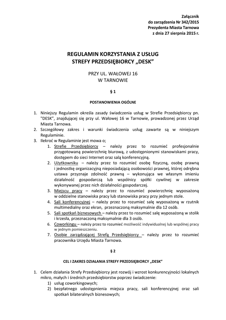 Załącznik do zarządzenia Nr 342/2015 Prezydenta Miasta Tarnowa z dnia 27 sierpnia 2015 r. REGULAMIN KORZYSTANIA Z USŁUG STREFY PRZEDSIĘBIORCY „DESK” PRZY UL. WAŁOWEJ 16 W TARNOWIE § 1 POSTANOWIENIA OGÓLNE 1. Niniejszy Regulamin określa zasady świadczenia usług w Strefie Przedsiębiorcy pn. "DESK”, znajdującej się przy ul. Wałowej 16 w Tarnowie, prowadzonej przez Urząd Miasta Tarnowa. 2. Szczegółowy zakres i warunki świadczenia usług zawarte są w niniejszym Regulaminie. 3. Ilekroć w Regulaminie jest mowa o; 1. Strefie Przedsiębiorcy – należy przez to rozumieć profesjonalnie przygotowaną powierzchnię biurową, z udostępnionymi stanowiskami pracy, dostępem do sieci Internet oraz salą konferencyjną. 2. Użytkowniku – należy przez to rozumieć osobę fizyczną, osobę prawną i jednostkę organizacyjną nieposiadającą osobowości prawnej, której odrębna ustawa przyznaje zdolność prawną – wykonująca we własnym imieniu działalność gospodarczą lub wspólnicy spółki cywilnej w zakresie wykonywanej przez nich działalności gospodarczej. 3. Miejscu pracy – należy przez to rozumieć powierzchnię wyposażoną w oddzielne stanowiska pracy lub stanowiska pracy przy jednym stole. 4. Sali konferencyjnej – należy przez to rozumieć salę wyposażoną w rzutnik multimedialny oraz ekran, przeznaczoną maksymalnie dla 12 osób. 5. Sali spotkań biznesowych – należy przez to rozumieć salę wyposażoną w stolik i krzesła, przeznaczoną maksymalnie dla 3 osób. 6. Coworkingu – należy przez to rozumieć możliwość indywidualnej lub wspólnej pracy w jednym pomieszczeniu. 7. Osobie zarządzającej Strefą Przedsiębiorcy – należy przez to rozumieć pracownika Urzędu Miasta Tarnowa. § 2 CEL I ZAKRES DZIAŁANIA STREFY PRZEDSIĘBIORCY „DESK” 1. Celem działania Strefy Przedsiębiorcy jest rozwój i wzrost konkurencyjności lokalnych mikro, małych i średnich przedsiębiorstw poprzez świadczenie: 1) usług coworkingowych; 2) bezpłatnego udostępnienia miejsca pracy, sali konferencyjnej oraz sali spotkań bilateralnych biznesowych; 3) umożliwienie nawiązania kontaktów i wymiany doświadczeń biznesowych. 2. Usługi świadczone przez Strefę Przedsiębiorcy realizowane są w sposób bezstronny z zachowaniem należytej staranności. 3. Świadczone usługi są ewidencjonowane na potrzeby statystyczne. Zbieranie i przechowywanie informacji nt. użytkowników korzystających ze Strefy Przedsiębiorcy odbywa się w formie papierowej na specjalnie przygotowanych formularzach oraz w elektronicznej bazie użytkowników. 4. Strefa Przedsiębiorcy nie może pełnić funkcji siedziby firmy. Użytkownik nie może rejestrować działalności gospodarczej po adresem Strefy Przedsiębiorcy, tj. ul. Wałowa 16, 33‐100 Tarnów. § 3 REJESTRACJA UŻYTKOWNIKA 1. Korzystanie ze Strefy Przedsiębiorcy możliwe jest jedynie po uprzednim dokonaniu rejestracji, która polega na prawidłowym wypełnieniu i podpisaniu formularza rejestracyjnego zawierającego dane firmy, które zostaną zweryfikowane z wpisem do Centralnej Ewidencji i Informacji o Działalności Gospodarczej (CEIDG) lub KRS; okazaniu ważnego dokumentu tożsamości ze zdjęciem (do wglądu); podpisania oświadczenia o zapoznaniu się z Regulaminem Korzystania z Usług Strefy Przedsiębiorcy „DESK”. 2. Wypełnianie formularza rejestracyjnego przez użytkownika oznacza równoczesną akceptację treści Regulaminu. 3. Użytkownik dokonuje rejestracji osobiście. 4. Po zarejestrowaniu użytkownikowi zostaje nadany numer identyfikacyjny. 5. Rejestracja jest jednorazowa i nie zobowiązuje użytkownika do wykupienia jakichkolwiek usług. 6. Nadany numer identyfikacyjny przypisany jest do jednego użytkownika i nie może być wykorzystywany i udostępniany osobom trzecim. § 4 DOSTĘP DO MIEJSCA PRACY 1. Aby skorzystać z miejsca pracy użytkownik zobowiązany jest każdorazowo przedstawić nadany numer identyfikacyjny oraz ważny dokument potwierdzający tożsamość. 2. Użytkownik uzyskuje dostęp do miejsca pracy jeżeli jest wolne lub nastąpiła uprzednia rezerwacja miejsca pracy, w danym dniu roboczym. 3. Rezerwacja zostaje anulowana w przypadku 30 minutowego spóźnienia. 4. Z miejsca pracy użytkownik w danym dniu roboczym może korzystać w czasie nie przekraczającym łącznie 4 godzin. 5. Rezerwacji można dokonać osobiście w Strefie Przedsiębiorcy przy ul. Wałowej 16 lub telefonicznie pod numerem telefonu: 14 639‐08‐75. 6. Dostęp do Strefy Przedsiębiorcy dotyczy wyłącznie zarejestrowanego użytkownika i osoby trzecie nie mogą z niej korzystać. 7. W przypadku organizowania spotkań biznesowych, szkoleń lub konferencji, użytkownik przedstawia, osobie zarządzającej Strefą Przedsiębiorcy, listę uczestników. § 6 DOSTĘPNOŚĆ STREFY PRZEDSIĘBIORCY 1. Strefa Przedsiębiorcy czynna jest od poniedziałku do piątku, w godz. 900 ‐ 1900 (z wyłączeniem dni świątecznych i ustawowo wolnych od pracy). 2. Strefa Przedsiębiorcy, w godzinach otwarcia, zapewnia obsługę recepcyjną, na którą składa się: 1) przyjmowanie rezerwacji i udzielanie informacji o wolnych terminach; 2) pomoc w obsłudze urządzeń biurowych; 3) przyjmowanie i kierowanie użytkowników oraz ich klientów do miejsc pracy, sali konferencyjnej lub sali spotkań biznesowych; 4) udostępnianie akcesoriów biurowych. § 7 KORZYSTANIE Z SIECI INTERNET 1. Strefa Przedsiębiorcy zapewnia bezprzewodowy dostęp do Internetu dla każdego użytkownika znajdującego się w miejscu pracy. 2. W Strefie Przedsiębiorcy znajduje się jeden komputer stacjonarny, wyposażony w podstawowy pakiet Open Office, z dostępem do Internetu. 3. Wykorzystywanie łącza do pobierania i/lub udostępniania materiałów niezgodnych z prawem lub nadmierne obciążanie łącza przez ściąganie dużych plików w celach rozrywkowych (np. filmów), jest zabronione spowoduje zaprzestanie świadczenia usług w trybie natychm