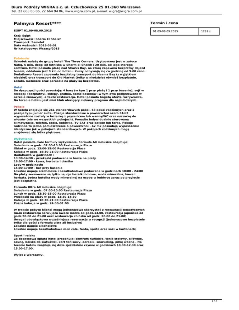 Biuro Podróży WIGRA s.c. ul. Człuchowska 25 01-360 Warszawa Tel. 22 665 06 06, 22 664 94 86, www.wigra.com.pl, e-mail: [email protected] Palmyra Resort**** EGIPT 01.09-08.09.2015 Termin i cena 01.09-08.09.2015 1299 zł Kraj: Egipt Miejscowość: Sharm El Sheikh Transport: Samolot Data ważności: 2015-09-01 Nr katalogowy: Wczasy/2015 Położenie Ośrodek należy do grupy hoteli The Three Corners. Usytuowany jest w zatoce Nabq, 5 min. drogi od lotniska w Sharm El Shaikh i 20 min. od jego starego centrum. Hotel posiada plażę nad Sharks Bay, na którą zapewnia bezpłatny dojazd busem, oddalona jest 9 km od hotelu. Kursy odbywają się co godzinę od 9.00 rano. Dodatkowo Resort zapewnia bezpłatny transport do Naama Bay (z wyjątkiem niedziel) oraz transport do Old Market (tylko w niedziele) również bezpłatnie. Leżaki, materace oraz parasole na plaży są bezpłatne, Hotel Do dyspozycji gości pozostają: 4 bary (w tym 1 przy plaży i 1 przy basenie), sejf w recepcji (bezpłatny), sklepy, pralnia, sześć basenów (w tym dwa podgrzewane w okresie zimowym), a także restauracja. Hotel posiada bogatą ofertę rozrywkową. Na terenie hotelu jest mini klub oferujący ciekawy program dla najmłodszych. Pokoje W hotelu znajduje się 261 standardowych pokoi, 68 pokoi rodzinnych oraz 2 pokoje typu junior suite. Pokoje standardowe o powierzchni około 34m2 wyposażone zostały w łazienkę z prysznicem lub wanną/WC oraz suszarkę do włosów (nie we wszystkich pokojach). Ponadto indywidualnie sterowaną klimatyzację, telefon, radio, lodówkę, TV SAT oraz balkon lub taras. Pokoje rodzinne to jedno pomieszczenie o powierzchni - 42 m2 posiadają wyposażenie identyczne jak w pokojach standardowych. W pokojach rodzinnych mogą znajdować się łóżka piętrowe. Wyżywienie Hotel posiada dwie formuły wyżywienia. Formuła All inclusive obejmuje: Śniadania w godz. 07:00-10:00 Restauracja Plaza Obiad w godz. 13:00-15:00 Restauracja Plaza Kolacja w godz. 18:30-21:00 Restauracja Plaza Dodatkowo w godzinach : 13:30-14:30 - przekąski podawane w barze na plaży 16:00-17:00 - kawa, herbata i ciastka Lody w godzinach: 15:00-17:00 - bar przy basenie Lokalne napoje alkoholowe i bezalkoholowe podawane w godzinach 10:00 - 24:00 Na plaży serwowane są tylko napoje bezalkoholowe, woda mineralna, kawa i herbata. Jedna butelka wody mineralnej na osobę w lodówce zaraz po przylocie jest bezpłatna. Formuła Ultra All inclusive obejmuje: Śniadanie w godz. 07:00-10:00 Restauracja Plaza Lunch w godz. 13:30-15:00 Restauracja Plaza Przekąski na plaży w godz. 13:30-14:30 Kolacja w godz. 18:30-21:00 Restauracja Plaza Późna kolacja w godz. 24:00-01:00 W trakcie pobytu klienci mogą jednorazowo skorzystać z restauracji tematycznych (m.in restauracja serwująca owoce morza od godz.13.00, restauracja japońska od godz.20.00 do 21.00 oraz restauracja chińska od godz. 20.00 do 21.00) Uwaga! obowiązkowa wcześniejsza rezerwacja w recepcji (jednorazowo bezpłatnie tylko dla gości z formułą ultra all inclusive) Lokalne napoje alkoholowe Lokalne napoje bezalkoholowe m.in cola, fanta, sprite oraz soki w kartonach; Sport i relaks Za dodatkową opłatą hotel proponuje: centrum nurkowe, tenis stołowy, siłownię, saunę, boisko do siatkówki, kort tenisowy, aerobik, snorkeling, piłkę wodną . Na terenie hotelu znajdują się dwie zjeżdżalnie czynne w godzinach 10.30-12.30 oraz 15.00-17.00. Wylot z Warszawy. 1/2 Biuro Podróży WIGRA s.c. ul. Człuchowska 25 01-360 Warszawa Tel. 22 665 06 06, 22 664 94 86, www.wigra.com.pl, e-mail: [email protected] 2/2 Powered by TCPDF (www.tcpdf.org)