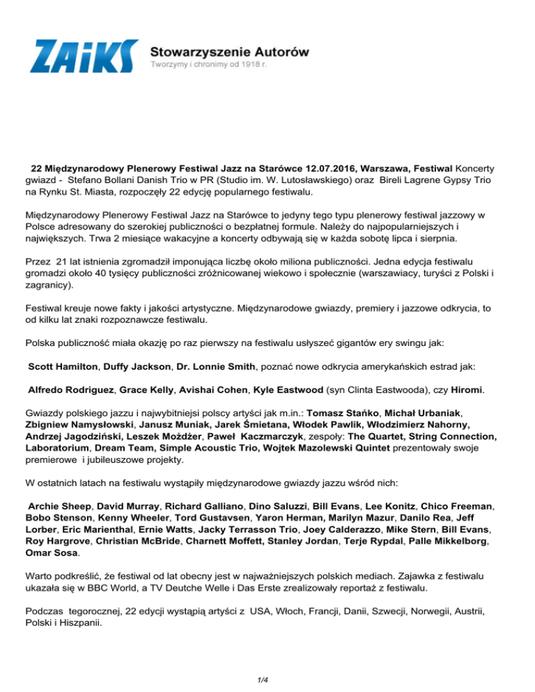 22 Międzynarodowy Plenerowy Festiwal Jazz na Starówce 12.07.2016, Warszawa, Festiwal Koncerty gwiazd - Stefano Bollani Danish Trio w PR (Studio im. W. Lutosławskiego) oraz Bireli Lagrene Gypsy Trio na Rynku St. Miasta, rozpoczęły 22 edycję popularnego festiwalu. Międzynarodowy Plenerowy Festiwal Jazz na Starówce to jedyny tego typu plenerowy festiwal jazzowy w Polsce adresowany do szerokiej publiczności o bezpłatnej formule. Należy do najpopularniejszych i największych. Trwa 2 miesiące wakacyjne a koncerty odbywają się w każda sobotę lipca i sierpnia. Przez 21 lat istnienia zgromadził imponująca liczbę około miliona publiczności. Jedna edycja festiwalu gromadzi około 40 tysięcy publiczności zróżnicowanej wiekowo i społecznie (warszawiacy, turyści z Polski i zagranicy). Festiwal kreuje nowe fakty i jakości artystyczne. Międzynarodowe gwiazdy, premiery i jazzowe odkrycia, to od kilku lat znaki rozpoznawcze festiwalu. Polska publiczność miała okazję po raz pierwszy na festiwalu usłyszeć gigantów ery swingu jak: Scott Hamilton, Duffy Jackson, Dr. Lonnie Smith, poznać nowe odkrycia amerykańskich estrad jak: Alfredo Rodriguez, Grace Kelly, Avishai Cohen, Kyle Eastwood (syn Clinta Eastwooda), czy Hiromi. Gwiazdy polskiego jazzu i najwybitniejsi polscy artyści jak m.in.: Tomasz Stańko, Michał Urbaniak, Zbigniew Namysłowski, Janusz Muniak, Jarek Śmietana, Włodek Pawlik, Włodzimierz Nahorny, Andrzej Jagodziński, Leszek Możdżer, Paweł Kaczmarczyk, zespoły: The Quartet, String Connection, Laboratorium, Dream Team, Simple Acoustic Trio, Wojtek Mazolewski Quintet prezentowały swoje premierowe i jubileuszowe projekty. W ostatnich latach na festiwalu wystąpiły międzynarodowe gwiazdy jazzu wśród nich: Archie Sheep, David Murray, Richard Galliano, Dino Saluzzi, Bill Evans, Lee Konitz, Chico Freeman, Bobo Stenson, Kenny Wheeler, Tord Gustavsen, Yaron Herman, Marilyn Mazur, Danilo Rea, Jeff Lorber, Eric Marienthal, Ernie Watts, Jacky Terrasson Trio, Joey Calderazzo, Mike Stern, Bill Evans, Roy Hargrove, Christian McBride, Charnett Moffett, Stanley Jordan, Terje Rypdal, Palle Mikkelborg, Omar Sosa. Warto podkreślić, że festiwal od lat obecny jest w najważniejszych polskich mediach. Zajawka z festiwalu ukazała się w BBC World, a TV Deutche Welle i Das Erste zrealizowały reportaż z festiwalu. Podczas tegorocznej, 22 edycji wystąpią artyści z USA, Włoch, Francji, Danii, Szwecji, Norwegii, Austrii, Polski i Hiszpanii. 1/4 PROGRAM Studio Koncertowe Polskiego Radia im. W. Lutosławskiego, godz. 20.00 Specjalny koncert inaugurujący 22 Międzynarodowy Plenerowy Festiwal Jazz na Starówce 1 lipca Stefano Bollani Trio ( Włochy/ Dania) Na jedynym koncercie w Polsce wystąpi gwiazda europejskiego jazzu i wirtuoz włoskiego fortepianu. Od wielu lat świeci blaskiem wyjątkowym. Niebywała osobowość: ekspresjonista, komik, mistyk, a nawet retor. Spełnia się zarówno jako solista, jak i lider. Posiada dar nawiązywania bliskiego kontaktu z publicznością. Do swych improwizowanych fantazji wplata style przeróżne. Uznany za najlepszego jazzmana Europy już w 2007 roku - laureat Hans Koller European Jazz Prize, japoński "Swing Journal" przyznał mu tytuł New Star Award 2003. W uznaniu za jego zasługi , w 2010 roku otrzymał tytuł doktora honoris causa Berklee College of Music w Bostonie. To niezwykły artysta wielu talentów. Jako solista występuje w prestiżowych miejscach jak m.in. mediolańska La Scala; gra z orkiestrami symfonicznymi jak : Orchestra Sinfonica Nazionale della Rai, Orchestre National de Paris, Leipzig Gewandhaus Orchestra pod batutą wybitnych dyrygentów. Współpracuje z czołówka światowego jazzu jak : Chick Corea, Pat Metheny, Richard Galliano, Enrico Rava (mentor i przyjaciel). Jego duńskie trio od 13 lat tworzą czołowi muzycy europejscy muzycy, z którymi nagrał 4 znakomite płyty dla prestiżowego ECM Records. Będzie to jedyny koncert gwiazdora i jego tria w Polsce. Rynek Starego Miasta godz. 19.00 2 lipca Bireli Lagrene Trio (Francja) Słynny francuski gitarzysta jazzowy pochodzenia cygańskiego o niezwykłej biografii. Cudowne dziecko jazzowej gitary , wielki cygański talent i spadkobierca Django takim przydomkiem określa się tego niezwykłego muzyka. Mając zaledwie 13 lat wydał pierwszy album, mając kilkanaście lat występował i nagrywał z gwiazdami światowego jazzu jak: Stephan Grapelli , Jaco Pastorius, McLaughlin, Joe Zawinul, Al Di Meola, Stanley Clarke, Eric Clapton, Didier Lockwood. Dziś tworzy muzykę swingową o korzeniach etnicznych, inspirowaną w znacznym stopniu twórczością wielkiego Django Reinhardta. 9 lipca - Vladislav Adzik Sendecki Polish Blue Note Quartet Wybitny polski pianista jazzowy o międzynarodowej renomie. Według "New York Village Voice" jeden z pięciu najlepszych pianistów na świecie. Z Andrzejem Olejniczakiem i Jarkiem Śmietaną w latach 70 współtworzyli zespół Extra Ball, oraz Sunship, jedną z najważniejszych grup jazzowych tamtych lat. W latach 80 tych wyemigrował do Europy Zachodniej. Grał z gigantami jazzu jak Joe Henderson, Michael Brecker, Jaco Pastorius, Billy Cobham, Marcus Miller, Didier Lockwood. W swojej twórczości łączy elementy jazzu i muzyki klasycznej i world. 16 lipca - David Helbock Trio feat. Simon Frick Project (Austria) Należą do czołówki młodych artystów austriackich. Helbock to znakomity pianista, perkusista, kompozytor, wydał jedenaście albumów. Jest laureatem austriackiej nagrody "Outstanding Artist Award . 2/4 Frick to rozchwytywany skrzypek, kompozytor i aranżer. Otrzymał tytuł Next Genaration Jazz Award 2015. Prowadzi szeroką działalność koncertową na świecie. Gra także z zespołami smyczkowymi i orkiestrami w Szwecji, Austrii, Niemczech. Zespół bardzo ciekawie przekracza granice gatunkowe, wirtuozersko i z dowcipem porusza się po wszelkich stylach jazzu, klasyki i muzyki ludowej. 23 lipca - Ulf Wakeni