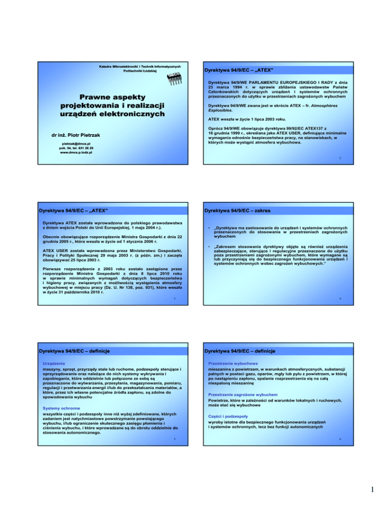 Katedra Mikroelektroniki i Technik Informatycznych Politechniki Łódzkiej Dyrektywa 94/9/EC – „ATEX” Dyrektywa 94/9/WE PARLAMENTU EUROPEJSKIEGO I RADY z dnia 23 marca 1994 r. w sprawie zbliżenia ustawodawstw Państw Członkowskich dotyczących urządzeń i systemów ochronnych przeznaczonych do użytku w przestrzeniach zagrożonych wybuchem Prawne aspekty projektowania i realizacji urządzeń elektronicznych Dyrektywa 94/9/WE zwana jest w skrócie ATEX – fr. Atmosphères Explosibles. ATEX weszła w życie 1 lipca 2003 roku. Oprócz 94/9/WE obowiązuje dyrektywa 99/92/EC ATEX137 z 16 grudnia 1999 r., określana jako ATEX USER, definiująca minimalne wymagania odnośnie bezpieczeństwa pracy, na stanowiskach, w których może wystąpić atmosfera wybuchowa. dr inż. Piotr Pietrzak [email protected] pok. 54, tel. 631 26 20 www.dmcs.p.lodz.pl 2 Dyrektywa 94/9/EC – „ATEX” Dyrektywa 94/9/EC – zakres Dyrektywa ATEX została wprowadzona do polskiego prawodawstwa z dniem wejścia Polski do Unii Europejskiej, 1 maja 2004 r.). • „Dyrektywa ma zastosowanie do urządzeń i systemów ochronnych przeznaczonych do stosowania w przestrzeniach zagrożonych wybuchem • „Zakresem stosowania dyrektywy objęte są również urządzenia zabezpieczające, sterujące i regulacyjne przeznaczone do użytku poza przestrzeniami zagrożonymi wybuchem, które wymagane są lub przyczyniają się do bezpiecznego funkcjonowania urządzeń i systemów ochronnych wobec zagrożeń wybuchowych.” Obecnie obowiązujące rozporządzenie Ministra Gospodarki z dnia 22 grudnia 2005 r., która weszła w życie od 1 stycznia 2006 r. ATEX USER została wprowadzona przez Ministerstwo Gospodarki, Pracy i Polityki Społecznej 29 maja 2003 r. (z późn. zm.) i zaczęła obowiązywać 25 lipca 2003 r. Pierwsze rozporządzenie z 2003 roku zostało zastąpione przez rozporządzenie Ministra Gospodarki z dnia 8 lipca 2010 roku w sprawie minimalnych wymagań dotyczących bezpieczeństwa i higieny pracy, związanych z możliwością wystąpienia atmosfery wybuchowej w miejscu pracy (Dz. U. Nr 138, poz. 931), które weszło w życie 31 października 2010 r. 3 Dyrektywa 94/9/EC – definicje 4 Dyrektywa 94/9/EC – definicje Urządzenia maszyny, sprzęt, przyrządy stale lub ruchome, podzespoły sterujące i oprzyrządowanie oraz należące do nich systemy wykrywania i zapobiegania, które oddzielnie lub połączone ze sobą są przeznaczone do wytwarzania, przesyłania, magazynowania, pomiaru, regulacji i przetwarzania energii i/lub do przekształcania materiałów, a które, przez ich własne potencjalne źródła zapłonu, są zdolne do spowodowania wybuchu Systemy ochronne wszystkie części i podzespoły inne niż wyżej zdefiniowane, których zadaniem jest natychmiastowe powstrzymanie powstającego wybuchu, i/lub ograniczenie skutecznego zasięgu płomienia i ciśnienia wybuchu, i które wprowadzane są do obrotu oddzielnie do stosowania autonomicznego. 5 Przestrzenie wybuchowe mieszanina z powietrzem, w warunkach atmosferycznych, substancji palnych w postaci gazu, oparów, mgły lub pyłu z powietrzem, w której po nastąpieniu zapłonu, spalanie rozprzestrzenia się na całą niespaloną mieszaninę Przestrzenie zagrożone wybuchem Powietrze, które w zależności od warunków lokalnych i ruchowych, może stać się wybuchowe Części i podzespoły wyroby istotne dla bezpiecznego funkcjonowania urządzeń i systemów ochronnych, lecz bez funkcji autonomicznych 6 1 Dyrektywa 94/9/EC – wyłączenia Dyrektywa 94/9/EC – wyłączenia • wyroby medyczne przeznaczone do użytku w środowisku medycznym • statki pełnomorskie i pływające jednostki przybrzeżne, wraz z wyposażeniem znajdującym się na ich pokładzie • urządzenia i systemy ochronne, gdy zagrożenie wybuchowe wynika wyłącznie z obecności materiałów wybuchowych lub substancji chemicznie niestabilnych • środków transportu, tj. pojazdów i ich przyczep przeznaczonych wyłącznie do pasażerskiego transportu lotniczego, drogowego, kolejowego lub wodnego oraz środków transportu w zakresie, w jakim są one przeznaczone do powietrznego, drogowego, kolejowego lub wodnego transportu rzeczy, nie wyłączając środków transportu przeznaczonych do używania w przestrzeniach grożących wybuchem, wyposażenia objętego art. 223 ust. l lit. b) Traktatu (uzbrojenie, amunicja i materiały wojenne, w tym do uzbrojenia, które wykorzystuje energię jądrową) • sprzęt przeznaczony do użytku domowego i nieprzeznaczonego do sprzedaży, gdy przestrzeń zagrożona wybuchem może powstać rzadko, wyłącznie w wyniku przypadkowego wycieku paliwa • sprzętu ochrony osobistej, będącego przedmiotem dyrektywy 89/686/EWG • 7 Dyrektywa 94/9/EC – powiązanie z innymi dyrektywami 8 Dyrektywa 94/9/EC – grupy i kategorie Gdy urządzenie podlega pod dyrektywę ATEX oraz dyrektywę EMC, każda z nich musi być stosowana odpowiednio do swojego zakresu. Urządzenia przeznaczone do użytku w atmosferze potencjalnego wybuchu są wyłączone z ustaleń dyrektywy 2006/95/WE (LVD). Wszystkie wymagania tej dyrektywy muszą być zawarte w dyrektywie ATEX (Załącznik II pkt. 1.2.7). Grupa I sprzęt przeznaczony do użycia w kopalniach pod ziemią oraz w tych obszarach instalacji naziemnych, które są narażone na gazy kopalniane i/lub wybuchowe mieszaniny pyłów Grupa II urządzenia przeznaczone do stosowania w innych gałęziach przemysłu narażonych na występowanie przestrzeni wybuchowych Dyrektywie 2006/95/WE podlegają urządzenia wymienione w art. 1 ust.2 dyrektywy ATEX, przeznaczone do stosowania poza atmosferą potencjalnego wybuchu, ale które są wymagane dla bezpiecznego funkcjonowania sprzętu lub systemów ochronnych lub są z nimi związane. W odniesieniu do tych urządzeń obydwie dyrektywy muszą być stosowane jednocześnie. 9 Dyrektywa 94/9/EC – Grupa I, kategoria M1 10 Dyrektywa 94/9/EC – Grupa I, kategoria M1 Grupa I, kategoria M1 