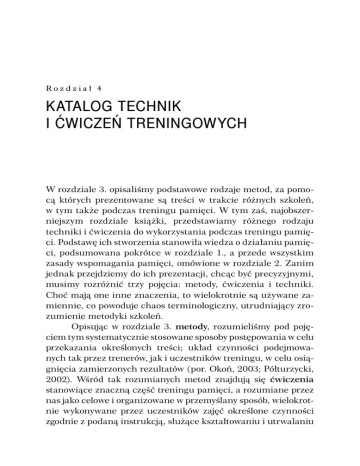 Rozdział 4 Katalog technik i ćwiczeń TRENINGOWYCH W rozdziale 3. opisaliśmy podstawowe rodzaje metod, za pomocą których prezentowane są treści w trakcie różnych szkoleń, w tym także podczas treningu pamięci. W tym zaś, najobszerniejszym rozdziale książki, przedstawiamy różnego rodzaju techniki i ćwiczenia do wykorzystania podczas treningu pamięci. Podstawę ich stworzenia stanowiła wiedza o działaniu pamięci, podsumowana pokrótce w rozdziale 1., a przede wszystkim zasady wspomagania pamięci, omówione w rozdziale 2. Zanim jednak przejdziemy do ich prezentacji, chcąc być precyzyjnymi, musimy rozróżnić trzy pojęcia: metody, ćwiczenia i techniki. Choć mają one inne znaczenia, to wielokrotnie są używane zamiennie, co powoduje chaos terminologiczny, utrudniający zrozumienie metodyki szkoleń. Opisując w rozdziale 3. metody, rozumieliśmy pod pojęciem tym systematycznie stosowane sposoby postępowania w celu przekazania określonych treści; układ czynności podejmowanych tak przez trenerów, jak i uczestników treningu, w celu osiągnięcia zamierzonych rezultatów (por. Okoń, 2003; Półturzycki, 2002). Wśród tak rozumianych metod znajdują się ćwiczenia stanowiące znaczną część treningu pamięci, a rozumiane przez nas jako celowe i organizowane w przemyślany sposób, wielokrotnie wykonywane przez uczestników zajęć określone czynności zgodnie z podaną instrukcją, służące kształtowaniu i utrwalaniu 138 Trening pamięci założonych umiejętności, a także nabywaniu wiedzy. W tej części poradnika prezentujemy przykłady różnorodnych ćwiczeń, dzięki którym uczestnicy nabędą wiedzę i umiejętności dotyczące lepszego korzystania z własnych zasobów pamięciowych, a także poprzez których wykonywanie mogą zmienić swoje postawy dotyczące funkcjonowania własnej pamięci. W rozdziale tym opisujemy także różnorodne techniki wspomagania pamięci (z których większość zwana jest mnemotechnikami), ułatwiające kodowanie, przechowywanie i wydobywanie informacji z pamięci. Dzięki ich zastosowaniu można znacznie zwiększyć zarówno zakres, jak i trwałość zasobów pamięciowych. Wśród technik wspomagania pamięci prezentujemy zarówno znane systemy mnemoniczne, takie jak Łańcuszek skojarzeń, Rzymski pokój, Systemy zakładkowe, jak również techniki oparte na wykorzystaniu rymu, akronimów, akrostychów czy też specyficzne techniki zapamiętywania określonych treści: informacji o nowo poznanych osobach czy tekstów, a także technikę notowania zwaną Mapą myśli, która jest także techniką wspomagania pamięci. W licznych poradnikach, opisujących na przykład Rzymski pokój czy Łańcuszek skojarzeń, mnemotechniki te określane są zamiennie pojęciem metod wspomagania pamięci czy metod pamięciowych (mowa jest na przykład o metodzie, a nie technice Rzymskiego pokoju). Dla pewnego ujednolicenia terminologicznego w niniejszej pozycji proponujemy jednak określać je mianem mnemotechnik czy też technik wspomagania pamięci, rezerwując pojęcie metody dla opisu metod szkoleniowych. Prezentowane w tym rozdziale techniki i ćwiczenia, które można wykorzystać podczas treningu pamięci, tworzą otwarty katalog. Składają się nań propozycje takich technik i ćwiczeń, które sprawdziły się w ramach organizowanych i prowadzonych przez nas treningów pamięci. Ich prezentacja ma dwa cele. Po pierwsze, mogą one być – po mniejszych lub większych modyfikacjach – wykorzystane w ramach treningów pamięci projektowanych i prowadzonych przez odbiorców niniejszej książki. Po drugie, mogą one być inspiracją dla trenerów pamięci do tworzenia własnych, Katalog technik i ćwiczeń treningowych 139 autorskich ćwiczeń, dostosowanych do potrzeb konkretnej grupy odbiorców, do czego szczególnie zachęcamy. Bazując bowiem na informacjach na temat pamięci i zasad jej działania zaprezentowanych w rozdziale 1., a szczególnie na zasadach wspomagania pamięci omówionych w rozdziale 2., można samemu tworzyć różne rodzaje ćwiczeń służących nie tylko ich prezentacji, ale przede wszystkim wspomaganiu pamięci poprzez ich wykorzystywanie w praktyce. Przedstawione przez nas ćwiczenia i techniki pogrupowane zostały w następujące zestawy: 1. Ćwiczenia integracyjne oraz przygotowujące do udziału w treningu. Pomogą lepiej poznać się uczestnikom zajęć, przez co wzmocnią ich motywację do udziału w treningu. Wykonywane w określony sposób i na odpowiednio dobranym materiale, mogą stanowić również doskonałe ćwiczenie pamięci. W tej grupie ćwiczeń znajdują się także takie, które mogą zachęcić uczestników do aktywnego udziału w treningu i w razie potrzeby mogą przełamać opór przed wykonywaniem określonych zadań. 2. Ćwiczenia dotyczące prezentacji informacji o pamięci. Dzięki ich wykorzystaniu można w atrakcyjny sposób przedstawić podstawowe informacje na temat funkcjonowania pamięci i zasad jej działania. Wykorzystując uczenie się przez doświadczenie (por. ramka 1.2 w rozdziale 1.), pozwolą uczestnikom lepiej przyswoić prezentowane informacje. Uczą one w jaki sposób powtarzać, opracowywać i organizować materiał by skutecznie go zapamiętać. Służą one przekazywaniu wiedzy, ale w sposób praktyczny. 3. Ćwiczenia koncentracji uwagi i innych jej aspektów. Te proste ćwiczenia stanowią nie tyko sposób na urozmaicenie treningu, ale i pokazują, jak w łatwy i przyjemny sposób można wykonywać samodzielnie ćwiczenia poprawiające nasze funkcjonowanie poznawcze. Są one rodzajem aktywnej przerwy pomiędzy ćwiczeniami stanowiącymi właściwy program treningu. Ponieważ procesy uwagi są bezpośrednio związanie z pamięcią krótkotrwałą, to wiele z proponowa- 140 Trening pamięci 4. l l l l nych przez nas w tym zestawie ćwiczeń dotyczy także krótkotrwałego przechowywania informacji w pamięci. Techniki wspomagania pamięci. W tej 
