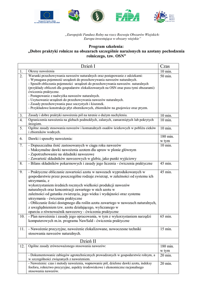 „Europejski Fundusz Rolny na rzecz Rozwoju Obszarów Wiejskich: Europa inwestuj ca w obszary wiejskie” Program szkolenia: „Dobre praktyki rolnicze na obszarach szczególnie nara onych na azotany pochodzenia rolniczego, tzw. OSN” Dzie I Czas 1. 2. Okresy nawo enia Warunki przechowywania nawozów naturalnych oraz post powanie z odciekami: - Wymagana pojemno urz dze do przechowywania nawozów naturalnych. - Sposób obliczania pojemno ci urz dze do przechowywania nawozów. naturalnych (przyk ady oblicze dla gospodarstw zlokalizowanych na OSN oraz poza tymi obszarami) wiczenia praktyczne. - Post powanie z nadwy ka nawozów naturalnych. - Usytuowanie urz dze do przechowywania nawozów naturalnych. - Zasady przechowywania pasz soczystych i kiszonek. - Przyk adowe konstrukcje p yt obornikowych, zbiorników na gnojowice oraz pryzm. 10 min. 50 min. 3. 4. Zasady i dobre praktyki nawo enia pól na terenie o du ym nachyleniu. Ograniczenia nawo enia na glebach podmok ych, zalanych, zamarzni tych lub pokrytych niegiem. Ogólne zasady stosowania nawozów i komunalnych osadów ciekowych w pobli u cieków i zbiorników wodnych. 10 min. 10 min. 5. 6. Dawki i sposoby nawo enia: 7. - Dopuszczalna ilo zastosowanych w ci gu roku nawozów - Maksymalne dawki nawo enia azotem dla upraw w plonie g ównym - Zapotrzebowanie na sk adniki nawozowe - Zawarto sk adników nawozowych w glebie, jako punkt wyj ciowy - Bilans sk adników pokarmowych i zasady jego liczenia - wiczenia praktyczne 8. 9. 10 min. 180 min. w tym 10 min. 45 min. - Praktyczne obliczanie zawarto ci azotu w nawozach wyprodukowanych w gospodarstwie przez poszczególne rodzaje zwierz t, w zale no ci od systemu ich utrzymania, z wykorzystaniem rednich rocznych wielko ci produkcji nawozów naturalnych oraz koncentracji zawartego w nich azotu w zale no ci od gatunku zwierz cia, jego wieku i wydajno ci oraz systemu utrzymania - wiczenia praktyczne - Obliczanie ilo ci dost pnego dla ro lin azotu zawartego w nawozach naturalnych, z uwzgl dnieniem tzw. azotu dzia aj cego, wyliczanego w oparciu o równowa nik nawozowy - wiczenia praktyczne 10. - Plan nawo enia i zasady jego opracowania, w tym z wykorzystaniem narz dzi komputerowych m.in. programu NawSald - wiczenia praktyczne 45 min. 11. - Nawo enie precyzyjne, nawo enie zlokalizowane, nowoczesne techniki stosowania nawozów naturalnych. 15 min. 65 min. Dzie II 12. Ogólne zasady zrównowa onego stosowania nawozów: - Dokumentowanie zabiegów agrotechnicznych prowadzonych w gospodarstwie rolnym, a w szczególno ci zwi zanych z nawo eniem. - Nawo enie: czas i metody nawo enia, wapnowanie pól, dzielone dawki azotu, indeksy fosforu, rolnictwo precyzyjne, aspekty rodowiskowe i ekonomiczne racjonalnego stosowania nawozów. 180 min. w tym 20 min. 20 min. - Zarz dzania obornikiem i gnojowic : zasady i techniki rozprzestrzeniania nawozów naturalnych, produkcja biogazu z nawozów naturalnych, mo liwo ci zastosowania produktów z biogazowni rolniczych i ich wp yw na rodowisko, separacja obornika i gnojowicy, zakwaszenie gnojowicy, dostosowane karmienie zwierz t. - Struktura gleby i jej uprawa: utrzymanie dobrej struktury gleby, uprawa gleby - ró ne praktyki uprawowe, zapobieganie erozji - systemu uproszczonej uprawy, uprawa bezorkowa. - Utrzymywanie pokrywy ro linnej i stref buforowych: wczesny wysiew ozimin pokrywa ro linna jesieni i zima, poplony, poplony a zawarto azotanów w glebie, mi dzyplony, wysoko efektywne strefy buforowe przy ciekach wodnych. - Mokrad a, oczka wodne, drena i nawadnianie. - Elementy ekonomiki - straty ponoszone przez rolników. 13. Zasady kontroli 14. Zasady i mo liwo ci ubiegania si o p atno ci w ramach niektórych dzia PROW 200715. 16. 2013 i PROW 2014-2020 dla rolników gospodaruj cych na terenach obj tych OSN. Przyczyny oraz sposoby zapobiegania eutrofizacji wód przez gospodarstwa prowadz ce produkcj ro linn , zwierz oraz mieszan : - Co to jest eutrofizacja i jej przyczyny. - Drogi ucieczki sk adników pokarmowych. - Erozja. - Retencja wodna. - Metody zapobiegania eutrofizacji – przyk ady. Pytania, wymiana do wiadcze . 25 min. 25 min. 45 min. 20 min. 25 min. 25 min. 20 min. 25min. 20 min. Dzie III 17. Wyjazd studyjny do wzorcowego gospodarstwa rolnego, prowadz cego produkcj o 250 min profilu zwierz cym lub mieszanym tj, zarówno ro linnym jak i zwierz cym podczas którego uczestnicy szkolenia w praktyce b mogli zapozna si ze stosowanymi dobrymi praktykami rolnymi w zakresie zrównowa onej i racjonalnej gospodarki nawozami jak równie podejmowanymi dzia aniami rolno rodowiskowymi maj cymi na celu ograniczenie sp ywu azotanów i fosforanów do wód (oczka wodne, zadrzewienia ródpolne, strefy buforowe, rowy melioracyjne, poplony...). Ankieta - ocena szkolenia. 18. Liczba godzin razem 20 min. 18 godz. Rejestracja uczestników przed rozpocz ciem szkolenia. Uczestnikom szkolenia przys uguj posi ki: niadanie, obiad, kolacja oraz przerwa kawowa. „Europejski Fundusz Rolny na rzecz Rozwoju Obszarów Wiejskich: Europa inwestuj ca w obszary wiejskie.” Projekt wspó finansowany ze rodków Unii Europejskiej w ramach dzia ania „Szkolenia zawodowe dla osób zatrudnionych w rolnictwie i le nictwie”. Program Rozwoju Obszarów Wiejskich na lata 2007-2013. Instytucja Zarz dzaj ca Programem Rozwoju Obszarów Wiejskich na lata 2007-2013 - Minister Rolnictwa i Rozwoju Wsi