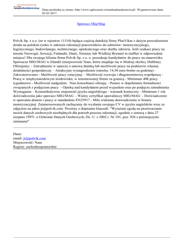 Dane pochodzą ze strony: http://www.ogloszenia.wirtualnaskandynawia.pl/. Wygenerowano dnia: 02-03-2017. Spawacz Mig/Mag Polvik Sp. z o.o. (nr w rejestrze 11310) będąca częścią duńskiej firmy PlusVikar z dużym powodzeniem działa na polskim rynku w zakresie rekrutacji pracowników do sektorów: motoryzacyjnego, logistycznego, budowlanego, technicznego, opiekuńczego oraz służby zdrowia. Jeśli szukasz pracy na terenie Norwegii, Szwecji, Finlandii, Danii, Niemiec lub Wielkiej Brytanii to trafiłeś w odpowiednie miejsce! Dla swojego klienta firma Polvik Sp. z o. o. poszukuje kandydatów do pracy na stanowisku Spawacza MIG/MAG w Irlandii (miejscowość Naas, która znajduje się w bliskiej okolicy Dublina). Oferujemy: - Zatrudnienie w oparciu o umowę duńską lub możliwość pracy na podstawie własnej działalności gospodarczej - Atrakcyjne wynagrodzenie (stawka: 14,50 euro brutto za godzinę) Zakwaterowanie - Możliwość pracy rotacyjnej - Możliwość rozwoju i długoterminową współpracę Pracę w międzynarodowym środowisku, w renomowanej firmie za granicą - Minimum 40h pracy tygodniowo - Możliwość nadgodzin Nasi konsultanci oferują: - Pomoc w dopełnianiu formalności związanych z podjęciem pracy - Opiekę nad kandydatem przed wyjazdem oraz po podjęciu zatrudnienia Wymagania: - Komunikatywna znajomość języka angielskiego - warunek konieczny - Minimum 1 rok doświadczenia jako spawacz MIG/MAG - Ważny certyfikat spawalniczy MIG/MAG - Doświadczenie w spawaniu drutem i pracy w standardzie EN25917 - Mile widziane doświadczenie w branży motoryzacyjnej Zainteresowanych zachęcamy do wysłania swojego CV w języku angielskim wraz ze zdjęciem na adres [email protected] Prosimy o dopisanie klauzuli: "Wyrażam zgodę na przetwarzanie moich danych osobowych niezbędnych dla potrzeb procesu rekrutacji, zgodnie z ustawą z dnia 27 sierpnia 1997r. o Ochronie Danych Osobowych, Dz. U. z 2002 r. Nr 101, poz. 926 z późniejszymi zmianami" Dane: email: [email protected] Miejscowość: Naas Region: zachodniopomorskie