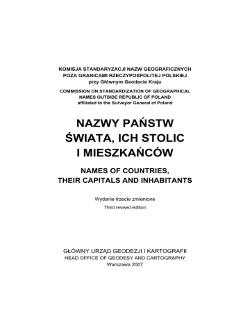 KOMISJA STANDARYZACJI NAZW GEOGRAFICZNYCH POZA GRANICAMI RZECZYPOSPOLITEJ POLSKIEJ przy Głównym Geodecie Kraju COMMISSION ON STANDARDIZATION OF GEOGRAPHICAL NAMES OUTSIDE REPUBLIC OF POLAND affiliated to the Surveyor General of Poland NAZWY PAŃSTW ŚWIATA, ICH STOLIC I MIESZKAŃCÓW NAMES OF COUNTRIES, THEIR CAPITALS AND INHABITANTS Wydanie trzecie zmienione Third revised edition GŁÓWNY URZĄD GEODEZJI I KARTOGRAFII HEAD OFFICE OF GEODESY AND CARTOGRAPHY Warszawa 2007 KOMISJA STANDARYZACJI NAZW GEOGRAFICZNYCH POZA GRANICAMI RZECZYPOSPOLITEJ POLSKIEJ przy Głównym Geodecie Kraju COMMISSION ON STANDARDIZATION OF GEOGRAPHICAL NAMES OUTSIDE REPUBLIC OF POLAND affiliated to the Surveyor General of Poland Maksymilian Skotnicki (przewodniczący do 2007 – chairperson till 2007), Waldemar Rudnicki (przewodniczący od 2007 – chairperson since 2007), Ewa Wolnicz-Pawłowska (zastępca przewodniczącego – deputy chairperson), Izabella Krauze-Tomczyk (sekretarz – secretary); członkowie – members: Stanisław Alexandrowicz, Andrzej Czerny, Janusz Danecki, Janusz Gołaski, Romuald Huszcza, Sabina Kacieszczenko, Dariusz Kalisiewicz, Artur Karp, Andrzej Markowski, Zbigniew Obidowski, Jerzy Ostrowski, Jerzy Pietruszka, Andrzej Pisowicz, Bogusław R. Zagórski, Maciej Zych Opracowanie Elaboration Andrzej Czerny, Maciej Zych Konsultacja językowa Linguistic consultation Andrzej Markowski, Ewa Wolnicz-Pawłowska Recenzent Reviewer Jerzy Ostrowski Tłumaczenie Translated by Bengt Scotland Projekt okładki Cover designe Agnieszka Kijowska © Copyright by Główny Geodeta Kraju 2007 Skład komputerowy i druk Typesetting and printing Instytut Geodezji i Kartografii, Warszawa Spis treści Od Wydawcy IV Przedmowa V Wprowadzenie VII Przyjęte zasady transliteracji na alfabet łaciński z języków posługujących się innymi formami zapisu XIV Objaśnienie skrótów i znaków XVII 1 Państwa Dodatek 1. Terytoria niesamodzielne lub o nieustalonym statusie 50 międzynarodowym Przynależność polityczna terytoriów niesamodzielnych 67 Dodatek 2. Terytoria autonomiczne 69 Polsko-angielski słownik nazw państw 78 IV Od Wydawcy Nazwy geograficzne spełniają ważną rolę informacyjną. Wobec zachodzących w świecie zmian politycznych konieczne jest publikowanie oficjalnych, aktualnych wykazów nazw państw świata i ich stolic. Opracowywanie i publikowanie tego typu wykazów wynika również z realizacji rezolucji Organizacji Narodów Zjednoczonych, mających na celu ujednolicenie nazewnictwa geograficznego używanego w publikacjach kartograficznych, podręcznikach, prasie i innych środkach masowego przekazu. Niniejsza publikacja stanowi trzecie wydanie wykazu „Nazwy państw świata, ich stolic i mieszkańców” wcześniej opublikowanego przez Główny Urząd Geodezji i Kartografii w 1997 i 2003 roku. Zaktualizowany wykaz został zatwierdzony przez Komisję Standaryzacji Nazw Geograficznych poza Granicami Rzeczypospolitej Polski przy Głównym Geodecie Kraju. Żywimy nadzieję, że publikacja ta, przygotowana przez zespół specjalistów, przede wszystkim geografów i językoznawców, przyczyni się do poprawnego stosowania nazw geograficznych i będzie pomocna dla wielu osób i instytucji. Główny Geodeta Kraju V Przedmowa W 1997 roku Komisja Standaryzacji Nazw Geograficznych poza Granicami Polski, realizując należący do tej Komisji obowiązek ustalania oficjalnego polskiego nazewnictwa geograficznego, opublikowała Nazwy państw świata, ich stolic i mieszkańców, w opracowaniu Sabiny Kacieszczenko, Izabelli Krauze-Tomczyk, Jerzego Kondrackiego, Jerzego Ostrowskiego i Bogusława R. Zagórskiego. Po sześciu latach, w 2003 roku Komisja opublikowała drugie, zaktualizowane i rozszerzone, wydanie tego wykazu. Trzecie wydanie zostało ponownie skrupulatnie zaktualizowane i uzupełnione hasłami dotyczącymi przedtem nieuwzględnionych i nowo powstałych jednostek politycznych. Zawiera ono także ustalone przez Komisję zmiany w nazewnictwie zalecanym do stosowania. Wynikają one przede wszystkim z korekt, jakie zdecydowano się wprowadzić w odniesieniu do używanych wcześniej nazw spolszczonych. Niektóre korekty wprowadzono po długich dyskusjach, materia jest bowiem wielce delikatna. Z jednej strony chodzi o to, aby nie zubażać języka, usuwając pochopnie te nazwy, które świadczą o naszych wielowiekowych kontaktach z odległymi nawet krajami. Z drugiej strony zalecane jest używanie nazw oryginalnych, ułatwiają one bowiem porozumiewanie się oraz umożliwiają korzystanie z różnych źródeł zagranicznych, co w dobie internetu jest szczególnie ważne. Należy więc zarazem chronić to, co jest utrwalone, ale także pozbywać się tych nazw, które zostały wprowadzone zbyt pośpiesznie i powszechnie nie przyjęły się. W sytuacjach wątpliwych Komisja z zasady opowiadała się za nazwami oryginalnymi. Niekiedy jednak oceny okazywały się rozbieżne, bo przecież odbiór nazw i doświadczenia w ich stosowaniu nie są jednakowe. Decyzje w tych sprawach mogą się wreszcie zmieniać, jako że język jest żywy i czasem narzuca określone rozwiązania. Trudności w ustalaniu nazw geograficznych mogą mieć także inne przyczyny: od luk w materiałach źródłowych po nieścisłości w oficjalnej dokumentacji. Zdarza się, że nazwy państw w ich pełnej wersji podawane są różnie nawet w publikacjach organów rządowych i ustawodawczych, przy czym nie dotyczy to wyłącznie krajów dalekich. VI Warto wreszcie podkreślić, że ustalenie przynależności i statusów politycznych poszczególnych terytoriów, konsekwentnie w wykazie podawane, bywało niekiedy kłopotliwe – tym bardziej, że owe statusy nierzadko ulegają zmianie. W niniejszej publikacji nie chodzi jednak o zaprezentowanie podziału politycznego świata, a tylko o przedstawienie ustalonego i zalecanego nazewnictwa. Tylko tyle i aż tyle – przygotowanie wykazu wymagało bowiem żmudnych dociekań i pracy wielu spec