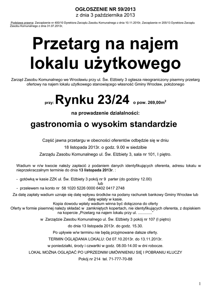 OGŁOSZENIE NR 59/2013 z dnia 3 października 2013 Podstawa prawna: Zarządzenie nr 400/10 Dyrektora Zarządu Zasobu Komunalnego z dnia 10.11.2010r, Zarządzenie nr 205/13 Dyrektora Zarządu Zasobu Komunalnego z dnia 31.07.2013r, Przetarg na najem lokalu uŜytkowego Zarząd Zasobu Komunalnego we Wrocławiu przy ul. Św. ElŜbiety 3 ogłasza nieograniczony pisemny przetarg ofertowy na najem lokalu uŜytkowego stanowiącego własność Gminy Wrocław, połoŜonego przy: Rynku 23/24 o pow. 269,00m2 na prowadzenie działalności: gastronomia o wysokim standardzie Część jawna przetargu w obecności oferentów odbędzie się w dniu 18 listopada 2013r. o godz. 9.00 w siedzibie Zarządu Zasobu Komunalnego ul. Św. ElŜbiety 3, sala nr 101, I piętro. Wadium w n/w kwocie naleŜy zapłacić z podaniem danych identyfikujących oferenta, adresu lokalu w nieprzekraczalnym terminie do dnia 13 listopada 2013r. : - gotówką w kasie ZZK ul. Św. ElŜbiety 3 pokój nr 9 parter (do godziny 12.00) lub - przelewem na konto nr 58 1020 5226 0000 6402 0417 2748 Za datę zapłaty wadium uznaje się datę wpływu środków na podany rachunek bankowy Gminy Wrocław lub datę wpłaty w kasie. Kopia dowodu wpłaty wadium winna być dołączona do oferty Oferty w formie pisemnej naleŜy składać w zamkniętych kopertach, nie identyfikujących oferenta, z dopiskiem na kopercie „Przetarg na najem lokalu przy ul. .............” w Zarządzie Zasobu Komunalnego ul. Św. ElŜbiety 3 pokój nr 107 (I piętro) do dnia 13 listopada 2013r. do godz. 15.30. Po upływie w/w terminu nie będą przyjmowane dalsze oferty. TERMIN OGLĄDANIA LOKALU: Od 07.10.2013r. do 13.11.2013r. w poniedziałki, środy i czwartki w godz. 08.00-14.00 w dni robocze. LOKAL MOśNA OGLĄDAĆ PO UPRZEDNIM UMÓWNIENIU SIĘ I POBRANIU KLUCZY Pokój nr 214 tel. 71-777-70-88 1 OPIS LOKALU: Rynek 23/24 Adres 2 powierzchnia lokalu [m ] 269,00m2 Oznaczenie nieruchomości wg ewidencji gruntów i katastru Stare Miasto AM 37, dz. 3 i dz. 2/18 lokal nie ma urządzonej księgi wieczystej. Dla nieruchomości, w których znajduje się lokal Sąd Rejonowy dla Wrocławia-Krzyków prowadzi księgi wieczyste nr WR1K/00045772/9 i WR1K/00065886/7 Rodzaj budynku Budynek w wykazie lub rejestrze zabytków mieszkalno - uŜytkowy rejestr poz. 212, 281, 273 196 Lokal w budynku frontowym, połoŜony w 2 nieruchomościach, parter i piwnica, antresola (nie wliczana do powierzchni uŜytkowej lokalu) , wejście od ulicy i od podwórza elektryczna, wod-kan, gaz, CO miejskie, Numer miejsc. planu zagospod. przestrzennego Lokalizacja Instalacje BranŜa po przetargu Dodatkowe warunki dot. prowadzenia działalności w lokalu Wywoławczy miesięczny czynsz netto [zł] Wysokość wadium [zł] Wspólnota mieszkaniowa Poprzednia branŜa Czas zawarcia umowy najmu Remont i ulepszenia Zakres robót remontowo-budowlanych Oglądanie lokali – pobranie kluczy Termin rozpoczęcia działalności w lokalu Uwagi gastronomia o wysokim standardzie prowadzona działalność nie moŜe powodować uciąŜliwości w funkcjonowaniu i korzystaniu z nieruchomości przez innych uŜytkowników lub zakłócać spokoju mieszkańcom poprzez np. hałas, wydzielające się zapachy itp. 8070,00 8070,00 2 wspólnoty mieszkaniowe gastronomia 1 na czas nieoznaczony na koszt własny najemcy, bez dochodzenia zwrotu od Wynajmującego zarówno w czasie trwania umowy najmu jak i po jej ustaniu Sprawdzenie i ewentualna wymiana instalacji elektrycznej, wymiana urządzeń sanitarnych, uzupełnienie lub wymiana wierzchnich warstw posadzkowych, uzupełnienie zdekompletowanej instalacji wentylacji mechanicznej (ewentualny demontaŜ), rozprowadzenie instalacji wod-kan. według proponowanej aranŜacji, uzyskanie pozytywnej opinii kominiarskiej (dot. wentylacji), uzyskanie protokołu szczelności inst. gazowej; renowacja lub wymiana okien od strony podwórza, montaŜ drzwi wewnętrznych, malowanie ścian i sufitów z przygotowaniem powierzchni, montaŜ grzejników, pok. 214, tel. 71-777-70-88 Nie dłuŜej niŜ 12 miesięcy od podpisania umowy najmu i przekazania lokalu najemcy. Lokal był przez poprzedniego najemcę dostosowany do działalności gastronomicznej. Z uwagi na demontaŜ części wyposaŜenia i instalacji przez byłego najemcę lokal wymaga ponownego dostosowania do działalności gastronomicznej. Przed przystąpieniem do przetargu oferent winien sprawdzić moŜliwości ponownego dostosowania lokalu do prowadzenia wybranej przez siebie działalności gastronomicznej. W piwnicy lokalu znajduje się zawór główny i wodomierz budynku. W związku z powyŜszym Najemca zobowiązany będzie do udostępniania lokalu na Ŝądanie Wynajmującego i Zarządcy budynku oraz odpowiednich słuŜb technicznych. Wysokość czynszu, moŜe być aktualizowana przez Wynajmującego o wskaźnik inflacji (przyrost cen towarów konsumpcyjnych i usług wg wskaźnika procentowego ogłaszanego przez GUS) w drodze pisemnego zawiadomienia przesłanego na co najmniej 7 dni przed dniem wprowadzenia czynszu w zaktualizowanej wysokości, nie częściej niŜ raz w roku. Czynsz najmu i opłaty eksploatacyjne powiększone o obowiązujący podatek VAT są płatne przez Najemcę z góry do 10-go dnia kaŜdego miesiąca na konto Wynajmującego. 1 - W okresie 5 lat od zawarcia umowy Wynajmujący moŜe rozwiązać umowę (poza przypadkami niewywiązywania się najemcy z zobowiązań określonych w umowie najmu) jedynie z waŜnych przyczyn, w szczególności w przypadku: zamiaru rewitalizacji budynku lub dokonania wszelkich innych zmian na nieruchomości uzasadniających potrzebę opróŜnienia przedmiotu najmu, lub zmiany przeznaczenia nieruchomości w miejscowym planie zagospodarowania przestrzennego lub w obowiązującym akcie wydanym przez Wynajmującego. 2 OFERTA PRZETARGOWA NA NAJEM LOKALU UśYTKOWEGO MUSI ZAWIERAĆ: 1) ścisłe określenie przedmiotu oferty co do: - oznaczenia lokalu (adres lokalu), - wysokości proponowanego czynszu, (musi być wyŜsz