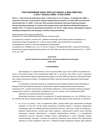 POSTANOWIENIE SĄDU APELACYJNEGO w BIAŁYMSTOKU z dnia 7 kwietnia 2008r. /II AKz 63/08/ Skoro /.../ treść informacji dotyczącej osoby, o której mowa w art. 22 ustawy z 18 października 2006r. o ujawnianiu informacji o dokumentach organów bezpieczeństwa państwa z lat 1944-1990 oraz treści tych dokumentów (Dz. U. z 2007r., Nr 63, poz. 425), zawartej w Biuletynie Informacji Publicznej Instytutu Pamięci Narodowej wskazuje, że osoba ta była zarejestrowana przez Wojskową Służbę Wewnętrzną w kategorii TW, /../ to doszło do wyczerpania przesłanek z art. 20 ust. 5 tejże ustawy, otwierających drogę do wszczęcia postępowania lustracyjnego z wniosku osoby pomówionej. Przewodniczący SSA: Eugeniusz Wildowicz Sędziowie S.A.:Jacek Dunikowski(sprawozdawca), Andrzej Czapka po rozpoznaniu w sprawie z wniosku M.K., zażalenia wniesionego przez pełnomocnika wnioskodawcy na postanowienie Sądu Okręgowego w O. z dnia 31 stycznia 2008r. sygn.akt IIK 297/07 w przedmiocie nieuwzględnienia wniosku o wszczęcie postępowania lustracyjnego na podstawie art. 437§2kpk w zw. z art. 19 i 20 ust. 5 ustawy z 18 października 2006r. o ujawnianiu informacji o dokumentach organów bezpieczeństwa państwa z lat 1944-1990 oraz treści tych dokumentów (tj. Dz. U. z 2007r., Nr 63, poz. 425) postanowił zmienić zaskarżone postanowienie i wszcząć postępowanie lustracyjne wobec M.K. Z UZASADNIENA Sąd Okręgowy w O. postanowieniem z dnia 31 stycznia 2008r. (sygn. akt II K 297/07) na podstawie art. 20 ust. 5 (a contrario) ustawy z dnia 18 października 2006r. (Dz. U., Nr 63, poz. 425 z 2007r. ze zm.) o ujawnianiu informacji o dokumentach organów bezpieczeństwa państwa z lat 1944-1990 oraz treści tych dokumentów (dalej jako: ustawa lustracyjna lub ustawa z 18 października 2006r.) odmówił wszczęcia postępowania lustracyjnego wobec M. K./.../ W uzasadnieniu orzeczenia wskazał, że udostępnienie przez Prezesa Instytutu Pamięci Narodowej w Biuletynie Informacji Publicznej zawartych w dokumentach organów bezpieczeństwa państwa informacji dotyczących M.K., nie jest równoznaczne z pomówieniem publicznym, a brak tej przesłanki wyklucza wszczęcie postępowania w trybie tzw. autolustracji na podstawie art. 20 ust. 5 ustawy z dnia 18 października 2006r. Zażalenie na to postanowienie złożył obrońca M.K. Zaskarżając orzeczenie w całości, na zasadzie art. 19 ustawy lustracyjnej w zw. z art. 427§2 kpk w zw. z art. 438 pkt 2 kpk zarzucił obrazę przepisów postępowania, która miała wpływ na treść orzeczenia, a mianowicie: 1. art. 20 ust. 5a ustawy z dnia 18 października 2006r. poprzez błędne jego zastosowanie skutkujące uznaniem, że Pan M.K. nie jest osobą uprawnioną do złożenia wniosku o wszczęcie postępowania lustracyjnego, gdyż nie nastąpiło publiczne pomówienie Pana M.K. o fakt pracy, służby lub współpracy z organami bezpieczeństwa, podczas gdy odbiór społeczny i jednoznacznie ujemna ocena informacji dotyczących powiązań agenturalnych z organami bezpieczeństwa państwa, a w szczególności subiektywne poczucie naruszenia dobrego imienia uzewnętrznione w treści złożonego wniosku autolustracyjnego, decydują, iż podanie do publicznej wiadomości przez Prezesa IPN nieprawdziwej informacji na temat współpracy Pana M.K. z Wojskową Służbą Wewnętrzną stanowi jego publiczne pomówienie i skutkuje infamią, niezależnie od działania w granicach uprawnień lub obowiązków oraz zamiaru autora publikacji, zwłaszcza, że ustalenie zamiaru działania w celu pomówienia na etapie oceny zasadności wniosku o wszczęcie postępowania lustracyjnego jest niedopuszczalne. 2. art. 19 ustawy z 18 października 2006r. w zw. z art. 4 kpk w zw. z art. 5§2 kpk w zw. z art. 45 ust. 1 Konstytucji RP poprzez nieuwzględnienie i nieustosunkowanie się do okoliczności przemawiających na korzyść wnioskodawcy, szczegółowo wyłuszczonych w toku posiedzenia w dniu 31 stycznia 2008r. i ujętych w protokole posiedzenia oraz rozstrzygnięcie powziętych i uzewnętrznionych wątpliwości dotyczących wykładni przepisu art. 20 ust. 5a ustawy z dn. 18 października 2006r. – na niekorzyść wnioskodawcy, skutkujące odebraniem Panu M.K. gwarantowanego konstytucyjnie prawa do sądu. Na zasadzie art. 19 ustawy z 18 października 2006r. w zw. z art. 427§1 kpk z zw. z art. 437§1 kpk wniósł o zmianę zaskarżonego postanowienia i wszczęcie postępowania lustracyjnego wobec wnioskodawcy Pana M.K. Na zasadzie art. 19 ustawy z 18 października 2006r. w zw. z art. 463§1 kpk przewidując możliwość reasumpcji zaskarżonego postanowienia wniósł o uwzględnienie niniejszego zażalenia w całości i wszczęcie postępowania lustracyjnego wobec wnioskodawcy Pana M.K. Sąd Apelacyjny zważył, co następuje: Zażalenie należy uznać za słuszne, a poniesiony w nim zarzut obrazy art. 20 ust. 5 (przez pomyłkę powoływany z lit. a) za uzasadniony. Podstawowym zagadnieniem w przedmiotowej sprawie stała się kwestia czy udostępnienie przez Prezesa Instytutu Pamięci Narodowej w Biuletynie Informacji Publicznej informacji o zarejestrowaniu M.K. w charakterze tajnego współpracownika z wymienionym w art. 2 ust. 1 pkt 10 ustawy lustracyjnej organem bezpieczeństwa państwa tj. Wojskową Służbą Wewnętrzną może być uznane za pomówienie publiczne, stanowiąc tym samym przesłankę formalną do wszczęcia postępowania autolustracyjnego na podstawie art. 20 ust. 5 ustawy. Przed ustosunkowaniem się do tego zagadnienia podkreślić należy, że ustawa lustracyjna zmierzająca do zapewnienia jawności życia publicznego poprzez ujawnienie pracy lub służby w organach bezpieczeństwa lub współpracy z tymi organami, musi uwzględniać ochronę konstytucyjnych wolności i praw jednostki, a przewidziana w niej procedura powinna odpowiadać wymaganiom demokratycznego państwa prawa. Niedoskonałości w tym względzie ustawy z 18 października 2006r. jak i obowiązuj