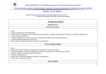 SZKOŁA PODSTAWOWA Nr 217 z Oddziałami Integracyjnymi im. Obrońców Radiostacji AK w Rembertowie Wymagania edukacyjne niezbędne do uzyskania bieżących, śródrocznych i rocznych ocen klasyfikacyjnych z przedmiotu w roku szkolnym 2015/2016 RELIGIA – KLASA TRZECIA Zgodne z programem nauczania dla klas I-III szkoły podstawowej nr: AZ-1-1/10 W drodze do Wieczernika. W Imię Ojca i Syna i Ducha Świętego. WYMAGANIA OGÓLNE SEMESTR I i II OCENA CELUJĄCA Uczeń: Spełnia wymagania na ocenę bardzo dobrą. Posiada wiedzę i umiejętności, które są efektem samodzielnej pracy, wynikają z indywidualnych zainteresowań, potrafi je zaprezentować. Jest bardzo aktywny na lekcji. Wykonuje zadane prace i ćwiczenia na ocenę co najmniej bardzo dobrą, przynosi niezbędne pomoce. Posiada uzupełniony podręcznik i karty pracy. Bierze udział w konkursach religijnych szkolnych i pozaszkolnych OCENA BARDZO DOBRA Uczeń: Posiada pełny zakres wiadomości i umiejętności wynikających z programu nauczania. Sprawnie posługuje się nabytymi umiejętnościami, jest zawsze przygotowany i bardzo aktywny na lekcji. Posiada i starannie prowadzi podręcznik i karty pracy. Przynosi niezbędne pomoce. Bierze udział w konkursach religijnych szkolnych i pozaszkolnych. Odnosi się z szacunkiem do innych. OCENA DOBRA 1 SZKOŁA PODSTAWOWA Nr 217 z Oddziałami Integracyjnymi im. Obrońców Radiostacji AK w Rembertowie Wymagania edukacyjne niezbędne do uzyskania bieżących, śródrocznych i rocznych ocen klasyfikacyjnych z przedmiotu w roku szkolnym 2015/2016 Uczeń: Opanował większość wiadomości i umiejętności wynikających z programu nauczania i potrafi je poprawnie zaprezentować. Prowadzi na bieżąco podręcznik i karty pracy, jest zawsze przygotowany do katechezy. Przynosi niezbędne pomoce. Wykonuje systematycznie i samodzielnie zadane prace i ćwiczenia. Posiada wiedzę i umiejętności pozwalającą na samodzielne wykorzystanie, jest aktywny na lekcji. 2 SZKOŁA PODSTAWOWA Nr 217 z Oddziałami Integracyjnymi im. Obrońców Radiostacji AK w Rembertowie Wymagania edukacyjne niezbędne do uzyskania bieżących, śródrocznych i rocznych ocen klasyfikacyjnych z przedmiotu w roku szkolnym 2015/2016 OCENA DOSTATECZNA Uczeń: Posiada wiedzę i umiejętności niezbędne na danym etapie nauki, pozwalające na rozumienie podstawowych zagadnień. Potrafi wyrywkowo stosować wiedzę, proste zagadnienia przedstawia przy pomocy nauczyciela, w jego wiadomościach są braki. Prowadzi na bieżąco podręcznik i karty pracy. Wykonuje niesystematycznie zadane prace i sporadycznie zapomina przynieść niezbędne pomoce. Nie wykazuje większego zainteresowania przedmiotem. OCENA DOPUSZCZAJĄCA Uczeń: Posiada minimalną wiedzę i umiejętności przewidziane w programie nauczania. Posiada braki w wiedzy i umiejętnościach religijnych, które nie uniemożliwiają mu czynienia postępów w ciągu dalszej nauki. Prowadzi karty pracy, w których są braki. Zadania wykonuje sporadycznie. Rzadko włącza się w pracę grupy. Proste polecenia, wymagające zastosowania podstawowych umiejętności wykonuje przy pomocy nauczyciela. OCENA NIEDOSTATECZNA Uczeń: Nie spełnia kryteriów wymagań na ocenę dopuszczającą, niezbędnych do opanowania podstawowych umiejętności. Nie prowadzi kart pracy, nie wykonuje zadawanych prac. Odmawia wszelkiej współpracy, ma lekceważący stosunek do przedmiotu. WYMAGANIA SZCZEGÓŁOWE 3 SZKOŁA PODSTAWOWA Nr 217 z Oddziałami Integracyjnymi im. Obrońców Radiostacji AK w Rembertowie Wymagania edukacyjne niezbędne do uzyskania bieżących, śródrocznych i rocznych ocen klasyfikacyjnych z przedmiotu w roku szkolnym 2015/2016 SEMESTR I SEMESTR II OCENA CELUJĄCA Uczeń: Opanował materiał przewidziany programem w stopniu bardzo dobrym. Posiada uzupełniony zeszyt i karty pracy do religii Samodzielnie i twórczo rozwija własne zainteresowania przedmiotem. Bierze udział w konkursach religijnych. Wykonuje dodatkowe prace zadawane przez nauczyciela religii Biegle posługuje się zdobytą wiedzą, posiada wiedzę wykraczającą poza program nauczania klasy trzeciej. Jest wzorem i przykładem dla innych uczniów. OCENA BARDZO DOBRA 4 SZKOŁA PODSTAWOWA Nr 217 z Oddziałami Integracyjnymi im. Obrońców Radiostacji AK w Rembertowie Wymagania edukacyjne niezbędne do uzyskania bieżących, śródrocznych i rocznych ocen klasyfikacyjnych z przedmiotu w roku szkolnym 2015/2016 Uczeń: Uczeń: wyjaśnia, na czym polega koleżeństwo i przyjaźń; zna i podaje przykłady składania ofiar w Starym Testamencie; rozumie potrzebę wzajemnego budowania przyjacielskich relacji; wie, kto złożył ofiarę doskonałą na przebłaganie za grzechy całego świata; rozumie, że modlitwa jest spotkaniem i znakiem przyjaźni z Bogiem; wie, że Jezus jest Kapłanem i Ofiarą; pogłębia wiadomości o chrześcijańskiej modlitwie; wymienia sposoby przygotowania się do godnego celebrowania liturgii; wymienia sytuacje, w których modlił się Jezus; wyjaśnia znaczenie żegnania się wodą święconą przy wejściu do kościoła; zna i rozpoznaje różne formy modlitwy; wymienia nazwy poszczególnych części stroju liturgicznego; podaje przykłady modlitwy indywidualnej i wspólnotowej; własnymi słowami wyjaśnia, dlaczego zakładanie stroju liturgicznego jest ważne; rozumie znaczenie modlitwy dziękczynnej; zna na pamięć mszalny akt pokuty („Spowiadam się Bogu…”); rozumie znaczenie modlitwy prośby; 5 SZKOŁA PODSTAWOWA Nr 217 z Oddziałami Integracyjnymi im. Obrońców Radiostacji AK w Rembertowie Wymagania edukacyjne niezbędne do uzyskania bieżących, śródrocznych i rocznych ocen klasyfikacyjnych z przedmiotu w roku szkolnym 2015/2016 wskazuje przykłady modlitwy w Biblii; wyjaśnia, dlaczego akt pokuty odmawiany jest zaraz na początku Mszy św.; doskonali umiejętność modlitwy przeproszenia; zna gesty uwielbienia podczas Mszy św.; rozumie znaczenie modlitwy, w której przeprasza Pan