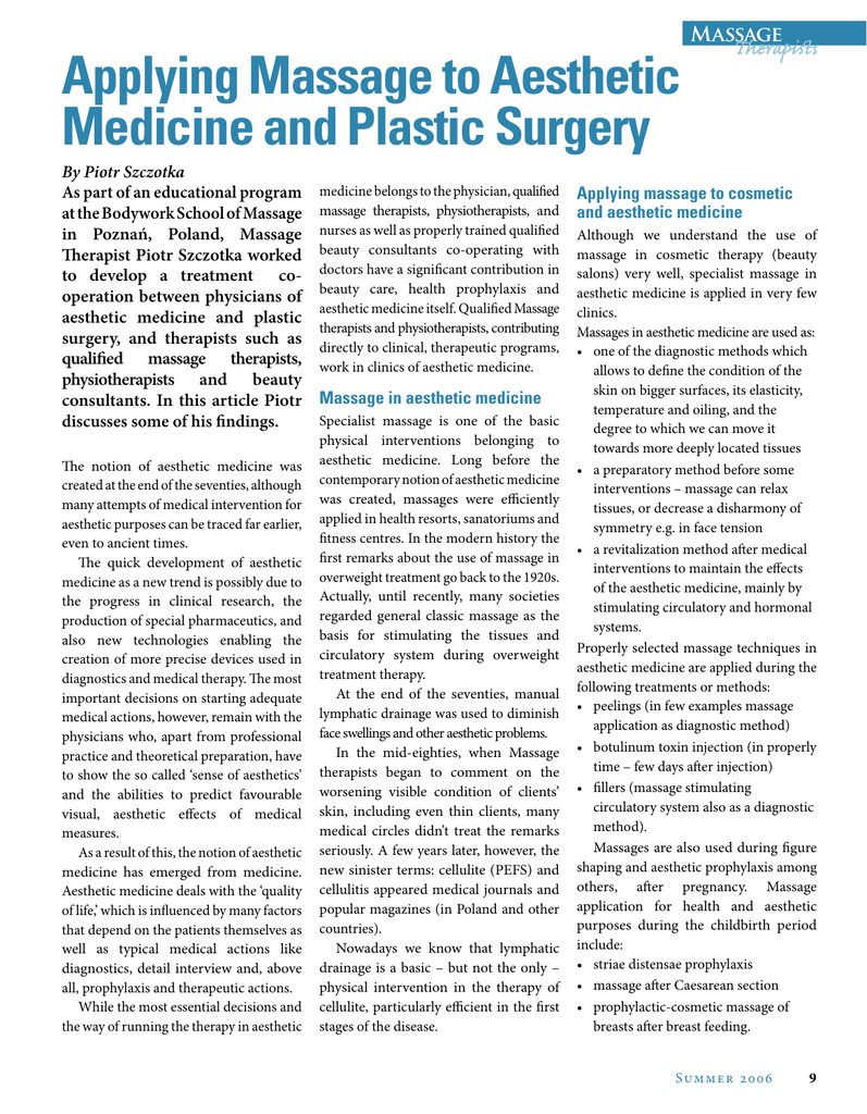 Applying Massage to Aesthetic Medicine and Plastic Surgery By Piotr Szczotka As part of an educational program at the Bodywork School of Massage in Poznań, Poland, Massage Therapist Piotr Szczotka worked to develop a treatment cooperation between physicians of aesthetic medicine and plastic surgery, and therapists such as qualified massage therapists, physiotherapists and beauty consultants. In this article Piotr discusses some of his findings. The notion of aesthetic medicine was created at the end of the seventies, although many attempts of medical intervention for aesthetic purposes can be traced far earlier, even to ancient times. The quick development of aesthetic medicine as a new trend is possibly due to the progress in clinical research, the production of special pharmaceutics, and also new technologies enabling the creation of more precise devices used in diagnostics and medical therapy. The most important decisions on starting adequate medical actions, however, remain with the physicians who, apart from professional practice and theoretical preparation, have to show the so called ‘sense of aesthetics’ and the abilities to predict favourable visual, aesthetic effects of medical measures. As a result of this, the notion of aesthetic medicine has emerged from medicine. Aesthetic medicine deals with the ‘quality of life,’ which is influenced by many factors that depend on the patients themselves as well as typical medical actions like diagnostics, detail interview and, above all, prophylaxis and therapeutic actions. While the most essential decisions and the way of running the therapy in aesthetic medicine belongs to the physician, qualified massage therapists, physiotherapists, and nurses as well as properly trained qualified beauty consultants co-operating with doctors have a significant contribution in beauty care, health prophylaxis and aesthetic medicine itself. Qualified Massage therapists and physiotherapists, contributing directly to clinical, therapeutic programs, work in clinics of aesthetic medicine. Massage in aesthetic medicine Specialist massage is one of the basic physical interventions belonging to aesthetic medicine. Long before the contemporary notion of aesthetic medicine was created, massages were efficiently applied in health resorts, sanatoriums and fitness centres. In the modern history the first remarks about the use of massage in overweight treatment go back to the 1920s. Actually, until recently, many societies regarded general classic massage as the basis for stimulating the tissues and circulatory system during overweight treatment therapy. At the end of the seventies, manual lymphatic drainage was used to diminish face swellings and other aesthetic problems. In the mid-eighties, when Massage therapists began to comment on the worsening visible condition of clients’ skin, including even thin clients, many medical circles didn’t treat the remarks seriously. A few years later, however, the new sinister terms: cellulite (PEFS) and cellulitis appeared medical journals and popular magazines (in Poland and other countries). Nowadays we know that lymphatic drainage is a basic – but not the only – physical intervention in the therapy of cellulite, particularly efficient in the first stages of the disease. Massage Therapists Applying massage to cosmetic and aesthetic medicine Although we understand the use of massage in cosmetic therapy (beauty salons) very well, specialist massage in aesthetic medicine is applied in very few clinics. Massages in aesthetic medicine are used as: • one of the diagnostic methods which allows to define the condition of the skin on bigger surfaces, its elasticity, temperature and oiling, and the degree to which we can move it towards more deeply located tissues • a preparatory method before some interventions – massage can relax tissues, or decrease a disharmony of symmetry e.g. in face tension • a revitalization method after medical interventions to maintain the effects of the aesthetic medicine, mainly by stimulating circulatory and hormonal systems. Properly selected massage techniques in aesthetic medicine are applied during the following treatments or methods: • peelings (in few examples massage application as diagnostic method) • botulinum toxin injection (in properly time – few days after injection) • fillers (massage stimulating circulatory system also as a diagnostic method). Massages are also used during figure shaping and aesthetic prophylaxis among others, after pregnancy. Massage application for health and aesthetic purposes during the childbirth period include: • striae distensae prophylaxis • massage after Caesarean section • prophylactic-cosmetic massage of breasts after breast feeding. Summer 2006 9 Fea t u r e s The role of a massage in plastic surgery Massage can play a role in diagnostic, preparatory and revitalizing in procedures such as: • muscle and body shaping such as abdominoplasty, liposuction • breast correction (lift and augmentation) • face lifts • surgical scar corrections and burn treatments. Here again the manual lymphatic drainage plays the main role, but not the only one. The manual lymphatic drainage (according to the Emil Vodder method) is widely used, among others, following general surgery, plastic surgery and aesthetic medicine. In many countries health security funds cover the costs of massages in oncology, phlebological diseases and during complicated, multi-stage surgical operations, e.g. during transplantations. Due to a serious aesthetic defect resulting from vessel changes, massage can play an important role in the prophylaxis of phlebological diseases. Massage is also recommended during some reconstruction interventions and during skin transplants performed in stages e.g. resulting from burns. Applying massage to diagnostics Here are some examples of the role of a massage in the diagnostics of soft tissues: a) Diagnostic techniques for the wh
