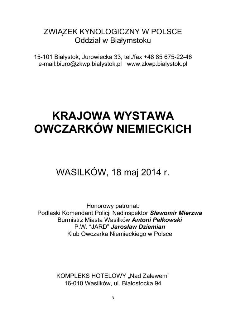 ZWIĄZEK KYNOLOGICZNY W POLSCE Oddział w Białymstoku 15-101 Białystok, Jurowiecka 33, tel./fax +48 85 675-22-46 e-mail:[email protected] www.zkwp.bialystok.pl KRAJOWA WYSTAWA OWCZARKÓW NIEMIECKICH WASILKÓW, 18 maj 2014 r. Honorowy patronat: Podlaski Komendant Policji Nadinspektor Sławomir Mierzwa Burmistrz Miasta Wasilków Antoni Pełkowski P.W. “JARD” Jarosław Dziemian Klub Owczarka Niemieckiego w Polsce KOMPLEKS HOTELOWY „Nad Zalewem” 16-010 Wasilków, ul. Białostocka 94 3 Szanowni Państwo, Chcielibyśmy serdecznie powitać wszystkich na Krajowej Wystawie Owczarków Niemieckich. Jej organizacja jest wynikiem pracy miłośników rasy zrzeszonych przy oddziale białostockim Związku Kynologicznego w Polsce. Wielkie podziękowania składamy Burmistrzowi Miasta Wasilków, Panu Antoniemu Pełkowskiemu, Josera Polska Sp. z o.o., Klubowi Owczarka Niemieckiego w Polsce oraz Dingo Sp. z o.o. za ufundowanie nagród i życzliwą współpracę. Owczarek Niemiecki – połączenie najlepszych cech użytkowych i eksterierowych. Podczas wystawy będzie można podziwiać około 100 przedstawicieli rasy ocenianych przez sędziego z Niemiec. Jesteśmy przekonani, że dzisiejsza wystawa dostarczy wszystkim niezapomnianych wrażeń. W imieniu Komitetu Organizacyjnego Przewodniczący Zarządu Oddziału w Białymstoku Andrzej Szutkiewicz 4 SPONSORZY Josera Polska Sp. z o.o. Firma H.P.U. Ryszard Gesinowski Dingo Sp. z o.o. Burmistrz Miasta Wasilków Dr. Clauder’s Polska 5 PROGRAM WYSTAWY SOBOTA – 17.05.2014 godz. 9.30 Korung (Ośrodek Szkoleniowy Lewickie 2/1) godz. 19.00 Spotkanie integracyjne – Hotel JARD ul. Białostocka 94 16-010 Wasilków NIEDZIELA – 18.05.2014 godz. 7.00 - 8.30 Przyjmowanie psów na wystawę godz. 8.45 Rozpoczęcie wystawy godz. 9.00 Rozpoczęcie sędziowania na ringu godz. 12.00 Pokazy wyszkolenia psów Uwaga! - Każdy wystawca zobowiązany jest mieć przy sobie w dniu Wystawy oryginał rodowodu psa wystawianego w klasie juniorów, otwartej, użytkowej i championów (sprawdzanie tatuaży lub chipów). - Każdy wystawca zobowiązany jest mieć przy sobie w dniu Wystawy oryginał dokumentu potwierdzającego wyszkolenie psa wystawianego w klasie użytkowej (np. Körungu) oraz championatu psa wystawianego w klasie championów. - W klasach młodzieży, juniorów, otwartej, użytkowej i championów będzie przeprowadzana próba odporności na strzał. - Dokumenty mogą być sprawdzane bezpośrednio przed oceną psów na ringach. 6 KOMITET ORGANIZACYJNY WYSTAWY Przewodniczący Oddziału ZKwP w Białymstoku - Andrzej Szutkiewicz Komisarz Wystawy - Ryszard Gesinowski Gospodarze Wystawy - Jarosław Gesinowski, Łukasz Marczukiewicz, Sekretarz wystawy - Marcin Siegień Członkowie Komitetu - Jarosław Młodzianowski, Agnieszka Gregorczuk, Justyna Szymborska OBSADA SĘDZIOWSKA THOMAS TEUBERT (SV) 7 INFORMACJE DLA WYSTAWCÓW Klasy wystawowe: baby szczeniąt młodzików młodzieży juniorów otwarta użytkowa Championów weteranów -wiek od 4 do 6 miesięcy -wiek od 6 do 9 miesięcy -wiek od 9 do 12 miesięcy -wiek od 12 do 18 miesięcy -wiek od 18 do 24 miesięcy -wiek od 24 miesięcy -wiek od 24 miesięcy z certyfikatem użytkowości -wiek od 24 m-cy z zatwierdzonym tytułem Championa -wiek powyżej 8 lat Oceny wystawowe: Klasa baby, szczeniąt i młodzików - wybitnie obiecująca - obiecujący - mało obiecujący W pozostałych klasach: - doskonała - bardzo dobra - dobra - dostateczna - dyskwalifikująca - nie do oceny UWAGI 1. Z powodu nieczytelnego wypełnienia zgłoszeń psów na wystawę mogły zaistnieć drobne błędy w nazwach psów, nazwiskach hodowców i właścicieli, za które przepraszamy. 2. Przez cały czas trwania wystawy psy muszą znajdować się pod opieką właścicieli. 3. Wystawcy zobowiązani są do noszenia numerów startowych umożliwiających organizatorom i publiczności identyfikację psa. Numery odpowiadają numerom pod którymi figurują w katalogu. 4. Wystawiane psy nie mogą być wyprowadzane z terenu wystawy przed jej oficjalnym zakończeniem. 5. Wystawca (właściciel) psa jest osobiście odpowiedzialny za szkody wyrządzone przez psa. 6. Wystawcy proszeni są o przestrzeganie planu sędziowania podanego w katalogu. Psy niedoprowadzone do oceny w określonym czasie nie podlegają ocenie. 7. Organizatorzy zastrzegają sobie prawo do zmiany obsady sędziowskiej. 8. Wszelkich informacji dotyczących wystawy udziela sekretariat wystawy oraz służba porządkowa. 8 WYKAZ PSÓW ZGŁOSZONYCH NA WYSTAWĘ RASY NIEUZNANE PRZEZ FCI – OWCZAREK NIEMIECKI DŁUGOWŁOSY Psy-Rüden Klasa baby / Baby Class 1. KALIMERO vom Haus Tchorz, czarne podpalane, 25.11.2013, 9725/VI/13, PKR w przygotowaniu (FIGO vom Nordteich-WARRINKA vom Haus Tchorz), hod. Mirosław Tchorz, wł. Alicja Żak 2. RAVI Simpor, czarne podpalane, 05.01.2014, 4372/XXXVIII/14, PKR w przygotowaniu (ONUR haus Bifo-MANTA Feetback), hod. Dejan Simovic, wł. Przemysław Szustkowski Klasa młodzików / Puppy Class 3. SOLO Eskorta, czarne podpalane, 06.06.2013, 89548/I/13, PKR.I-73450 (COUNT Ustinov van de Ybajo Hoeve-CANDY Eskorta), hod. Małgorzata Gietka, wł. Małgorzata Gietka Klasa młodzieży / Youth Class 4. ALEX I.Banacha z Hipolitowa, czarne podpalane, 13.02.2013, 9752/VI/13, PKR w przygotowaniu (FELIX vom Nordteich-LUSSY Wilczy Szaniec FCI), hod. Ireneusz Banach, wł. Ireneusz Banach 5. ARON I.Banacha z Hipolitowa, czarne podpalane, 13.02.2013, 9753/VI/13, PKR w przygotowaniu (FELIX vom Nordteich-LUSSY Wilczy Szaniec FCI), hod. Ireneusz Banach, wł. Ireneusz Banach 6. EBISZR Feetback, czarne podpalane, 15.02.2013, 6097/XXV/13, PKR w przygotowaniu (ONUR v. Haus Bifo-TANZANIA Feetback), hod. Goran Peśić, wł. Milena Becker, Beata Kalisz 7. MERO vom Cinderhof, czarne podpalane, 07.02.2013, L.O.S.H. 1123816 (ORION Mavic Poland-HERA vom tejada Schloss), hod. Ludo Shana Cathie Boons, wł. Piotr Okniński 9 Klasa użytkowa / Working Class 8. DRAGON Jadżwingi, czarne podpalane, 25.06.2010