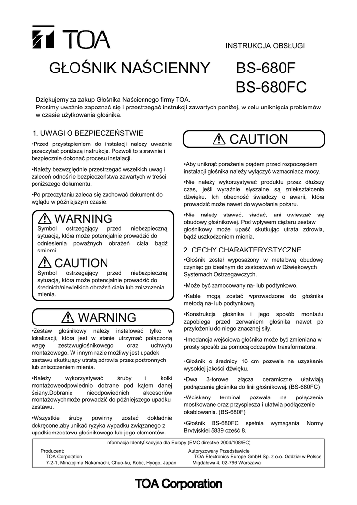 INSTRUKCJA OBSŁUGI GŁOŚNIK NAŚCIENNY BS-680F BS-680FC Dziękujemy za zakup Głośnika Naściennego firmy TOA. Prosimy uważnie zapoznać się i przestrzegać instrukcji zawartych poniżej, w celu uniknięcia problemów w czasie użytkowania głośnika. 1. UWAGI O BEZPIECZEŃSTWIE •Przed przystąpieniem do instalacji należy uważnie przeczytać poniższą instrukcję. Pozwoli to sprawnie i bezpiecznie dokonać procesu instalacji. •Należy bezwzględnie przestrzegać wszelkich uwag i zaleceń odnośnie bezpieczeństwa zawartych w treści poniższego dokumentu. •Po przeczytaniu zaleca się zachować dokument do wglądu w późniejszym czasie. WARNING Symbol ostrzegający przed niebezpieczną sytuacją, która może potencjalnie prowadzić do odniesienia poważnych obrażeń ciała bądź smierci. CAUTION Symbol ostrzegający przed niebezpieczną sytuacją, która może potencjalnie prowadzić do średnich/niewielkich obrażeń ciała lub zniszczenia mienia. WARNING •Zestaw głośnikowy należy instalować tylko w lokalizacji, która jest w stanie utrzymać połączoną wagę zestawugłośnikowego oraz uchwytu montażowego. W innym razie możliwy jest upadek zestawu skutkujący utratą zdrowia przez postronnych lub zniszczeniem mienia. •Należy wykorzystywać śruby i kołki montażoweodpowiednio dobrane pod kątem danej ściany.Dobranie nieodpowiednich akcesoriów montażowychmoże prowadzić do późniejszego upadku zestawu. •Wszystkie śruby powinny zostać dokładnie dokręcone,aby unikać ryzyka wypadku związanego z upadkiemzestawu głośnikowego lub jego elementów. CAUTION •Aby uniknąć porażenia prądem przed rozpoczęciem instalacji głośnika należy wyłączyć wzmacniacz mocy. •Nie należy wykorzystywać produktu przez dłuższy czas, jeśli wyraźnie słyszalne są zniekształcenia dźwięku. Ich obecność świadczy o awarii, która prowadzić może nawet do wywołania pożaru. •Nie należy stawać, siadać, ani uwieszać się obudowy głośnikowej. Pod wpływem ciężaru zestaw głośnikowy może upaść skutkując utrata zdrowia, bądź uszkodzeniem mienia. 2. CECHY CHARAKTERYSTYCZNE •Głośnik został wyposażony w metalową obudowę czyniąc go idealnym do zastosowań w Dźwiękowych Systemach Ostrzegawczych. •Może być zamocowany na- lub podtynkowo. •Kable mogą zostać wprowadzone metodą na- lub podtynkową. do głośnika •Konstrukcja głośnika i jego sposób montażu zapobiega przed zerwaniem głośnika nawet po przyłożeniu do niego znacznej siły. •Imedancja wejściowa głośnika może być zmieniana w prosty sposób za pomocą odczepów transformatora. •Głośnik o średnicy 16 cm pozwala na uzyskanie wysokiej jakości dźwięku. •Dwa 3-torowe złącza ceramiczne ułatwiają podłączenie głośnika do linii głośnikowej. (BS-680FC) •Wciskany terminal pozwala na połączenia mostkowane oraz przyspiesza i ułatwia podłączenie okablowania. (BS-680F) •Głośnik BS-680FC spełnia Brytyjskiej 5839 część 8. wymagania Normy Informacja Identyfikacyjna dla Europy (EMC directive 2004/108/EC) Producent: TOA Corporation 7-2-1, Minatojima Nakamachi, Chuo-ku, Kobe, Hyogo, Japan Autoryzowany Przedstawiciel TOA Electronics Europe GmbH Sp. z o.o. Oddział w Polsce Migdałowa 4, 02-796 Warszawa 3. INSTALACJA Pokrywa Uwaga: W celu zdjęcia pokrywy, po poluzowaniu śrubpociągnij w kierunku wskazanym przez strzałkę. Krok 1. Odkręć każdą ze śrub po obu bokach głośnika, a nastęonie zdejmij pokrywę. Pokrywę możesz zdjąć bez całkowitego wykręcania śrub. Odkręcanie Obudowa Dokręcanie Krok 2. Zamontuj obudowę na ścianie. Obudowa posiada zaślepki do wybicia (ø20.5 mm) do przeprowadzenia okablowania. Usuń wybraną zaślepkę w zależności od metody okablowania i trasy jego przebiegu. 2-1. Instalując głośnik przy użyciu wieszaków: Zaślepki (ø20.5mm or ø0.81") 83.5 mm (3.29") (2) Wybij odpowiednie zaślepki w obudowie i przez powstały otwór przeprowadź kabel. Jeśli kabel nie jest prowadzony podtynkowo, wówczas zamontuj dołączoną uszczelkę. Około 5 mm UWAGA: wytnij w uszczelce otwór pasujący do średnicy przeprowadzanego kabla. Zawiesie Blachowkręt 4x16 (akcesoria) 2-2. Instalując głośnik przy użyciu pozostałych otworów: (1) Wybij odpowiednie zaślepki w obudowie i przez powstały otwór przeprowadź kabel. Jeśli kabel nie jest prowadzony podtynkowo, wówczas zamontuj dołączoną uszczelkę. Na obrazku pokazano głośnik BS-680F Zaślepka: ø20.5 2-5.5 x 10 (0.22 x 0.39) [c] 36 (1.42) 60 (2.36) 115 (4.53) 2-3. Instalując głośnik podtynkowo: (1) Wykonaj w ścianie otwór o wymiarach 260 x 175 mm (10.24" x 6.89"). (2) Wybij odpowiednie zaślepki w obudowie i przez powstały otwór przeprowadź kabel, a następnie zamocuj obudowę do ściany przy użyciu wkrętów. Jeśli kabel głośnikowy ma być wyprowadzony poza głośnik natynkowo, wówczas zamontuj dołączoną uszczelkę. UWAGA: wytnij w uszczelce otwór pasujący do średnicy przeprowadzanego kabla. 4-3.5 x 6.5 (0.14 x 0.26) [a] 4-ø4.5 (0.18) [b] 60 (2.36) (2) Zawieś obudowę na ścianie używając dodatkowych otworów [a], [b] lub [c], jak pokazano na rysunku obok. Uwaga: Zestaw głośnikowy nie został wyposażony w śruby i kołki montażowe. Przed montażem należy wyposażyć się w kołki odpowiednie do rodzaju i grubości ściany. Obudowa 36 (1.42) UWAGA: wytnij w uszczelce otwór pasujący do średnicy przeprowadzanego kabla. Ściana Obudowa Zaślepki: ø20.5 (0.81) Boki: 4 otwory Dno: 2 otwory Unit: mm (in) Jednostki: mm (in) 286 (11 2 . 6) 260±3 (10.24±0 12 . ) Jednostki: mm (in) 150 (5.91) (3) Zawieś obudowę na blachowkrętach, a następnie dokręć wkręty do ściany. Kształt wieszaków głośnika zapobiega łatwemu zerwaniu głośnika ze ściany nawet po przyłożeniu do głośnika znacznej siły. 175±3 (6.89±0.12) (1) Wkręć w ścianę dwa dołączone blachowkręty pozostawiając około 5 mm niewkręconego wkr