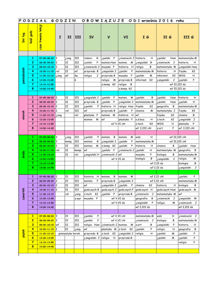 piątek czwartek środa wtorek poniedziałek G O D Z I N czas trwania lekcji ilość godz Dni tyg. P O D Z I A Ł I O B O W I Ą Z U J E II III IV V O D 1 września 2 0 1 6 roku VI I G II G III G 1 07:45-08:30 I j.ang III matem. B j.polski 2 08:35-09:20 I II III j.polski P matem.Hum 3 09:30-10:15 I II III j.niemiecki J muzyka P 4 10:30-11:15 rel II wf przyroda B j.angielski J j.polski P 5 11:30-12:15 j.ang wf św. religia przyroda B muzyka P 6 12:20-13:05 religia przyroda B 7 13:10-13:55 8 14:00-14:45 1 07:45-08:30 I II III j.angielski J j.polski P matem. B j.polski Hum historia 2 08:35-09:20 I II III przyroda B j.polski P j.angielski J matematyka M j.polski Hum j.polski 3 09:30-10:15 I II III j.polski historia H religia Hum fizyka geografia 4 10:30-11:15 I rel III wf przyroda B j.polski P 5 11:30-12:15 j.ang rel plastyka P matem. M historia H wf 6 12:20-13:05 matem. wf plastyka P 7 13:10-13:55 8 14:00-14:45 1 07:45-08:30 I j.ang III j.polski P matem. 2 08:35-09:20 I komp. III matem. B j.angielski J j.polski P matematyka M 3 09:30-10:15 I II III matem. M z.komp K2 j.polski P historia 4 10:30-11:15 rel II komp. wf j.polski j.niemiecki J j.polski 5 11:30-12:15 II rel 6 12:20-13:05 7 13:10-13:55 wf I,II dz biologia B 8 14:00-14:45 wf I,II dz j.angielski J 1 07:45-08:30 I II III historia H matem. M wf I,II chł j.polski 2 08:35-09:20 I II III matem. P przyroda B j.angielski J wf I,II chł matematyka M 3 09:30-10:15 I II III wf 4 10:30-11:15 I II III godz.wych B godz.wych J godz.wych P godz.wych H godz.wych Hum godz.wych M 5 11:30-12:15 rel j.ang z.tech K2 6 12:20-13:05 z.wyr muzyka P 7 13:10-13:55 8 14:00-14:45 1 07:45-08:30 I II III j.polski P wf V,VI chł matematyka M wdż H j.niemiecki 2 08:35-09:20 I II III j.polski P wf V,VI chł j.niemiecki biologia B matematyka M 3 09:30-10:15 wf II III religia Hum j.niemiecki J matem. B j.angielski P historia H 4 10:30-11:15 I II j.ang wf plastyka M z.tech P religia H geografia B 5 11:30-12:15 przyroda B z.tech K2 H j.polski M j.polski P 6 12:20-13:05 j.angielski J religia H j.polski M j.polski P 7 13:10-13:55 religia P 8 14:00-14:45 J k P M z.komp K2 P M j.niemiecki J historia H j.niemiecki historia H religia matematyka M j.angielski Hum matematyka M historia H fizyka K2 j.polski M informat. K2 WOS H informat. K2 j.angielski J j.polski P religia B wf II,III dz z.komp K2 wf II,III dz M j.polski K2 chemia M matem. matem. j.angielski J j.polski P przyroda B H matematyka M K2 fizyka K2 chemia B H z.tech K2 j.angielski J K2 WOS H plastyka z.art P H H P wf. I,III chł wf II,III chł wf II,III chł chemia B j.polski Hum H matematyka M geografia muzyka P biologia B matematyka M biologia B j.angielski J religia chemia K2 historia H biologia B M P B j.niemiecki J matematyka M wf wf V,VI dz geografia B j.niemiecki J j.angielski M wf V,VI dz j.angielski P religia M j.niemiecki J wf I,III dz gimnastyka korek. H fizyka M wdż. P B H matematyka J e.d.bez. z.tech wf V,VI dz j.polski historia B j.angielski H j.niemiecki J wf B J matematyka M M j.angielski B wf. I,III chł P Hum matem. wf V,VI chł B j.polski M z.art K2 j.polski j.angielski J religia przyroda B wf I,III dz J J