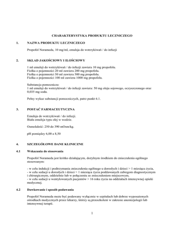 CHARAKTERYSTYKA PRODUKTU LECZNICZEGO 1. NAZWA PRODUKTU LECZNICZEGO Propofol Norameda, 10 mg/ml, emulsja do wstrzykiwań / do infuzji 2. SKŁAD JAKOŚCIOWY I ILOŚCIOWY 1 ml emulsji do wstrzykiwań / do infuzji zawiera 10 mg propofolu. Fiolka o pojemności 20 ml zawiera 200 mg propofolu. Fiolka o pojemności 50 ml zawiera 500 mg propofolu. Fiolka o pojemności 100 ml zawiera 1000 mg propofolu. Substancja pomocnicza: 1 ml emulsji do wstrzykiwań / do infuzji zawiera: 50 mg oleju sojowego, oczyszczonego oraz 0,035 mg sodu. Pełny wykaz substancji pomocniczych, patrz punkt 6.1. 3. POSTAĆ FARMACEUTYCZNA Emulsja do wstrzykiwań / do infuzji. Biała emulsja typu olej w wodzie. Osmolalość: 250 do 390 mOsm/kg. pH pomiędzy 6,00 a 8,50 4. SZCZEGÓŁOWE DANE KLINICZNE 4.1 Wskazania do stosowania Propofol Norameda jest krótko działającym, dożylnym środkiem do znieczulenia ogólnego stosowanym: - w celu indukcji i podtrzymania znieczulenia ogólnego u dorosłych i dzieci > 1 miesiąca życia, - w celu sedacji u dorosłych i dzieci > 1 miesiąca życia poddawanych zabiegom diagnostycznym i chirurgicznym, oddzielnie lub w połączeniu ze znieczuleniem miejscowym, - w celu sedacji u wentylowanych pacjentów > 16 roku życia na oddziałach intensywnej opieki medycznej. 4.2 Dawkowanie i sposób podawania Propofol Norameda może być podawany wyłącznie w szpitalach lub dobrze wyposażonych ośrodkach medycznych przez lekarzy, którzy są przeszkoleni w zakresie anestezjologii lub intensywnej terapii. 1 Konieczne jest nieustanne monitorowanie krążenia i oddychania (np. EKG, pulsoksymetria). Zawsze powinien być dostępny do natychmiastowego zastosowania sprzęt do utrzymania drożności dróg oddechowych, sztucznej wentylacji i innych zabiegów reanimacyjnych. W trakcie zabiegów chirurgicznych i diagnostycznych Propofol Norameda nie powinien być podawany przez tę samą osobę, która wykonuje taki zabieg. Dawkę Propofol Norameda należy dobrać indywidualnie w oparciu o reakcję pacjenta i stosowaną premedykację. Zwykle potrzebne jest podawanie dodatkowych leków przeciwbólowych w skojarzeniu z produktem Propofol Norameda. Dawkowanie Dorośli Znieczulenie ogólne u dorosłych Indukcja znieczulenia Do indukcji znieczulenia Propofol Norameda musi być miareczkowany (około 20 do 40 mg propofolu co 10 sekund), a reakcja pacjenta musi być nieustannie monitorowana pod kątem objawów klinicznych wskazujących na rozpoczęcie działania znieczulenia. Zazwyczaj u pacjentów dorosłych, w wieku poniżej 55 lat konieczne jest podanie 1,5 do 2,5 mg propofolu na kg masy ciała. U starszych pacjentów i u pacjentów w grupie III lub IV według klasyfikacji ASA (American Society of Anesthesiologists - Amerykańskie Towarzystwo Anestozjologów), w szczególności z zaburzeniami czynności serca, wystarczy zastosowanie mniejszej dawki, a całkowita dawka Propofol Norameda może zostać zmniejszona do 1 mg propofolu na kg masy ciała. W przypadku tych pacjentów należy także zmniejszyć tempo podawania Propofol Norameda (około 2 ml (co odpowiada 20 mg propofolu) na 10 sekund). Podtrzymanie znieczulenia Znieczulenie może być podtrzymywane przez podawanie produktu Propofol Norameda w postaci wlewu ciągłego lub powtarzanych wstrzyknięć typu bolus. Do podtrzymywania znieczulenia dawka będzie zwykle wynosić 4 mg do 12 mg/kg masy ciała/godz. Znieczulenie może być podtrzymywane przez podanie zmniejszonej dawki wynoszącej około 4 mg propofolu/kg masy ciała/godz. w przypadku mniej stresujących zabiegów chirurgicznych, takich jak chirurgia małoinwazyjna. W przypadku starszych pacjentów, pacjentów w złym stanie, pacjentów z zaburzeniami czynności serca lub pacjentów z hipowolemią oraz pacjentów w grupie III lub IV według klasyfikacji ASA dawka Propofol Norameda może być dalej zmniejszona zależnie od stanu pacjenta i zastosowanej metody znieczulenia. Do podtrzymania znieczulenia, stosując powtarzane wstrzyknięcia typu bolus należy podawać dawki 25 mg (2,5 ml) do 50 mg (5 ml) propofolu w zależności od wymagań klinicznych. 2 U starszych pacjentów nie należy stosować wstrzyknięć typu bolus (pojedynczych lub powtarzalnych), gdyż może to doprowadzić do niewydolności krążeniowo-oddechowej. Sedacja dorosłych pacjentów na oddziałach intensywnej opieki medycznej Do sedacji sztucznie wentylowanych pacjentów w warunkach intensywnej opieki medycznej zaleca się podawanie Propofol Norameda w ciągłej infuzji dożylnej. Dawkę należy dostosować do wymaganego poziomu sedacji. Zadowalający poziom sedacji osiąga się zwykle przy dawce 0,3 mg do 4,0 mg propofolu/kg masy ciała/godz. Nie zaleca się podawania dawki powyżej 4,0 mg propofolu/kg masy ciała/godz. (patrz punkt 4.4 Specjalne ostrzeżenia i środki ostrożności dotyczące stosowania). Propofol Norameda nie powinien być stosowany do sedacji w warunkach intensywnej opieki medycznej u pacjentów w wieku 16 lat i młodszych (patrz punkt 4.3 Przeciwwskazania). Propofol Norameda nie powinien być podawany przy użyciu systemu TCI do sedacji w warunkach intensywnej opieki medycznej. Sedacja dorosłych pacjentów, u których przeprowadza się zabiegi diagnostyczne i chirurgiczne Do sedacji pacjentów, u których przeprowadza się zabiegi diagnostyczne i chirurgiczne dawka i tempo podawania muszą być dostosowane do odpowiedzi klinicznej. Większość pacjentów potrzebuje do indukcji 0,5 do 1,0 mg propofolu/kg masy ciała przez 1 do 5 minut. Do podtrzymania sedacji wlew Propofol Norameda powinien być miareczkowany aż do osiągnięcia pożądanego poziomu sedacji. Większość pacjentów potrzebuje 1,5 do 4,5 mg propofolu/kg masy ciała/godz. Wlew można uzupełnić wstrzyknięciami dawek jednorazowych (bolus) 10 do 20 mg (1 do 2 ml Propofol Norameda), gdy konieczne jest szybkie osiągnięcie głębszego poziomu sedacji. U pacjentów starszych niż 55 lat i pacjentów z grupą III i IV według ASA konieczne może być