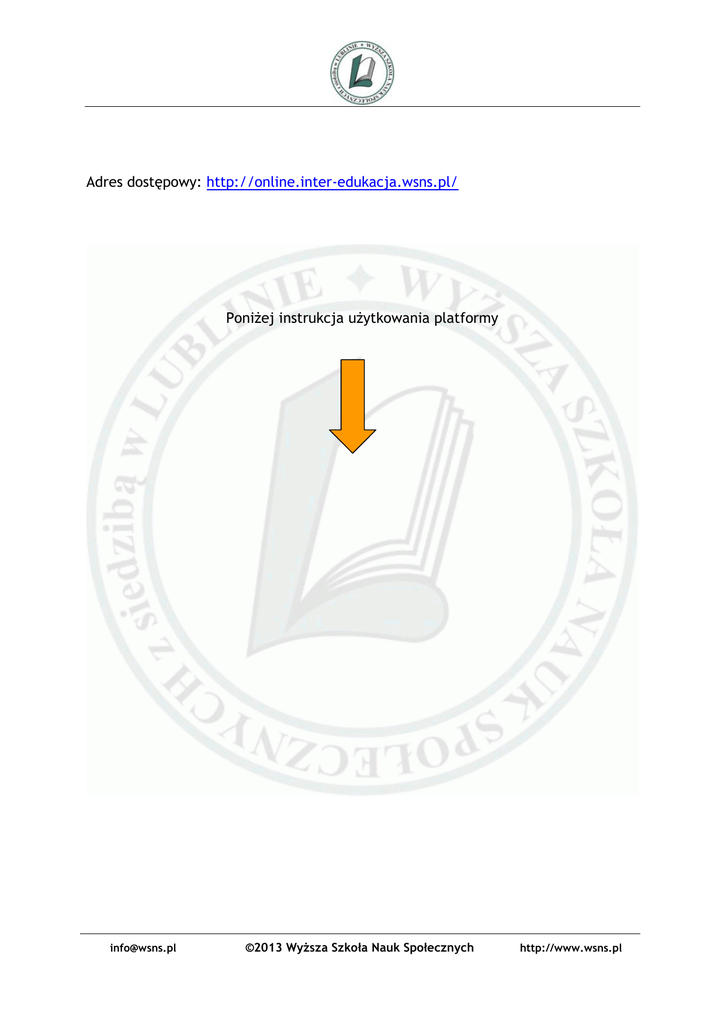 Adres dostępowy: http://online.inter-edukacja.wsns.pl/ Poniżej instrukcja użytkowania platformy [email protected] ©2013 Wyższa Szkoła Nauk Społecznych http://www.wsns.pl WYŻSZA SZKOŁA NAUK SPOŁECZNYCH z siedzibą w Lublinie SZKOLENIA PRZEZ INTERNET Instrukcja użytkowania platformy ONLINE Lublin, 2013 [email protected] ©2013 Wyższa Szkoła Nauk Społecznych http://www.wsns.pl SPIS TREŚCI Rozdział 1. Wymagania techniczne. ......................................................... 4 1. System operacyjny. ...................................................................... 4 2. Przeglądarka internetowa. ............................................................. 4 3. Wymagane wtyczki i rozszerzenia. .................................................... 4 Rozdział 2. Logowanie do platformy. ....................................................... 5 Rozdział 3. Poruszanie się po kursach na platformie. .................................... 6 1. Kursy ....................................................................................... 6 2. Testy ....................................................................................... 7 Rozdział 4. Bezpieczeństwo. ................................................................. 9 [email protected] ©2013 Wyższa Szkoła Nauk Społecznych http://www.wsns.pl Rozdział 1. Wymagania techniczne. 1. System operacyjny. Do korzystania z platformy ONLINE nie jest wymagany konkretny system operacyjny, można skorzystać z każdego systemu, posiadającego wymienione poniżej oprogramowanie. Sugerowanymi systemami operacyjnymi są systemy z rodziny Microsoft® Windows®, oraz systemy Linux z obsługą X-Window. 2. Przeglądarka internetowa. Do skorzystania z platformy ONLINE można wykorzystać większość dostępnych na rynku przeglądarek internetowych, posiadających obsługę wymienionych poniżej technologii. Najbardziej sugerowane to wszystkie przeglądarki Internet Explorer w wersji 5.0 i wyższej, grupa przeglądarek z rodziny Mozilla (Mozilla, Mozilla Firefox, Mozilla SeaMonkey), oraz Opera w wersji 7.0 i wyższej. 3. Wymagane wtyczki i rozszerzenia. Do prawidłowego funkcjonowania platformy ONLINE niezbędna jest obsługa następujących technologii przez przeglądarkę internetową: - obsługa JavaScript – część platformy do prawidłowego funkcjonowania wymaga obsługi skryptów języka JavaScript (domyślnie dostępna w większości przeglądarek, choć może być wyłączona); - obsługa technologii Macromedia Flash w wersji 9 (w przypadku większości przeglądarek zainstalowanie wtyczki pozwalającej na wyświetlanie elementów flaszowych następuje automatycznie, użytkownik musi tylko potwierdzić chęć zainstalowania wtyczki); - obsługa okienek wyskakujących – nie wymaga doinstalowywania dodatkowych elementów, ale w niektórych nowszych przeglądarkach okienka wyskakujące są domyślnie blokowane). [email protected] ©2013 Wyższa Szkoła Nauk Społecznych http://www.wsns.pl Rozdział 2. Logowanie do platformy. Aby zalogować się do platformy ONLINE należy uruchomić przeglądarkę internetową, a następnie wpisać następujący adres: http://online.inter-edukacja.wsns.pl Po wpisaniu adresu i jego zatwierdzeniu, w oknie przeglądarki powinna otworzyć się strona logowania: Rys. 1 Okno logowania do platformy ONLINE. W oknie logowania należy wpisać otrzymany wcześniej login i hasło. Po wpisaniu danych należy kliknąć przycisk Zaloguj się. Po kliknięciu przycisku nastąpi proces logowania, a po poprawnym zalogowaniu wyświetli się główna strona platformy. Na głównej stronie platformy znajduję się lista kursów dostępnych dla słuchaczy. Rys. 2 Strona główna platformy ONLINE. [email protected] ©2013 Wyższa Szkoła Nauk Społecznych http://www.wsns.pl Rozdział 3. Poruszanie się po kursach na platformie. Głównymi zadaniami platformy ONLINE są: 1. przechowywanie materiałów dotyczących poszczególnych przedmiotów studiów jako kursów na platformie – są to materiały w różnych formatach np: w wersji HTML jako poszczególne lekcje, w wersjach PDF, DOC i SWF jako pliki do pobrania. 2. udostępnianie testów sprawdzających dla słuchaczy. 1. Kursy Na stronie głównej platformy znajduje się lista kursów, które zostały opublikowane na platformie. Nie wszystkie kursy są dostępne dla Słuchaczy. Zalogowany Słuchacz może przejrzeć tylko te kursy, na które został zapisany 1. Aby zobaczyć elementy składowe kursu, należy wybrać określony kurs poprzez kliknięcie jego nazwy na liście kursów. Rys. 3 Zawartość kursu. Każdy kurs składa się z pewnej liczby lekcji, oraz z umieszczonych na dole spisu lekcji odnośników do plików zawierających materiały w różnych formatach. Aby zobaczyć zawartość lekcji, należy kliknąć w jej temat. Otworzy się nowe okienko, w którym znajduje się treść lekcji. 1 Czynności te wykonuje Administrator platformy. [email protected] ©2013 Wyższa Szkoła Nauk Społecznych http://www.wsns.pl Rys. 4 Okienko z treścią lekcji. Po zapoznaniu się z treścią lekcji, wystarczy zamknąć okienko, i można kontynuować naukę. 2. Testy Ostatnią pozycją na liście lekcji danego kursu jest Test wiadomości. Testy wiadomości będą dostępne dla Słuchaczy w określonych terminach. Rys. 5 Test udostępniony Słuchaczom. [email protected] ©2013 Wyższa Szkoła Nauk Społecznych http://www.wsns.pl Rys. 6 Test nieudostępniony Słuchaczom. [email protected] ©2013 Wyższa Szkoła Nauk Społecznych http://www.wsns.pl Rozdział 4. Bezpieczeństwo. Internet w chwili obecnej staje się coraz bardziej dostępnym medium. Coraz więcej osób posiada dostęp do Internetu, w domu bądź w pracy. Wiąże się z tym coraz częściej kwestia bezpieczeństwa danych. Dotyczy to danych zawartych na naszym komputerze, jak i danych, które przesyłamy do Internetu. Aby bezpiecznie korzystać z platformy ONLINE, należy pamiętać o kilku istotnych rz