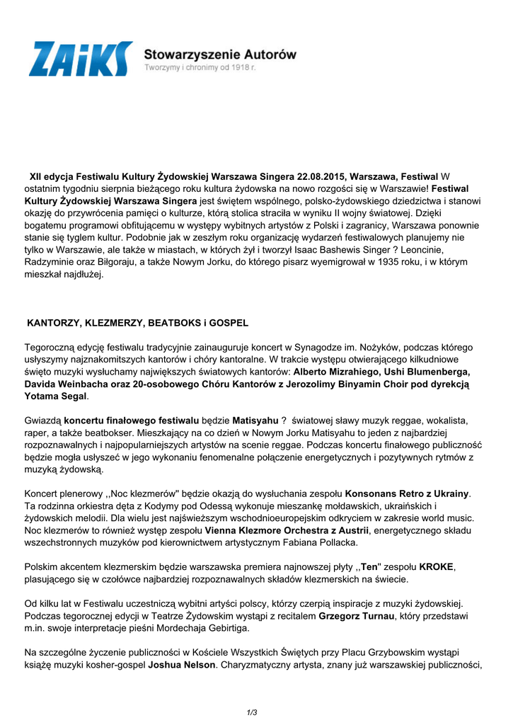 XII edycja Festiwalu Kultury Żydowskiej Warszawa Singera 22.08.2015, Warszawa, Festiwal W ostatnim tygodniu sierpnia bieżącego roku kultura żydowska na nowo rozgości się w Warszawie! Festiwal Kultury Żydowskiej Warszawa Singera jest świętem wspólnego, polsko-żydowskiego dziedzictwa i stanowi okazję do przywrócenia pamięci o kulturze, którą stolica straciła w wyniku II wojny światowej. Dzięki bogatemu programowi obfitującemu w występy wybitnych artystów z Polski i zagranicy, Warszawa ponownie stanie się tyglem kultur. Podobnie jak w zeszłym roku organizację wydarzeń festiwalowych planujemy nie tylko w Warszawie, ale także w miastach, w których żył i tworzył Isaac Bashewis Singer ? Leoncinie, Radzyminie oraz Biłgoraju, a także Nowym Jorku, do którego pisarz wyemigrował w 1935 roku, i w którym mieszkał najdłużej. KANTORZY, KLEZMERZY, BEATBOKS i GOSPEL Tegoroczną edycję festiwalu tradycyjnie zainauguruje koncert w Synagodze im. Nożyków, podczas którego usłyszymy najznakomitszych kantorów i chóry kantoralne. W trakcie występu otwierającego kilkudniowe święto muzyki wysłuchamy największych światowych kantorów: Alberto Mizrahiego, Ushi Blumenberga, Davida Weinbacha oraz 20-osobowego Chóru Kantorów z Jerozolimy Binyamin Choir pod dyrekcją Yotama Segal. Gwiazdą koncertu finałowego festiwalu będzie Matisyahu ? światowej sławy muzyk reggae, wokalista, raper, a także beatbokser. Mieszkający na co dzień w Nowym Jorku Matisyahu to jeden z najbardziej rozpoznawalnych i najpopularniejszych artystów na scenie reggae. Podczas koncertu finałowego publiczność będzie mogła usłyszeć w jego wykonaniu fenomenalne połączenie energetycznych i pozytywnych rytmów z muzyką żydowską. Koncert plenerowy ,,Noc klezmerów'' będzie okazją do wysłuchania zespołu Konsonans Retro z Ukrainy. Ta rodzinna orkiestra dęta z Kodymy pod Odessą wykonuje mieszankę mołdawskich, ukraińskich i żydowskich melodii. Dla wielu jest najświeższym wschodnioeuropejskim odkryciem w zakresie world music. Noc klezmerów to również występ zespołu Vienna Klezmore Orchestra z Austrii, energetycznego składu wszechstronnych muzyków pod kierownictwem artystycznym Fabiana Pollacka. Polskim akcentem klezmerskim będzie warszawska premiera najnowszej płyty ,,Ten'' zespołu KROKE, plasującego się w czołówce najbardziej rozpoznawalnych składów klezmerskich na świecie. Od kilku lat w Festiwalu uczestniczą wybitni artyści polscy, którzy czerpią inspiracje z muzyki żydowskiej. Podczas tegorocznej edycji w Teatrze Żydowskim wystąpi z recitalem Grzegorz Turnau, który przedstawi m.in. swoje interpretacje pieśni Mordechaja Gebirtiga. Na szczególne życzenie publiczności w Kościele Wszystkich Świętych przy Placu Grzybowskim wystąpi książę muzyki kosher-gospel Joshua Nelson. Charyzmatyczny artysta, znany już warszawskiej publiczności, 1/3 zaprezentuje swój nowy projekt tworzony wspólnie z nowojorskimi muzykami oraz Sienna Gospel Choir z Warszawy. Organizatorzy są otwarci również na nowe projekty muzyczne, w tym te o charakterze eksperymentalnym, skierowane do młodego, wytrawnego słuchacza. Na szczególną uwagę zasługuje The Rose Ausländer Project w wykonaniu zespołu Sadawi z Niemiec, którego twórcą i inicjatorem jest wybitny muzyk Paul Brody, na stałe mieszkający w Berlinie, a także koncert Katy Carr brytyjskiej piosenkarki polskiego pochodzenia, muzyka, liderki zespołu ,,Katy Carr and the Aviators''. W swojej twórczości często nawiązuje do fascynującej ją polskiej kultury i historii. Swoją ostatnią płytę ,,Paszport'' poświęciła bohaterom i wydarzeniom II wojny światowej. Swoje awangardowe adaptacje przedstawią również czołowi młodzi muzycy, reprezentujący tzw. nurt Nowej Muzyki Żydowskiej, m.in. Karolina Cicha oraz Raphael Rogiński. SINGER JAZZ FESTIWAL po raz drugi Szczególne znaczenie muzyki jazzowej na Festiwalu Warszawa Singera potwierdza fakt kontynuacji cyklu Singer Jazz Festiwal. Dyrektorem artystycznym cyklu jest Adam Baruch, światowej sławy krytyk muzyczny, organizator i działacz, współtworzący scenę muzyczną już od kilku dziesięcioleci. W programie jazzowym zaprezentują się: Kuba Stankiewicz Trio odkrywające twórczość Bronisława Kapera, bracia Oleś, Jazzpospolita, trio Jachna/Tarwid/Karch, duet Sławomir Pezda/Mateusz Gawęda, Elma. Gwiazdą jazzowej odsłony Festiwalu Warszawa Singera będzie wybitny izraelski jazzman, saksofonista Albert Beger. TEATRALNE AKCENTY Warszawa Singera nie ogranicza się tylko do muzyki. Festiwal to także miejsce na pokazy spektakli oraz małych form teatralnych. ,,Głowa pełna ptaków'' w reż. Mottiego Awerbucha (Izrael) z udziałem wybitnych izraelskich aktorów Uri Kowalskiego oraz Anabelli czy ,,Dybuk'' w reżyserii Mai Kleczewskiej, to tylko niektóre przykłady działań teatralnych, których doświadczymy na zakończenie lata. SINGER NA PLACU DEFILAD Nowością XII edycji festiwalu będzie włączenie w obszar działań terenu przed Pałacem Kultury i Nauki, miejscem które przed wojną tętniło żydowskim życiem. Dnia 22 sierpnia, wspólnie z inicjatywą Plac Defilad, zapraszamy na całodniowe spotkanie z kulturą żydowską, m.in. spektakl w reż. Anny Smolar ,,Aktorzy żydowscy'', debatę ,,My Żydzi polscy XXI wieku'' oraz koncert Marka Dyjaka, zainspirowany muzyką żydowską. Zabierzemy publiczność w spacer po Placu Defilad, w którym spróbujemy odtworzyć obraz terenu i przedwojenny układ ulic, zanim stanął tam Pałac Kultury i Nauki. W ogrodzie na Placu Defilad planujemy również zasadzić 7 sadzonek symbolizujących 7 płodów ziemi Izraela (winogrono, figa, daktyle, jęczmień, pszenica, granat, oliwka). Spotkanie na Placu Defilad zakończymy uroczystą Hawdalą z udziałem wybitnych kantorów. W niedzielę 23 sierpnia zapraszamy na skwer przy Centrum Kultury Jidysz (ul. Andersa 15), gdzie przez cały dzień trwał b