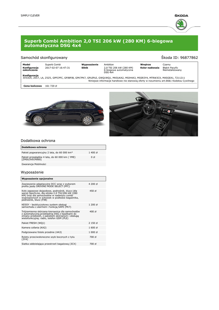 Superb Combi Ambition 2,0 TSI 206 kW (280 KM) 6-biegowa automatyczna DSG 4x4 Samochód skonfigurowany Model Konfiguracja zakończona Superb Combi 2017-02-07 16:47:31 Škoda ID: 96877862 Wyposażenie Silnik Ambition 2,0 TSI 206 kW (280 KM) 6-biegowa automatyczna DSG 4x4 Wnętrze Kolor nadwozia Czarny Błękit Pacyfic Niemetalizowany Konfiguracja 3V53UX, 2017, LA, Z5Z5, GPFCPFC, GPJBPJB, GPK7PK7, GPLEPLE, GWQ1WQ1, MKSUKA2, MSIH4A3, MSSR3Y4, MTRW3CX, MASGEA1, T211211 Niniejsze informacje handlowe nie stanowią oferty w rozumieniu art.66&1 Kodeksu Cywilnego Cena końcowa 161 720 zł Dodatkowa ochrona Dodatkowa ochrona Pakiet pogwarancyjny 2 lata, do 60 000 km* Pakiet przeglądów 4 lata, do 60 000 km ( YME) [ZMSU3V014060] 1 400 zł 0 zł Gwarancja Mobilności Wyposażenie Wyposażenie opcjonalne Zawieszenie adaptacyjne DCC wraz z wyborem profilu jazdy DRIVING MODE SELECT (PFC) Koło zapasowe dojazdowe, podnośnik, klucz (dla wersji SportLine, dla silnika 2.0 TSI/206 kW (280 KM) oraz dla samochodów w nadwoziu combi wyposażonych w schowek w podłodze bagażnika, podnośnik, klucz (PJB) KESSY - bezkluczykowy system obsługi samochodu z alarmem i funkcją SAFE (PK7) Trójramienna skórzana kierownica dla samochodów z automatyczną przekładnią DSG z łopatkami do zmiany przełożeń, z pakietem skórzanym i obsługą wielofunkcyjną: radio, telefon GSM (PLE) 4 200 zł 450 zł 1 200 zł 400 zł Pakiet FRESH (WQ1) 2 150 zł Kamera cofania (KA2) 1 600 zł Podgrzewane fotele przednie (4A3) 1 000 zł Rolety przeciwsłoneczne szyb bocznych z tyłu (3Y4) 700 zł Siatka oddzielająca przestrzeń bagażową (3CX) 700 zł Finansowanie Rodzaj finansowania ŠKODA Kredyt Niskich Rat Parametry finansowe Wkład własny - kwota 40 430 zł Ubezpieczenie komunikacyjne za 1 rok (finansowane) 77 140 zł 3 opcje zakończenia kredytowania: 1) jednorazowa spłata raty finalnej 2) rozłożenie raty finalnej na raty miesięczne 3) przekazanie pojazdu do Dealera i rozliczenie raty finalnej 4 852 zł Rata miesięczna 1616 zł Opcje zakończenia Rata finalna Nota prawna ŠKODA Kredyt Niskich Rat - Rzeczywista Roczna Stopa Oprocentowania (RRSO) wynosi 7,41%, całkowita kwota kredytu (bez kredytowanych kosztów) to 55 200 zł, całkowita kwota do zapłaty 67 714zł, oprocentowanie zmienne 1,69%, całkowity koszt kredytu 12 514zł (w tym: prowizja 3 070zł, odsetki 3 242 zł, ubezpieczenie komunikacyjne na 1. rok 2 464 zł, ubezpieczenie spłaty kredytu 3 737zł), 48 miesięcznych rat równych po 778 zł; rata finalna 30 383 zł. Kalkulacja została dokonana na dzień 01.10.2016 na reprezentatywnym przykładzie. Oferta na wybrane modele ŠKODY przy skorzystaniu z ubezpieczenia komunikacyjnego i ubezpieczenia spłaty kredytu oferowanych przez Volkswagen Serwis Ubezpieczeniowy Sp. z o.o. Niniejsza informacja nie stanowi oferty w rozumieniu Kodeksu cywilnego. Dostępność i warunki produktu mogą ulec zmianie. Warunki produktu określa umowa. © ŠKODA AUTO, Volkswagen Group Polska Sp. z o.o. Zastrzeżenie Page 2 of 2