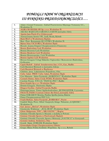 POMOGLI NAM W ORGANIZACJI III PIKNIKU PRZEDSIĘBORCZOŚCI…. 1. 2. 3. 4. 5. 6. 7. 8. 9. 10. 11. 12. 13. 14. 15. 16. 17. 18. 19. 20. 21. 22. 23. 24. 25. 26. 27. 28. 29. 30. 31. 32. 33. 34. 35. 36. 37. 38. 39. 40. 41. 42. Adam i Gerard Tomaszny Zakład Przetwórstwa Mięsnego Tomaszny S.C., Wodzisław Śl. AGRO-WODZISŁAW Sp. z o.o. Wodzisław Śl. AKUKU BAJECZNA KRAINA ZABAW Jastrzębie Zdrój Apteka Jana Pawła II w Głubczycach Autoryzowany Serwis VW, Audi, Skoda, Rybnik Bank BGŻ w Wodzisławiu Śląskim Beer Piotr Restauracja QUATTRO, Wodzisław Śl. Bęben Nina VICTORIA, Wodzisław Śląski Boczek Joanna Ekspert Ubezpieczeniowo-Finansowy Branża Budowlana Cech Wodzisław Branża Drzewna Cech Wodzisław Branża Metalowa Cech Wodzisław Branża Motoryzacyjna Cech Wodzisław Branża Ogólna Cech Wodzisław Brzoza Grzegorz Usługi Malarsko-Tapicerskie i Remontowo-Budowlane, Gołkowice Capek Rudolf Zakład Instalatorstwa San. i CO., Gaz., Radlin Cech Rzemiosł Różnych w Jastrzębiu Zdroju Cech Rzemiosł Różnych w Raciborzu Chlebisz Jerzy Lakiernictwo Pojazdowe, Olza Cichy Adam PBHU Cichy Adam, Wodzisław Śląski Cios Marzena Salon Fryzjerski „MARZENA”, Wodzisław Śląski Cyranek Hanna Salon Urody POSH, Wodzisław Śląski Czesław Pyszny P.P.U.H. “INSTAL-PEC”, Radlin Dom Książki Sp.z o.o. Wodzisław Śląski Domin Grzegorz Pawłowice Śląskie Dragon Ewelina Zakład Fryzjerski, Radlin Dzierżęga Janusz Firma Ogólnobudowlana „BUDMAJSTER, Czyżowice FIGLOLANDIA Centrum Zabaw dla Dzieci, Jastrzębie Zdrój Firma CERAMOT Motyka, Pawlica Spółka Jawna, Buków Firma Ubezpieczeniowa PZU S.A. Fojcik Barbara Salon Fryzjerski „BARBARA”, Pszów Gajdzik Maria, Piotr, Alfred Kacprzyk, Kinga Piekarnia „GAJDZIK”, Wodzisław Śl. Gaś Janusz „McGaś”, Wodzisław Śląski Gienieczko Waldemar „WAL-BUD”, Wodzisław Śląski Glenc Małgorzata FHU „ MK GLENC ”, Rogów Gminny Ośrodek Sportu w Mszanie z siedzibą w Połomi Gminny Ośrodek Sportu w Pawłowicach Śląskich Gminny Ośrodek Turystyki, Sportu i Rekreacji „NAUTICA” w Gorzycach Gonsior Andrzej Stolarstwo, Olza Gowik Maria JUBILER, Wodzisław Śląski Górnośląska Grupa Ubezpieczeniowa, Gliwice Grupa Allianz Polska Koliński i Wspólnicy Sp. z o.o., Rybnik 43. 44. 45. 46. 47. 48. 49. 50. 51. 52. 53. 54. 55. 56. 57. 58. 59. 60. 61. 62. 63. 64. 65. 66. 67. 68. 69. 70. 71. 72. 73. 74. 75. 76. 77. 78. 79. 80. 81. 82. 83. 84. 85. 86. 87. 88. 89. Grzybacz Stefan Stolarstwo, Turzyczka Grzywacz Kazimierz Kancelaria Radcy Prawnego w Gorzycach Guzy Michael Futra i Moda, Wodzisław Śląski Harnasz Aleksander Przedsiębiorstwo Handlowo – Usługowe, Radlin Hipermarket AUCHAN w Żorach Holona Józef Zakład Kamieniarski „ JOZ-MAR ”, Mszana Hübscher Gabriela Pracownia florystyczna ORCHIDEA, Wodzisław Śląski Hurtownia Papiernicza „KABUT”, Pszów Jabłoński Bernadeta i Marek Sklep Ogólnospożywczy S.C., Chałupki Janeta Ernestyn Zakład Rzeźniczo-Wędliniarski, Lubomia Jasiak Jolanta i Jan Cukiernictwo i Mała Gastonomia S.C., Wodzisław Śląski Jędrzejewska Sylwia Zakład Fryzjerski „AGATA”, Pszów Jureczka Jerzy Staropolska, Mszana Kałuża Eryk Przetwórstwo Mięsno-Wędliniarski, Rogów Kamczyk Anna Zakład Fryzjerski, Wodzisław Śląski KAUFLAND Wodzisław Śląski Kiermaszek Irena Zakład Fryzjerski, Wodzisław Śląski Kiermaszek Urszula Salon Fryzjerski, Gołkowice Klapuch Jan Piekarnictwo, Skrzyszów Klimek Edyta Szkoła Pływania SZKRAB, Wodzisław Śląski Knesz Krzysztof Salon Fryzjerski „ Le Cler”, Jastrzębie Zdrój Kodura Agnieszka Zakład Fryzjerski, Pszów Kolorz Krzysztof AmeWi-Bruk Usługowo brukarskie i ogólnobudowlane, Krzyżanowice Kołek Lucjan „ ARTEL ” Hurtownia Art. Elektrycznych, Wodzisław Śląski Komarek Henryk ADEX STOLARNIA KOMAREK, Turza Śl. Konieczny –Freund Bożena Niepubliczny Zakład Opieki Zdrowotnej Praktyka Lekarza Rodzinnego Specjalistyczna i Medycyny Pracy, Rydułtowy Konieczny Helena „VENA ” Salon Fryzjerski, Wodzisław Śląski Konieczny Marek Piekarnia JO-MAR, Pawłowice Śląskie Kowalski Józef F.H.U. Betoniarstwo–Kamieniarstwo, Wodzisław Śląski Kristof Emilia Firma Rodzinna Sp. z o.o., Rybnik Kuchta Danuta Zakład Fryzjerski, Rydułtowy Kucza Krzysztof FPHU EUROCLAS, Czyżowice Kuczaty Janusz Przedsiębiorstwo Komunalne „EKO-GLOB”, Bełsznica Kuczera Adam PHU „KAMARK ”,Wodzisław Śląski Kuczka Franciszka Mechanika Pojazdowa, Czyżowice Kühn Tomasz Zakład Masarsko–Wędliniarski, Rogów Kurant Krzysztof Elektromechnika Pojazdowa, Radlin Kwietniewski Tomasz Zakład Produkcyjno – Usługowy „INSTALATOR”, Wodzisław Śląski Loranc Katarzyna Salon Fryzjerski, Rydułtowy Lupa Barbara Salon Fryzjersko-Kosmetyczny „BARBARA”, Syrynia Macha Adam P.P.U.H. „ELMACH”, Wodzisław Śląski Masarczyk Piotr Galeria Fryzur, Rydułtowy Michalski Wojciech Firma Gastronomiczno – Handlowa AS, Wodzisław Śl. Mikos Stanisław PPHU MIXPOL, Czyżowice MKS ODRA Wodzisław Śląski S.A MOSiR CENTRUM w Wodzisławiu Śląskim MOSiR Radlin 90. 91. 92. 93. 94. 95. 96. 97. 98. 99. 100. 101. 102. 103. 104. 105. 106. 107. 108. 109. 110. 111. 112. 113. 114. 115. 116. 117. 118. 119. 120. 121. 122. 123. 124. 125. 126. 127. 128. 129. 130. 131. 132. 133. 134. Musioł Damian F.P.U.H. „DAMET”, Wodzisław Śląski Muszer Bernard Cukiernictwo-Piekarnictwo, Radlin Nielaba Arkadiusz Mechanika Pojazdowa, Rogów Nogły Stefan STITCHES-NOGŁY, Rydułtowy Nosiadek Stanisława Agencja Ubezpieczeniowa PZU nr 6 PZU S.A., Radlin Nowiny Wodzisławskie Obrębska Joanna Galeria fryzur, Rydułtowy Olszar Michał Firma „INSTAL-EKO”, Rogów Olszar Krzysztof Pracownia Złotnicza, Wodzisław Śląski Otawa Marian Zakład Remontowo-Budowlany, Wodzisław Śl. P.T.H.U. MATUSZEK Sp. Jawna Wodzisław Śląski Parchański Irena i Mirosław Szkółka Krzewów Ozdobnych, Wodzisław Śl. Paruzel Jolanta Zakład Fryzjerski, Rydułtowy Pawłowski Grzegorz Zakład 
