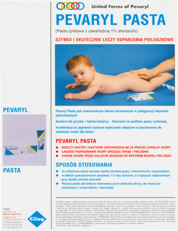 Gl rB1J[) United Forms of Pevaryl PEVARYL PASTA PEVARYL Pevaryl Pasta jest nowoczesnym lekiem stosowanym w pielęgnacji odparzeń pieluszkowych. Zawiera lek grzybo- i bakteriobójczy - Ekonazol na podłożu pasty cynkowej. Kombinacja ta zapewnia szybsze wyleczenie odparzeń w porównaniu do zwykłych maści dla dzieci. PEVARYL PASTA • • • NISZCZY GRZYBY I BAKTERIE ODPOWIEDZIALNE ZA PROCES ZAPALNY SKÓRY ŁAGODZI PODRAŻNIENIE SKÓRY ZNOSZĄC ŚWIĄD I PIECZENIE CHRONI SKÓRĘ PRZED DALSZYM DRAŻNIĄCYM WPŁYWEM MOKREJ PIELUSZKI SPOSÓB STOSOWANIA PASTA • • • CILAG a division ot ~f"'''''''n..guf"""", Poland, Ltd. ul. Marconich 9 m. 2 02-954 Warszawa tel. (02) 642 96 46 tel. (02) 642 96 46 • • • na zmienioną skórę nanieść cienką warstwę pasty i równomiernie rozprowadzić w lekkich podrażnieniach stosować 1-2 razy dziennie, w cięższych odparzeniach przy każdej zmianie pieluszki Pevaryl pasta jest dobrze tolerowana przez delikatną skórę, lek może być stosowany u noworodków i niemowląt. PEVARYL pasta: Leczenie grzybic umiejscowionych w fałdach skórnych, np. pieluszkowego zapalenia skóry. WŁAŚCIWOŚCI: Pasta Pevaryl zawiera wysoce skuteczny lek przeciwgrzybiczy - econazole nitrate oraz tlenek cynku posiadający łagodne właściwości dezynfekujące. Forma pasty gwarantuje dobre przyleganie preparatu, nawet do sączących zmian skórnych; wskutek tego dermatofity i bakterie są niszczone bardzo szybko i skutecznie. Świąd i pieczenie - objawy towarzyszące grzybicom skóry całkowicie ustępują w ciągu kilku dni; zaczerwienie zapalne trwale zanika. Pasta Pevaryl jest dobrze tolerowana nawet przez delikatną skórę. WSKAZANIA: Grzybice wyprzeniowe, m.in. suche i sączące pieluszkowe zapalenie skóry. PRZECIWWSKAZANIA: Nieznane. STOSOWANIE: Nałóż pastę Pevaryl na zmienione chorobowo miejsca raz, lub kilka razy dziennie, zgodnie z zaleceniem lekarza. Kontynuuj kurację, aż do całkowitego wyleczenia zmian skórnych. TRWAŁOŚĆ: Pasta Pevaryl charakteryzuje się znaczną trwatością przy przechowywaniu w temperaturze pokojowej (15-30 Cj. Preparat może być używany do końca okresu jego ważności> Ważn. miesiąc/rok< podanego na każdym opakowaniu. SKŁAD: Azotan ekonazolu: 10 mg, Zinci oxydati 100 mg, Antitox.: butyl hydroxyanilosum (E 320), Aromatica Excip. ad pastam pro 1 g. OPAKOWANIE: Tubki po 30 g. Dostępny w aptekach z przepisu lekarza. CILAG AG - Schaffhausen, Szwajcaria.