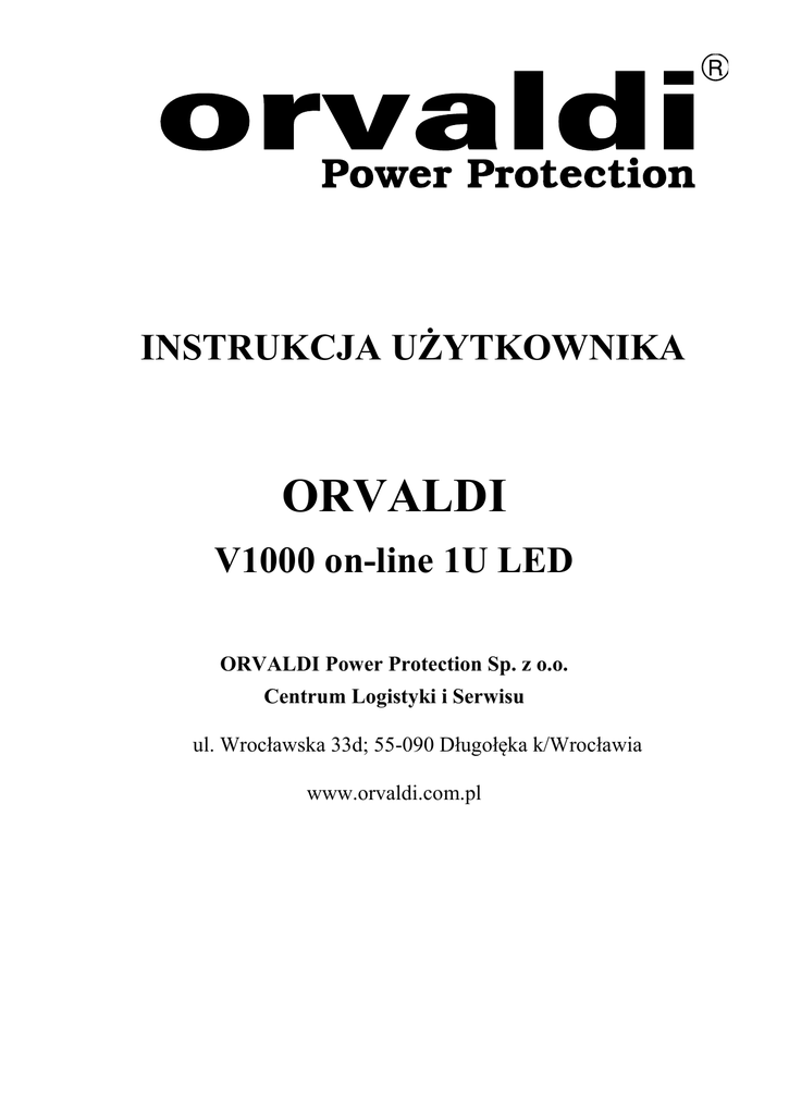 INSTRUKCJA UŻYTKOWNIKA ORVALDI V1000 on-line 1U LED ORVALDI Power Protection Sp. z o.o. Centrum Logistyki i Serwisu ul. Wrocławska 33d; 55-090 Długołęka k/Wrocławia www.orvaldi.com.pl 1. Zasady bezpieczeństwa Proszę postępować zgodnie z ostrzeżeniami zawartymi w instrukcji obsługi. Zapoznaj się z instrukcją obsługi przed podłączeniem urządzenia, zachowaj instrukcję na przyszłość. Przed przeczytaniem wszystkich informacji dotyczących bezpieczeństwa i działanie nie należy uruchamiać zasilacza. 1-1. Transport Proszę przewozić UPS-a w oryginalnym opakowaniu co pozwoli zabezpieczyć go przed uszkodzeniem. 1-2. Przygotowanie do podłączenia ● Podczas przenoszenia UPS-a z chłodnego pomieszczenia do miejsca gdzie temperatura jest wyższa może wystąpić zjawisko kondensacji. UPS musi być bezwzględnie suchy przed podłączeniem. Proszę odczekać przynajmniej cztery godziny przed instalacją. ● Nie ustawiaj UPS-a w pobliżu wody lub w pomieszczeniu o podwyższonej wilgotności. ● Nie ustawiaj zasilacza w pobliżu źródeł ciepła lub w miejscu gdzie będzie narażony na bezpośrednie działanie promieni słonecznych. ● Nie zakrywaj otworów wentylacyjnych UPS-a. 1-3. Instalacja ● Nie podłączaj do UPS-a urządzeń, które mogą go przeciążyć (drukarka laserowa, skaner, suszarka do włosów, odkurzacz itp.) ● Ułóż przewody zasilające i wyjściowe w taki sposób aby nikt po nich nie chodził ani się o nie nie potknął. Używaj wyłącznie nieuszkodzonych przewodów. ● Podłącz UPS-a do gniazda sieciowego z uziemieniem. 1-4. Działanie ● Nie należy odłączać przewodu zasilającego od gniazda zasilającego podczas pracy zasilacza ponieważ pozbawiasz go i urządzenia podłączone do jego wyjścia uziemienia. ● Zasilacz UPS posiada własne, wewnętrzne źródło prądu (akumulatory).Gniazda wyjściowe UPS mogą być pod napięciem, nawet jeśli UPS nie jest podłączony do gniazdka zasilającego instalacji elektrycznej w budynku. ● Jeśli chcesz odłączyć UPS-a od sieci zasilającej przyciśnij przycisk off, po wyłączeniu UPS-a odłącz przewód zasilający od gniazda zasilającego. ● Upewnij się, że do wnętrza zasilacza nie dostaną się płyny lub inne ciała obce. 1-5. Konserwacja, serwis i usterki. ● Zasilacz UPS generuje niebezpieczne napięcie, wszelkie naprawy mogą być wykonane wyłącznie przez wykwalifikowany personel serwisowy. ● Uwaga - niebezpieczeństwo porażenia prądem elektrycznym. Nawet po odłączeniu urządzenia od sieci zasilającej elementy wewnątrz zasilacza UPS nadal podłączone są do akumulatora i niebezpieczne elektrycznie. ● Przed przystąpieniem do jakichkolwiek czynności serwisowych, konserwacji lub transportu należy odłączyć baterie i rozładować kondensatory DC-BUS poprzez przytrzymanie przycisku „on/mute” aż do wygaszenia wyświetlacza LCD. ● Wymianę akumulatorów może wykonać wyłącznie osoba posiadająca odpowiednią wiedzę z zakresu elektryki/elektroniki. Osoby nieupoważnione należy trzymać z dala od baterii. ● Uwaga - niebezpieczeństwo porażenia prądem elektrycznym. Obwód akumulatorów nie jest odizolowany od napięcia wejściowego. Mogą występować niebezpieczne napięcia między zaciskami akumulatora i uziemieniem. Przed dotknięciem należy upewnić się, że napięcie nie występuje! ● Akumulatory mogą spowodować porażenie prądem i mają wysoki prąd zwarciowy. Proszę zastosować środki zapobiegawcze określone poniżej oraz wszelkie inne środki niezbędne podczas pracy z akumulatorami: - zdjąć zegarek, obrączkę/pierścionek inne metalowe przedmioty, - używaj izolowanych narzędzi. ● Baterie należy wymienić na takiego samego typu i jednakową ilość. ● Nie wolno wrzucać baterii do ognia. Może to spowodować eksplozję baterii. ● Nie wolno otwierać lub niszczyć akumulatorów. Wyciekający elektrolit może spowodować podrażnienia dla skóry i oczu. Elektrolit jest toksyczny. ● Proszę wymienić bezpiecznik tylko na tego samego rodzaju i natężenia prądu w celu uniknięcia ryzyka pożaru. ● Nie rozbieraj zasilacza UPS na części. 2. Instalacja i konfiguracja. UWAGA: Przed przystąpieniem do montażu, należy obejrzeć urządzenie. Upewnij się, że zasilacz nie jest uszkodzony mechanicznie. Proszę zachować oryginalne opakowanie w bezpiecznym miejscu do wykorzystania w przyszłości. 2-1. Panel tylny: 1. 2. 4. 5. 6. Gniazdo zasilające AC. Gniazda wyjściowe: podłączyć do obciążeń o znaczeniu krytycznym Port komunikacyjny USB. Złącze ROO/RPO Port inteligentny (SNMP, AS400) 2-2. Podłączenie UPS-a Krok 1: Podłączenie zasilania do UPS-a Podłącz UPS-a do gniazda sieciowego z uziemieniem, unikaj przedłużania przewodów. Krok 2: Podłączenie odbiorów do UPS-a Na tylnym panelu znajdują się gniazda wyjściowe. Podłącz do nich urządzenia, które chcesz zabezpieczyć. Krok 3: Komunikacja z UPS-em Porty komunikacyjne: Port USB Inteligentny slot Aby umożliwić nienadzorowane wyłączenie/włączenie UPS-a i monitorowania stanu, należy podłączyć kabel komunikacyjny do portu USB i do portu komunikacyjnego w komputerze. Po zainstalowaniu oprogramowania do monitorowania, można wyłączenia/włączenia UPS-a, monitorowanie stanu zasilacza UPS poprzez PC. zaplanować UPS jest wyposażony w inteligentny slot do podłączenia karty SNMP lub AS400. Pozwala to na zaawansowaną komunikację z UPS-em i rozszerzone opcje monitoringu. Krok 4: Funkcja ROO/RPO ROO – Remote on/off – zdalne włączenie/wyłączenie UPS-a. Rozłączenie zworki: wyłączenie zasilacza. Zamkniecie zworki: uruchomienie UPS-a, pod warunkiem obecności zasilania AC. Użycie przycisku on/off jest nadrzędne i powoduje anulowanie komunikatu ROO. RPO – Remote power off – awaryjne wyłączenie zasilacza. Rozłączenie zworki powoduje natychmiastowe wyłączenie UPS-a (dioda LED 3 będzie włączona). Celem powrotu do normalnej pracy