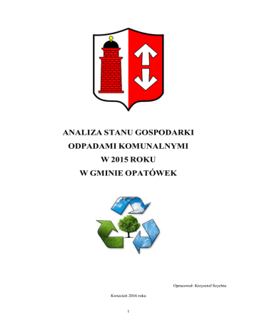 ANALIZA STANU GOSPODARKI ODPADAMI KOMUNALNYMI W 2015 ROKU W GMINIE OPATÓWEK Opracował: Krzysztof Szychta Kwiecień 2016 roku 1 I. Wstęp 1.1 Cel analizy. Niniejszy dokument stanowi roczną analizę stanu gospodarki odpadami komunalnymi na terenie gminy Opatówek, sporządzony w celu weryfikacji możliwości technicznych i organizacyjnych gminy w zakresie gospodarowania odpadami komunalnymi. 1.2. Podstawa prawna sporządzenia analizy. Analiza przygotowana w oparciu o art. 3 ust. 2 pkt 10 ustawy z dnia 13 września 1996 r. o utrzymaniu czystości i porządku w gminach (tj. Dz. U. z 2016 roku, poz. 250), gdzie określony został wymagany zakres takiej analizy. Zakres przedmiotowej analizy częściowo pokrywa się z rocznym sprawozdaniem z realizacji zadań z zakresu gospodarowania odpadami komunalnymi, sporządzanym przez Wójta Gminy Opatówek, na podstawie art. 9q ust. 1 i 3 ustawy o utrzymaniu czystości i porządku w gminach, celem jego przedłożenia Marszałkowi Województwa Wielkopolskiego oraz Wojewódzkiemu Inspektorowi Ochrony Środowiska w Poznaniu w terminie do 31 marca roku następującego po roku, którego dotyczy. 1.3. Regulacje prawne z zakresu gospodarowania odpadami. Przy sporządzaniu niniejszej analizy opierano się również o następujące dokumenty: Plan Gospodarki Odpadami dla Województwa Wielkopolskiego na lata 2012-2017, Aktualizacja Krajowego planu gospodarki odpadami, Ustawa z dnia 14 grudnia 2012 r. o odpadach, Rozporządzenie Ministra Środowiska z dnia 25 maja 2012 r. ws. Poziomów ograniczenia masy odpadów komunalnych ulegających biodegradacji przekazywanych do składowania oraz sposobu obliczenia poziomu ograniczenia masy tych odpadów, Rozporządzenie Ministra Środowiska z dnia 29 maja 2012 r. ws. Poziomów recyklingu, przygotowania do ponownego użycia i odzysku innymi metodami niektórych frakcji odpadów komunalnych, Rozporządzenie Ministra Środowiska z dnia 15 maja 2012 r. ws. Wzorów sprawozdań o odebranych odpadach komunalnych, odebranych nieczystościach ciekłych oraz realizacji zadań z zakresu gospodarki odpadami komunalnymi, Rozporządzenie Ministra Środowiska z dnia 11 września 2012 r. ws. mechanicznobiologicznego przetwarzania zmieszanych odpadów komunalnych, Rozporządzenie Ministra Środowiska z dnia 8 grudnia 2010 r ws. Wzorów dokumentów stosowanych na potrzeby ewidencji odpadów, Rozporządzenie ministra Środowiska z dnia 27 września 2001 r ws. Katalogu odpadów, Uchwały Rady Gminy Opatówek. II. Źródła powstawania odpadów komunalnych. Ustawa o odpadach określa odpady komunalne jako odpady powstające w gospodarstwach domowych. Do wspomnianych odpadów nie zalicza się pojazdów wycofanych z eksploatacji, a także odpadów niezawierających odpadów niebezpiecznych pochodzących od innych wytwórców odpadów, które ze względu na swój charakter lub skład są podobne do odpadów powstających w gospodarstwach domowych. Odpady komunalne powstają również na terenach nieruchomości niezamieszkałych, takich 2 jak obiekty użyteczności publicznej (tereny administrowane przez gminę), np. odpady z koszy ulicznych, odpady z placów targowych, parków, etc. III. Usługi związane z gospodarowaniem odpadami na terenie Gminy Opatówek. 3.1. Przedsiębiorstwa świadczące usługę odbioru odpadów z nieruchomości zamieszkałych. Na terenie Gminy Opatówek w 2015 roku odbiorem i zagospodarowaniem odpadów komunalnych zajmowały się 2 firmy. Do 30 czerwca usługę świadczyło Przedsiębiorstwo Oczyszczania Miasta EKO Sp. z o.o., natomiast od 1 lipca 2015 roku, po przeprowadzonym przetargu jest to Firma Usługowo Handlowa "Jartex" Szczepan Jarantowski. 3.2. Sposoby gromadzenia odpadów na terenie gminy. Zbieranie odpadów w sposób selektywny stanowi podstawowy element systemu gospodarki odpadami. Na terenie Gminy Opatówek była i jest prowadzona selektywna zbiórka w podziale na poszczególne frakcje: szkło (worek zielony), tworzywa sztuczne, metale i opakowania wielomateriałowe (worek żółty), papier i tekturę (worek niebieski), ponadto właściciel nieruchomości może oddać również odpady zielone (worek brązowy), oraz drobne odpady budowlane i rozbiórkowych (do 50 kg.). Dodatkowo w okresie grzewczym (od 1 listopada do 31 marca) istnieje, możliwość oddania raz w miesiącu dodatkowego pojemnika z popiołem. 3.3. Częstotliwość odbioru odpadów komunalnych. Odbiór odpadów selektywnie zebranych z zabudowy jednorodzinnej - raz w miesiącu (możliwość oddania dowolnej ilości worków z logo firmy świadczącej usługę), odbiór odpadów selektywnie zebranych z zabudowa wielorodzinna - raz w miesiącu opróżniane pojemniki typu "Iglo", bądź na zgłoszenie w razie przepełnienia, odbiór odpadów zmieszanych (opróżnianie pojemników) co dwa tygodnie odbiór odpadów zmieszanych z budynków wielorodzinnych - raz w tygodniu. Zgodnie z ustawą zmieszane odpady komunalne, oraz odpady zielone muszą być przekazywane wyłącznie do regionalnych instalacji przekształcania odpadów komunalnych, w naszym przypadku jest to ZUOK Orli Staw, Orli Staw 2, 62-834 Ceków. (Szczegółowe zestawienie komu i gdzie przekazano odpady w tab. str.7-10). Świadczona jest również usługa odbioru odpadów komunalnych takich jak: zużyty sprzęt elektryczny i elektroniczny, zużyte baterie i akumulatory, meble i inne odpady wielkogabarytowe, chemikalia, odpady budowlane i rozbiórkowe oraz inne odpady niebezpieczne. Odbiór w/w odpadów odbywa się co pół roku w sposób zorganizowany. Zgodnie z podanym do publicznej wiadomości harmonogramem mieszkańcy w danym dniu mogą wystawić odpady problemowe, które zostaną odebrane przez firmę. Odpady takie jak przeterminowane leki można oddawać w aptekach, które gmina wyposażyła w specjalne pojemniki do gromadzenia tego typu odpadów. Lokalizacje aptek: Opatówek, ul. Kościelna 1, Opatówek, Plac Wolności 2, Tłokinia Kościelna, ul. Kościelna 14. 3 Rejestr działalno