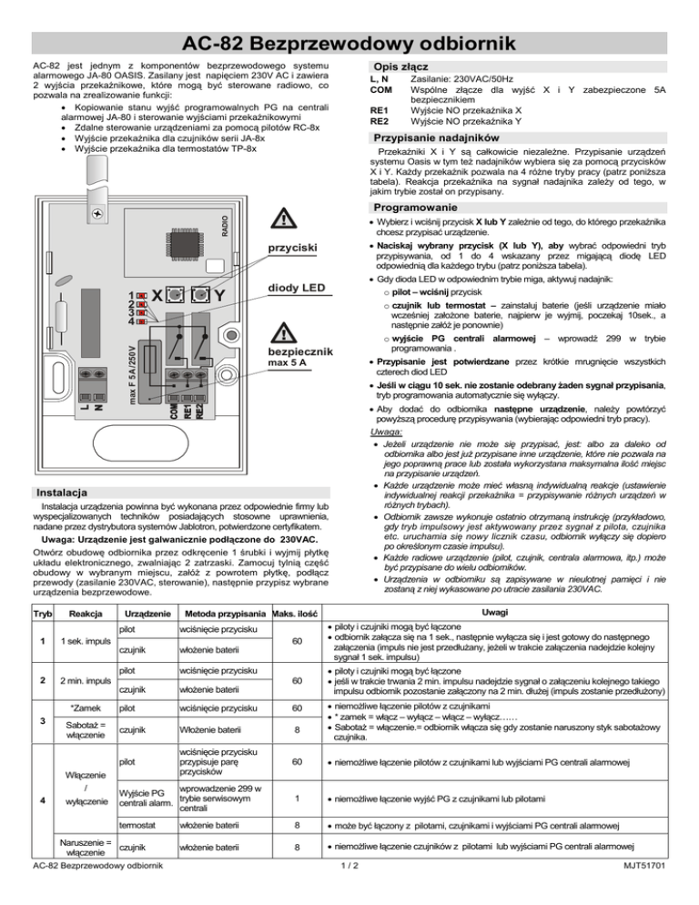 AC-82 Bezprzewodowy odbiornik AC-82 jest jednym z komponentów bezprzewodowego systemu alarmowego JA-80 OASIS. Zasilany jest napięciem 230V AC i zawiera 2 wyjścia przekaźnikowe, które mogą być sterowane radiowo, co pozwala na zrealizowanie funkcji: • Kopiowanie stanu wyjść programowalnych PG na centrali alarmowej JA-80 i sterowanie wyjściami przekaźnikowymi • Zdalne sterowanie urządzeniami za pomocą pilotów RC-8x • Wyjście przekaźnika dla czujników serii JA-8x • Wyjście przekaźnika dla termostatów TP-8x Opis złącz L, N COM RE1 RE2 Zasilanie: 230VAC/50Hz Wspólne złącze dla wyjść X i Y zabezpieczone 5A bezpiecznikiem Wyjście NO przekaźnika X Wyjście NO przekaźnika Y Przypisanie nadajników Przekaźniki X i Y są całkowicie niezależne. Przypisanie urządzeń systemu Oasis w tym też nadajników wybiera się za pomocą przycisków X i Y. Każdy przekaźnik pozwala na 4 różne tryby pracy (patrz poniższa tabela). Reakcja przekaźnika na sygnał nadajnika zależy od tego, w jakim trybie został on przypisany. RADIO Programowanie • Wybierz i wciśnij przycisk X lub Y zależnie od tego, do którego przekaźnika chcesz przypisać urządzenie. • Naciskaj wybrany przycisk (X lub Y), aby wybrać odpowiedni tryb przypisywania, od 1 do 4 wskazany przez migającą diodę LED odpowiednią dla każdego trybu (patrz poniższa tabela). przyciski X Y max F 5 A /250 V 1 2 3 4 • Gdy dioda LED w odpowiednim trybie miga, aktywuj nadajnik: o pilot – wciśnij przycisk diody LED o czujnik lub termostat – zainstaluj baterie (jeśli urządzenie miało wcześniej założone baterie, najpierw je wyjmij, poczekaj 10sek., a następnie załóż je ponownie) o wyjście PG centrali alarmowej – wprowadź 299 w trybie programowania . bezpiecznik • Przypisanie jest potwierdzane przez krótkie mrugnięcie wszystkich czterech diod LED max 5 A • Jeśli w ciągu 10 sek. nie zostanie odebrany żaden sygnał przypisania, tryb programowania automatycznie się wyłączy. • Aby dodać do odbiornika następne urządzenie, należy powtórzyć powyższą procedurę przypisywania (wybierając odpowiedni tryb pracy). Uwaga: • Jeżeli urządzenie nie może się przypisać, jest: albo za daleko od odbiornika albo jest już przypisane inne urządzenie, które nie pozwala na jego poprawną prace lub została wykorzystana maksymalna ilość miejsc na przypisanie urządzeń. • Każde urządzenie może mieć własną indywidualną reakcje (ustawienie indywidualnej reakcji przekaźnika = przypisywanie różnych urządzeń w różnych trybach). • Odbiornik zawsze wykonuje ostatnio otrzymaną instrukcję (przykładowo, gdy tryb impulsowy jest aktywowany przez sygnał z pilota, czujnika etc. uruchamia się nowy licznik czasu, odbiornik wyłączy się dopiero po określonym czasie impulsu). • Każde radiowe urządzenie (pilot, czujnik, centrala alarmowa, itp.) może być przypisane do wielu odbiorników. • Urządzenia w odbiorniku są zapisywane w nieulotnej pamięci i nie zostaną z niej wykasowane po utracie zasilania 230VAC. Instalacja Instalacja urządzenia powinna być wykonana przez odpowiednie firmy lub wyspecjalizowanych techników posiadających stosowne uprawnienia, nadane przez dystrybutora systemów Jablotron, potwierdzone certyfikatem. Uwaga: Urządzenie jest galwanicznie podłączone do 230VAC. Otwórz obudowę odbiornika przez odkręcenie 1 śrubki i wyjmij płytkę układu elektronicznego, zwalniając 2 zatrzaski. Zamocuj tylnią część obudowy w wybranym miejscu, załóż z powrotem płytkę, podłącz przewody (zasilanie 230VAC, sterowanie), następnie przypisz wybrane urządzenia bezprzewodowe. Tryb 1 2 Reakcja pilot wciśnięcie przycisku czujnik włożenie baterii pilot wciśnięcie przycisku 2 min. impuls Sabotaż = włączenie / wyłączenie 60 • piloty i czujniki mogą być łączone • odbiornik załącza się na 1 sek., następnie wyłącza się i jest gotowy do następnego załączenia (impuls nie jest przedłużany, jeżeli w trakcie załączenia nadejdzie kolejny sygnał 1 sek. impulsu) 60 • piloty i czujniki mogą być łączone • jeśli w trakcie trwania 2 min. impulsu nadejdzie sygnał o załączeniu kolejnego takiego impulsu odbiornik pozostanie załączony na 2 min. dłużej (impuls zostanie przedłużony) czujnik włożenie baterii pilot wciśnięcie przycisku 60 czujnik Włożenie baterii 8 pilot wciśnięcie przycisku przypisuje parę przycisków 60 • niemożliwe łączenie pilotów z czujnikami lub wyjściami PG centrali alarmowej wprowadzenie 299 w Wyjście PG trybie serwisowym centrali alarm. centrali 1 • niemożliwe łączenie wyjść PG z czujnikami lub pilotami termostat włożenie baterii 8 • może być łączony z pilotami, czujnikami i wyjściami PG centrali alarmowej włożenie baterii 8 • niemożliwe łączenie czujników z pilotami lub wyjściami PG centrali alarmowej Włączenie 4 Uwagi Metoda przypisania Maks. ilość 1 sek. impuls *Zamek 3 Urządzenie Naruszenie = czujnik włączenie AC-82 Bezprzewodowy odbiornik • niemożliwe łączenie pilotów z czujnikami • * zamek = włącz – wyłącz – włącz – wyłącz…… • Sabotaż = włączenie.= odbiornik włącza się gdy zostanie naruszony styk sabotażowy czujnika. 1/2 MJT51701 Przypisanie pilotów serii RC-8x • Wyjścia PG centrali alarmowej: mogą być wykorzystane do przełączania odbiornika pomiędzy regulowaniem nastawionej temperatury, a podnoszeniem temperatury powyżej +6C. Wyjścia PG powinny zostać zaprogramowane jako Włącz/Wyłącz w odbiorniku AC-82. Tryb ogrzewania może być zmieniany przy pomocy urządzeń (zdolnych do zmiany stanu wyjść PG centrali alarmowej) takich jak: klawiatura systemowa, pilot, a także czujnik zaprogramowany do sterowania wyjściami PG. Sterowanie może być również zdalne np. przez telefon lub Internet (jeśli zamontowany jest odpowiedni moduł w centrali alarmowej). Wyjście PGX może być przypisane ty