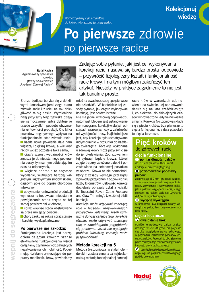 1 Rozpoczynamy cykl artykułów, do których dołączony jest segregator. Po pierwsze zdrowie po pierwsze racice Rafał Kapica dyplomowany specjalista korektor, główny szkoleniowiec „Akademii Zdrowej Racicy” wepnij do segregatora Kolekcjonuj wiedzę Branża bydlęca boryka się z dotkliwymi konsekwencjami złego stanu zdrowia racic i z roku na rok dolegliwość ta się nasila. Wymienione niżej przyczyny tego zjawiska dzieją się samoczynnie, gdyż dyktuje je przede wszystkim potrzeba utrzymania rentowności produkcji. Oto kilka powodów negatywnego wpływu na funkcjonalność i stan zdrowia racic: każde nowe pokolenie daje nam większą i cięższą krowę, a wielkość racicy wciąż pozostaje taka sama, ciągły wzrost wydajności krów zmusza je do nieustannego pobierania paszy, tym samym odbierając im czas na odpoczynek, większe pobranie to częstsze wydalanie, skutkujące bardziej wilgotnym i agresywnym środowiskiem, dającym pole do popisu chorobom infekcyjnym, utrzymanie rentowności produkcji wymusza na hodowcach nieustanne powiększanie stada często na tej samej powierzchni w oborze, coraz większe stada obsługiwane są przez mniejszy personel, obory z roku na rok są coraz starsze i bardziej wyeksploatowane. Po pierwsze nie szkodzić Funkcjonalna korekcja jest narzędziem dającym krowom szanse efektywnego funkcjonowania wśród całej gamy czynników oddziałujących negatywnie na ich mobilność. Podejmując działanie zmierzające do poprawy mobilności krów, powinniśmy Zadając sobie pytanie, jaki jest cel wykonywania korekcji racic, nasuwa się bardzo prosta odpowiedź – przywrócić fizjologiczny kształt i funkcjonalność racic krowy. I na tym mógłbym zakończyć ten artykuł. Niestety, w praktyce zagadnienie to nie jest tak banalnie proste. mieć na uwadze zasadę „po pierwsze nie szkodzić”. W kontekście tej zasady pytanie, jak często wykonywać korekcję, jest bardzo istotne. Nie ma jednej właściwej odpowiedzi, natomiast błędem jest ustanowienie harmonogramu korekcji w stałych odstępach czasowych czy w zależności od wydajności i rasy. Najistotniejsze jest, aby korekcja była rozpatrywana indywidualnie w stosunku do każdego zwierzęcia. Korekcja wykonana u zdrowej krowy może przyczynić się do jej okulawienia. Zobrazowaniem tej sytuacji będzie krowa, której zdjęto trapery, założono baletki i pozostawiono na betonowej posadzce w oborze. Krowa to nie samochód, który z zasady wymaga przeglądu z powodu przejechania odpowiedniej liczby kilometrów. Celowość korekcji dogłębnie obrazuje cytat z książki E. Toussaint Raven Cattle Footcare and Claw Trimming’, tzw. żółtej biblii korekcji: Korekcja może odgrywać znaczącą rolę w leczeniu indywidualnych przypadków kulawizny. Jeżeli kulawizna dotyczy całego stada, korekcja również może odgrywać znaczącą rolę w zapobieganiu pogłębiania się problemu. Jeżeli nie występuje problem kulawizny, korekcja może ją spowodować. Metoda korekcji na 5 Metoda 5-stopniowa w stylu holenderskim została uznana za najdoskonalszą metodę funkcjonalnej korekcji styczeń – luty 2013 29 Hoduj z głową racic krów w warunkach udomowienia na świecie. Jej opracowanie datuje się na lata sześćdziesiąte i, co ciekawe, do dzisiejszych czasów wprowadzono jedynie niewielkie zmiany. Korekcja 5-stopniowa składa się z pięciu kroków, trzy pierwsze to cięcia funkcjonalne, a dwa pozostałe to cięcia lecznicze. Pięć kroków do zdrowych racic cięcia funkcjonalne I pomiar długości palców do 7,5 cm (zakres 60-80 mm) i odcięcie przerośniętego rogu; II poziomowanie podeszwy palców zostawiając 5-7mm grubości czubka, z zachowaniem jednakowej wysokości ściany zewnętrznej i wewnętrznej palca, jak i palców względem siebie, czego efektem lub celem staje się uzyskanie 4-4,5 cm wysokości piętki; III wycięcie wyokrągleń w środkowej 1/3 długości ściany wewnętrznej palca, tzw. przywrócenie modelu racicy. cięcia lecznicze IV dwa ostanie kroki obniżenie podeszwy palca uszkodzonego w 2/3 długości od pięty do czubka względem palca zdrowego w przypadku uszkodzenia podeszwy jednego z palców. Przenosi to obciążenie na palec zdrowy i daje możliwość regeneracji i wzrostu palca uszkodzonego; V usunięcie uszkodzonego i zainfekowanego rogu na piętkach pozostawiającego gładkie powierzchnie. W przypadku pozostawienia zbyt długiego palca (>80 mm) uniemożliwia się przywrócenie fizjologicznego kształtu racicy i uzyskanie prawidłowego kąta nachylenia ściany przedniej puszki względem podeszwy. Miarka i szczypce do korekcji racic 1 75 mm a) 2 b) 1 3 Pierwszy krok W tym rozdziale przyjrzymy się pierwszemu z pięciu kroków, czyli prawidłowemu wykonaniu pomiaru długości palców racicy. Aby przystąpić do pierwszego kroku korekcji, należy poskromić zwierzę w bezpieczny dla niego i nas samych sposób. Noga krowy powinna być unieruchomiona, odwrócona do góry podeszwą. Przed przystąpieniem do pomiaru racicę krowy należy osuszyć i wyczyścić 1 . Praktycznym rozwiązaniem będzie użycie suchych trocin, którymi też można posypać podłoże wokół poskromu. Zaschniętą warstwę brudu można usunąć nożem lub szczotką. Czynności te służą odsłonięciu miejsca pomiaru. Od razu zaznaczam, że w praktyce powyższe czynności zajmują przysłowiowe kilka sekund i warto je na to poświęcić. Prawidłowo przygotowana racica da nam szanse wykonania prawidłowego pomiaru. Ustalenie długości palca w celu odcięcia jego nadmiaru ma być efektem naszej decyzji, a nie dziełem przypadku. Do pomiaru długości palca służy miarka o długości 75 mm i grubości około 7 mm. (foto u góry strony). Pomiar na racicach kończyn tylnych wykonujemy na palcu wewnętrznym racicy. W przednich kończynach pomiar wykonujemy na palcu zewnętrznym. Pomiar wykonywany jest na zewnętrznej ścianie palca od koronki w kierunku Kolekcjonuj wiedzę styczeń – luty 20