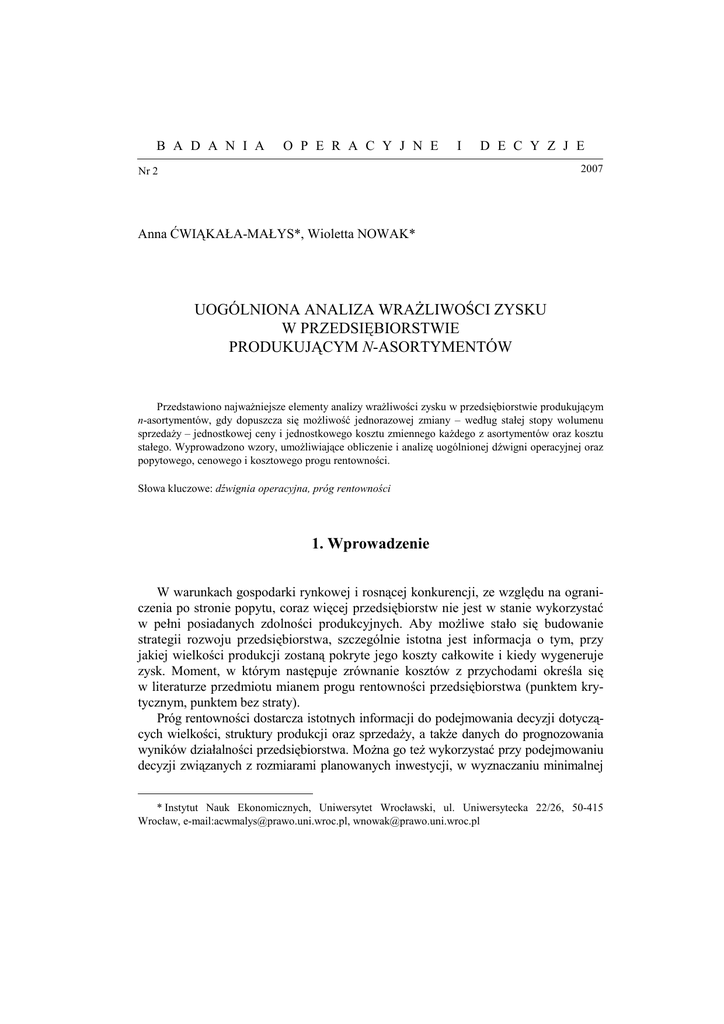 B A D A N I A O P E R A C Y J N E I D E C Y Z J E 2007 Nr 2 Anna ĆWIĄKAŁA-MAŁYS*, Wioletta NOWAK* UOGÓLNIONA ANALIZA WRAŻLIWOŚCI ZYSKU W PRZEDSIĘBIORSTWIE PRODUKUJĄCYM N-ASORTYMENTÓW Przedstawiono najważniejsze elementy analizy wrażliwości zysku w przedsiębiorstwie produkującym n-asortymentów, gdy dopuszcza się możliwość jednorazowej zmiany – według stałej stopy wolumenu sprzedaży – jednostkowej ceny i jednostkowego kosztu zmiennego każdego z asortymentów oraz kosztu stałego. Wyprowadzono wzory, umożliwiające obliczenie i analizę uogólnionej dźwigni operacyjnej oraz popytowego, cenowego i kosztowego progu rentowności. Słowa kluczowe: dźwignia operacyjna, próg rentowności 1. Wprowadzenie W warunkach gospodarki rynkowej i rosnącej konkurencji, ze względu na ograniczenia po stronie popytu, coraz więcej przedsiębiorstw nie jest w stanie wykorzystać w pełni posiadanych zdolności produkcyjnych. Aby możliwe stało się budowanie strategii rozwoju przedsiębiorstwa, szczególnie istotna jest informacja o tym, przy jakiej wielkości produkcji zostaną pokryte jego koszty całkowite i kiedy wygeneruje zysk. Moment, w którym następuje zrównanie kosztów z przychodami określa się w literaturze przedmiotu mianem progu rentowności przedsiębiorstwa (punktem krytycznym, punktem bez straty). Próg rentowności dostarcza istotnych informacji do podejmowania decyzji dotyczących wielkości, struktury produkcji oraz sprzedaży, a także danych do prognozowania wyników działalności przedsiębiorstwa. Można go też wykorzystać przy podejmowaniu decyzji związanych z rozmiarami planowanych inwestycji, w wyznaczaniu minimalnej * Instytut Nauk Ekonomicznych, Uniwersytet Wrocławski, ul. Uniwersytecka 22/26, 50-415 Wrocław, e-mail:[email protected], [email protected] 6 A. ĆWIĄKAŁA-MAŁYS, W. NOWAK skali produkcji i sprzedaży, która gwarantuje pokrycie wszystkich dokonanych nakładów inwestycyjnych. Problem progu rentowności został szeroko opisany w literaturze z zakresu współczesnej rachunkowości zarządczej. Szczególnie duże zainteresowanie tym tematem wykazali: M. Sierpińska i T. Jachna [5], A.A. Jaruga i in. [3], T. Dudycz i S. Wrzosek [2], Z. Leszczyński i T. Wnuk [4], A. Ćwiąkała-Małys i W. Nowak [1]. Kategorie ekonomiczne: koszt, produkcja i zysk są ze sobą ściśle powiązane oraz wzajemnie od siebie uzależnione. Nie można realizować produkcji, nie generując kosztów. Jednocześnie wielkość kosztów jest skorelowana z wielkością produkcji. Natomiast produkcja i wynikająca z niej zarówno sprzedaż, jak i koszty oddziałują bezpośrednio na zysk. W procesie zarządzania przedsiębiorstwem decydujące znaczenie ma więc informacja o związku koszty–produkcja. Analiza relacji koszt–produkcja–zysk opiera się w literaturze na pewnych założeniach, które znacznie upraszczają rzeczywistość gospodarczą. Przyjmuje się, że w pewnych przedziałach koszt stały jest całkowicie stały, w długich horyzontach czasowych wszystkie koszty w przedsiębiorstwie są zmienne, a wytworzone wyroby są w całości sprzedane. W gospodarce rynkowej, charakteryzującej się dużą zmiennością, przyjęcie takich założeń stanowi swoistego rodzaju zagrożenie dla systemu decyzyjnego przedsiębiorstwa. Istotne zatem staje się zbadanie wpływu poszczególnych pojedynczych zmiennych lub ich kombinacji na stopę zwrotu zysku. Ważne jest, zarówno z punktu widzenia teoretycznego jak i praktycznego, przeanalizowanie zmian zysku pod wpływem zmian popytu, jednostkowej ceny, jednostkowego kosztu zmiennego i kosztu stałego, przy założeniu, że te czynniki mogą zmieniać się według stałych stóp. Celem artykułu jest analiza wrażliwości zysku, w tym progu rentowności, w przedsiębiorstwie produkującym n-asortymentów, gdy dopuszcza się możliwość zmiany według stałej stopy wolumenu sprzedaży, jednostkowej ceny i jednostkowego kosztu zmiennego każdego z asortymentów oraz kosztu stałego. W związku z tym, że czynniki determinujące zysk mogą się zmieniać według stałych stóp, analizę wrażliwości zysku nazywa się uogólnioną. Artykuł składa się z dwóch głównych części. Pierwsza dotyczy zagadnienia dźwigni operacyjnej, a druga progu rentowności. 2. Uogólniona dźwignia operacyjna Zysk przedsiębiorstwa produkującego (sprzedającego) n-asortymentów wyraża się wzorem Z= n ∑ (S i =1 i − Kzi ) − K s , (1) Uogólniona analiza wrażliwości zysku w przedsiębiorstwie ... 7 gdzie: Si = pi ⋅ qi – przychód ze sprzedaży i-tego asortymentu, (2) Kzi = kzi ⋅ qi – koszt zmienny dla i-tego asortymentu, (3) Ks – koszt stały, pi – jednostkowa cena sprzedaży i-tego asortymentu, kzi – jednostkowy koszt zmienny i-tego asortymentu, qi – wolumen sprzedaży (produkcji) i-tego asortymentu. Jeśli założy się, że wszystkie wielkości mogą się zmieniać według stałych stóp, to zysk przedsiębiorstwa produkującego n-asortymentów liczy się w następujący sposób: Zz = n ∑ (S (1 + dp ) − Kz (1 + d i i i kzi ))(1 + dqi ) − K s (1 + d Ks ) , (4) i =1 gdzie: dqi – stopa zmiany1 wolumenu sprzedaży i-tego asortymentu, dpi – stopa zmiany jednostkowej ceny sprzedaży i-tego asortymentu, dkzi – stopa zmiany jednostkowego kosztu zmiennego i-tego asortymentu, dKs – stopa zmiany kosztu stałego. Pozostałe oznaczenia jak wcześniej. W celu ustalenia, o ile procent zmieni się zysk przedsiębiorstwa, gdy jednocześnie ulegnie zmianie jednostkowa cena, jednostkowy koszt zmienny i wolumen sprzedaży każdego z asortymentów oraz koszt stały, należy obliczyć stopę zwrotu zysku według wzoru dz = Zz − Z . Z (5) Po podstawieniu równań (1) i (4) do (5) dostaje się dz = n ∑α ⋅ dq + β , i (6) i i =1 gdzie: αi = Si Kzi Si Kz − + dpi − i d kzi , Z Z Z Z n β =∑ i =1 Si dpi − Z n ∑ i =1 i = 1, ..., n , Kzi K d kzi − s d Ks . Z Z (7) (8) Na podstawie wzoru (6) otr