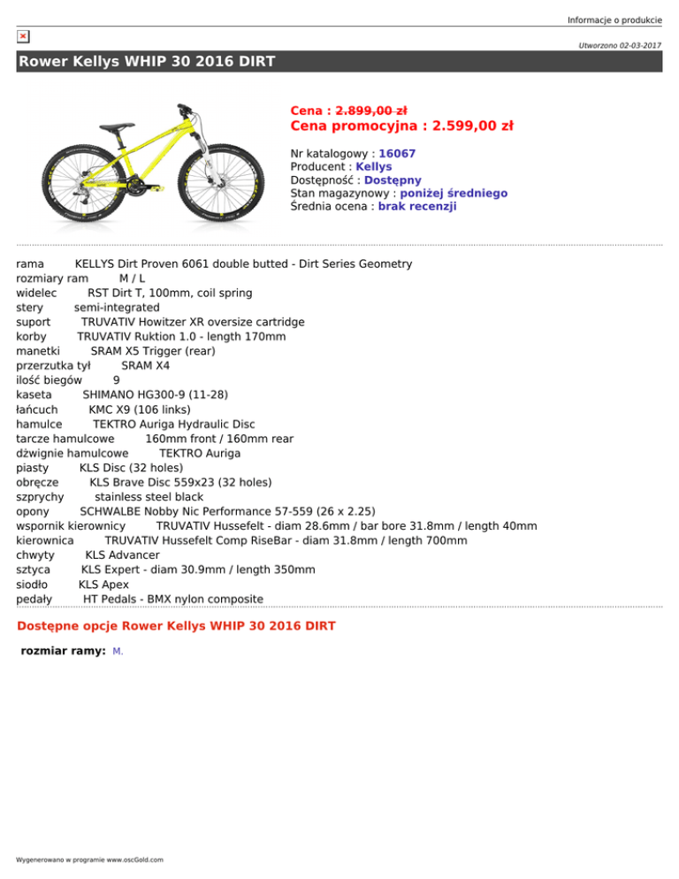 Informacje o produkcie Utworzono 02-03-2017 Rower Kellys WHIP 30 2016 DIRT Cena : 2.899,00 zł Cena promocyjna : 2.599,00 zł Nr katalogowy : 16067 Producent : Kellys Dostępność : Dostępny Stan magazynowy : poniżej średniego Średnia ocena : brak recenzji rama KELLYS Dirt Proven 6061 double butted - Dirt Series Geometry rozmiary ram M/L widelec RST Dirt T, 100mm, coil spring stery semi-integrated suport TRUVATIV Howitzer XR oversize cartridge korby TRUVATIV Ruktion 1.0 - length 170mm manetki SRAM X5 Trigger (rear) przerzutka tył SRAM X4 ilość biegów 9 kaseta SHIMANO HG300-9 (11-28) łańcuch KMC X9 (106 links) hamulce TEKTRO Auriga Hydraulic Disc tarcze hamulcowe 160mm front / 160mm rear dżwignie hamulcowe TEKTRO Auriga piasty KLS Disc (32 holes) obręcze KLS Brave Disc 559x23 (32 holes) szprychy stainless steel black opony SCHWALBE Nobby Nic Performance 57-559 (26 x 2.25) wspornik kierownicy TRUVATIV Hussefelt - diam 28.6mm / bar bore 31.8mm / length 40mm kierownica TRUVATIV Hussefelt Comp RiseBar - diam 31.8mm / length 700mm chwyty KLS Advancer sztyca KLS Expert - diam 30.9mm / length 350mm siodło KLS Apex pedały HT Pedals - BMX nylon composite Dostępne opcje Rower Kellys WHIP 30 2016 DIRT rozmiar ramy: M. Wygenerowano w programie www.oscGold.com