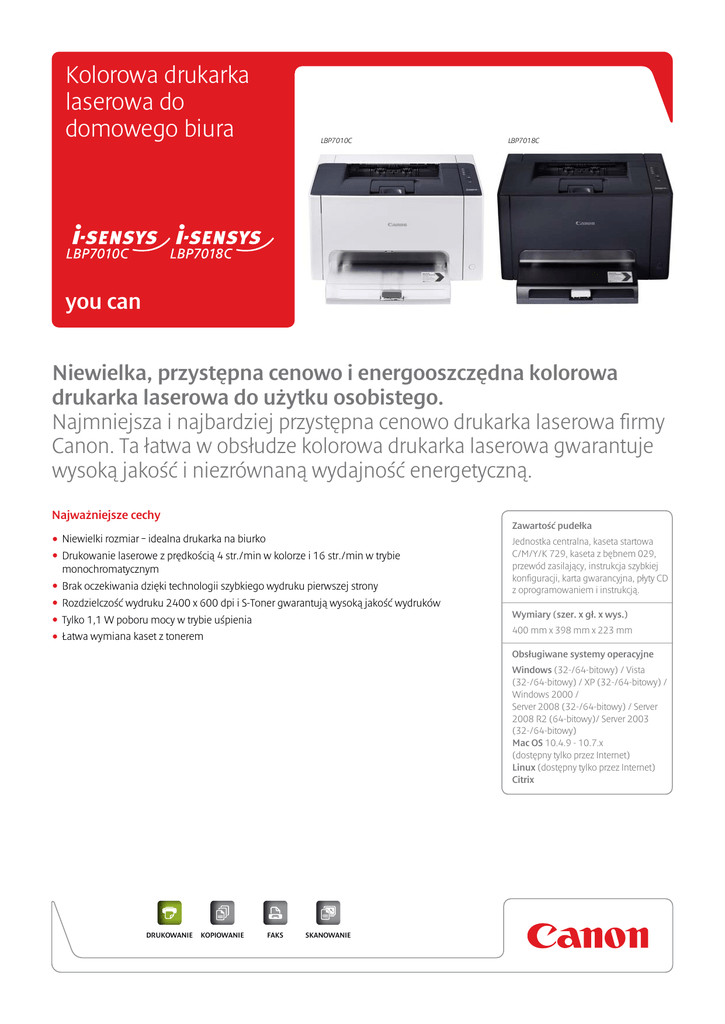 Kolorowa drukarka laserowa do domowego biura LBP7010C LBP7018C you can Niewielka, przystępna cenowo i energooszczędna kolorowa drukarka laserowa do użytku osobistego. Najmniejsza i najbardziej przystępna cenowo drukarka laserowa firmy Canon. Ta łatwa w obsłudze kolorowa drukarka laserowa gwarantuje wysoką jakość i niezrównaną wydajność energetyczną. Najważniejsze cechy • rukowanie laserowe z prędkością 4 str./min w kolorze i 16 str./min w trybie •Dmonochromatycznym •Brak oczekiwania dzięki technologii szybkiego wydruku pierwszej strony •Rozdzielczość wydruku 2400 x 600 dpi i S-Toner gwarantują wysoką jakość wydruków •Tylko 1,1 W poboru mocy w trybie uśpienia •Łatwa wymiana kaset z tonerem Niewielki rozmiar – idealna drukarka na biurko Zawartość pudełka Jednostka centralna, kaseta startowa C/M/Y/K 729, kaseta z bębnem 029, przewód zasilający, instrukcja szybkiej konfiguracji, karta gwarancyjna, płyty CD z oprogramowaniem i instrukcją. Wymiary (szer. x gł. x wys.) 400 mm x 398 mm x 223 mm Obsługiwane systemy operacyjne Windows (32-/64-bitowy) / Vista (32-/64-bitowy) / XP (32-/64-bitowy) / Windows 2000 / Server 2008 (32-/64-bitowy) / Server 2008 R2 (64-bitowy)/ Server 2003 (32-/64-bitowy) Mac OS 10.4.9 - 10.7.x (dostępny tylko przez Internet) Linux (dostępny tylko przez Internet) Citrix DRUKOWANIE KOPIOWANIE FAKS SKANOWANIE 1 Specyfikacja produktu Mechanizm drukarki Szybkość druku Metoda drukowania Jakość drukowania Rozdzielczość drukowania Czas rozgrzewania Czas wydruku pierwszej strony Cykl pracy Marginesy wydruku Obsługa nośników Podajnik papieru (standardowy) Taca odbiorcza Typy nośników Rozmiary nośników Gramatura nośników Charakterystyka ogólna Wymagania dotyczące zasilania Pobór mocy Poziom hałasu Wymiary (szer x gł. x wys.) Waga Środowisko pracy Panel sterowania  1 Taca wyjściowa na papier  2 Podajnik uniwersalny na 150 arkuszy  3 K aseta 729: 4 dostępne kolory: Black, Cyan, Magenta i Yellow 3 16 str./min. w czerni i bieli, 4 str./min. w kolorze (A4) Drukowanie laserowe Maks. 2400 x 600 dpi z funkcją automatycznego wyostrzania obrazu Maks. 600 x 600 dpi Około 10 sekund z trybu uśpienia Około 66 sekund lub mniej po włączeniu zasilania Około 24,7/13,6 sekundy (kolor/cz.-b.) Maks. 15 000 stron miesięcznie 5 mm od góry, od dołu, od lewej i od prawej (10 mm — koperty) Podajnik uniwersalny na 150 arkuszy Wydrukiem do dołu na 50 arkuszy Papier zwykły, o podwyższonej gramaturze, papier powlekany, folia przezroczysta (tylko cz.-b.), etykiety, koperty, papier szorstki, papier makulaturowy Podajnik uniwersalny: A4/B5/A5/Letter/Legal/Executive/16K/Foolscap/Statement Envelope (COM-10, Monarch, C5, B5, DL)/karty indeksowe/formaty niestandardowe: szerokość: 76.2 × 215,9 mm x długość 127 × 355,6 mm Podajnik uniwersalny: Od 60 do 163 g/m2 (220 g/m2 w przypadku papieru powlekanego) 220-240 V (±10%) 50/60 Hz (±2 Hz), prąd zmienny Maksymalnie: do 868 W Praca: przeciętnie około 145 W/230 W lub mniej (kolor/cz.-b) Tryb gotowości: przeciętnie ok. 7 W Tryb uśpienia: przeciętnie około 1,1 W Typowy pobór energii elektrycznej (TEC): 0,5 kWh/tydzień Moc akustyczna1: Praca: 6,2/6,4 B lub mniej (kolor/cz.-b.) Tryb gotowości: poniżej poziomu słyszalności 2 Kontroler Pamięć Języki drukarki Interfejsy i złącza Zgodność z systemami operacyjnymi 16 MB Canon Advanced Printing Technology (CAPT) USB 2.0 Hi-Speed Windows 7 (32-/64-bitowy) / Vista (32-/64-bitowy) / XP (32-/64-bitowy) / Windows 2000 / Server 2008 (32-/64-bitowy) / Server 2008 R2 (64-bitowy) / Server 2003 (32-/64-bitowy) / Mac OS 10.4.9 - 10.7.x 2 / Linux2 / Citrix2 Materiały eksploatacyjne Materiały eksploatacyjne Standardowe: Kaseta 729 Black (1200 stron3)4 Kaseta 729 Cyan (1000 stron3)4 Kaseta 729 Magenta (1000 stron3)4 Kaseta 729 Yellow (1000 stron3)4 Kaseta z bębnem 029 (7000 stron) Akcesoria/elementy dodatkowe Przypisy [1] Deklarowany poziom hałasu zgodnie z normą ISO 9296 [2] Dystrybucja tylko przez Internet. Data publikacji sterownika: październik 2011 r. [3] W oparciu o normę ISO/IEC19798 [4] Drukarka jest dostarczana z kasetą startową na 550/500 stron (cz.-b./kolor) Ciśnienie akustyczne1: Praca: 48/50 dB(A) (kolor/cz.-b.) Tryb gotowości: poniżej poziomu słyszalności 400 mm × 398 mm × 223 mm Około 12,3 kg Temperatura od +10 do 30°C Wilgotność względna: od 20 do 80% (bez kondensacji) 6 wskaźników LED, 1 przycisk obsługi Canon Inc. Canon Polska Sp. z o.o. canon.com ul. Mołdawska 9 02-127 Warszawa tel. +48 22 430 60 00 www.canon.pl Canon Europe canon-europe.com Polish Edition © Canon Europa N.V., 2011