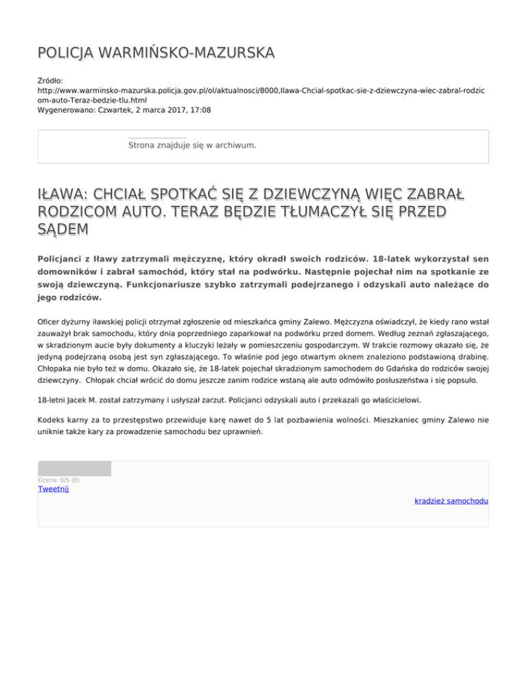 POLICJA WARMIŃSKO-MAZURSKA Źródło: http://www.warminsko-mazurska.policja.gov.pl/ol/aktualnosci/8000,Ilawa-Chcial-spotkac-sie-z-dziewczyna-wiec-zabral-rodzic om-auto-Teraz-bedzie-tlu.html Wygenerowano: Czwartek, 2 marca 2017, 17:08 Strona znajduje się w archiwum. IŁAWA: CHCIAŁ SPOTKAĆ SIĘ Z DZIEWCZYNĄ WIĘC ZABRAŁ RODZICOM AUTO. TERAZ BĘDZIE TŁUMACZYŁ SIĘ PRZED SĄDEM Policjanci z Iławy zatrzymali mężczyznę, który okradł swoich rodziców. 18-latek wykorzystał sen domowników i zabrał samochód, który stał na podwórku. Następnie pojechał nim na spotkanie ze swoją dziewczyną. Funkcjonariusze szybko zatrzymali podejrzanego i odzyskali auto należące do jego rodziców. Oficer dyżurny iławskiej policji otrzymał zgłoszenie od mieszkańca gminy Zalewo. Mężczyzna oświadczył, że kiedy rano wstał zauważył brak samochodu, który dnia poprzedniego zaparkował na podwórku przed domem. Według zeznań zgłaszającego, w skradzionym aucie były dokumenty a kluczyki leżały w pomieszczeniu gospodarczym. W trakcie rozmowy okazało się, że jedyną podejrzaną osobą jest syn zgłaszającego. To właśnie pod jego otwartym oknem znaleziono podstawioną drabinę. Chłopaka nie było też w domu. Okazało się, że 18-latek pojechał skradzionym samochodem do Gdańska do rodziców swojej dziewczyny. Chłopak chciał wrócić do domu jeszcze zanim rodzice wstaną ale auto odmówiło posłuszeństwa i się popsuło. 18-letni Jacek M. został zatrzymany i usłyszał zarzut. Policjanci odzyskali auto i przekazali go właścicielowi. Kodeks karny za to przestępstwo przewiduje karę nawet do 5 lat pozbawienia wolności. Mieszkaniec gminy Zalewo nie uniknie także kary za prowadzenie samochodu bez uprawnień. Ocena: 0/5 (0) Tweetnij kradzież samochodu