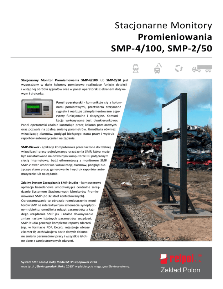 Stacjonarne Monitory Promieniowania SMP-4/100, SMP-2/50 Stacjonarny Monitor Promieniowania SMP-4/100 lub SMP-2/50 jest wyposażony w dwie kolumny pomiarowe realizujące funkcje detekcji i wstępnej obróbki sygnałów oraz w panel operatorski z ekranem dotykowym i drukarką. Panel operatorski - komunikuje się z kolumnami pomiarowymi, przetwarza otrzymane sygnały i realizuje zaimplementowane algorytmy funkcjonalne i decyzyjne. Komunikacja wykonywana jest dwukierunkowo: Panel operatorski zdalnie kontroluje pracę kolumn pomiarowych oraz pozwala na zdalną zmianę parametrów. Umożliwia również wizualizację alarmów, podgląd bieżącego stanu pracy i wydruk raportów automatycznie i na żądanie. SMP-Viewer - aplikacja komputerowa przeznaczona do zdalnej wizualizacji pracy pojedynczego urządzenia SMP, która może być zainstalowana na dowolnym komputerze PC połączonym siecią internetową, bądź ethernetową z monitorem SMP. SMP-Viewer umożliwia wizualizację alarmów, podgląd bieżącego stanu pracy, generowanie i wydruk raportów automatycznie lub na żądanie. Zdalny System Zarządzania SMP-Studio – komputerowa aplikacja bazodanowa umożliwiająca centralne zarządzanie Systemem Stacjonarnych Monitorów Promieniowania SMP (do 32 stref kontrolowanych). Oprogramowanie to obrazuje rozmieszczenie monitorów SMP na interaktywnym schemacie synoptycznym obiektu, umożliwia odczyt parametrów z każdego urządzenia SMP jak i zdalne dokonywanie zmian nastaw istotnych parametrów urządzeń. SMP-Studio generuje kompletne raporty zdarzeń (np. w formacie PDF, Excel), rejestruje obrazy z kamer IP, archiwizuje w bazie danych dokonane zmiany parametrów pracy i wszystkie istotne dane z zarejestrowanych zdarzeń. System SMP zdobył Złoty Medal MTP Expopower 2014 oraz tytuł „Elektroprodukt Roku 2013” w plebiscycie magazynu Elektrosystemy. Zakład Polon Przykładowe zastosowanie określonych typów monitorów SMP: Obiekty: Typ SMP Strefa [szer./wys.] Prędkość maks. Typ kontrolowanych pojazdów* - zakłady składowania i przerobu złomu metali - huty metali SMP-4/100 do 4,5 m/do 4 m do 3 km/h - samochody ciężarowe - kontenery i pojazdy szynowe - składowiska odpadów, balastu - spalarnie odpadów SMP-2/50 do 6 m/do 4 m do 8 km/h - samochody ciężarowe *Wysokość kolumn i rozmieszczenie detektorów jest dopasowywane indywidualnie w zależności od rodzaju transportu i strefy. Główne cechy: Dane techniczne: Automatyczna kontrola radiometryczna bez zakłóceń w ruchu. Detektor gamma - plastik organiczny - objętość aktywna (ilość montowanych detektorów jest zależna od potrzeby w danej strefie kontroli) 25 l x 4 dla SMP-4/100 25 l x 2 dla SMP-2/50 Wysoka czułość. Sygnał alarmowy akustyczny i optyczny Generowanie raportów i sygnałów alarmowych. Ilość fałszywych alarmów/ilość obiektów w strefie 1/10000 Standardowe łącza komunikacyjne Ethernet Zasilanie 230V 50 Hz Kontrola prędkości. Pobór mocy od 90 do 105 VA Interaktywny panel operatorski z ekranem dotykowym 8,3”. Czas pracy ciągłej 24 h/dobę Czas pracy monitorów na zasilaniu awaryjnym 8h Komunikacja dwukierunkowa umożliwiająca: - zdalną kontrolę SMP - zdalną zmianę nastaw istotnych parametrów. Temperatura pracy kolumn pomiarowych od - 300C do + 500C Stopień ochrony kolumn pomiarowych IP55 Wymiary kolumn pomiarowych: SMP-4/100 - wer. drogowa SMP-4/100 - wer. kolejowa SMP-2/50 - wer. drogowa do 3,75 m x 1,49 m x 0,18 do 3,00 m x 1,49 m x 0,18 do 2,70 m x 0,94 m x 0,18 Masa kolumny pomiarowej: 380 kg 240 kg Praca w dedykowanym Zdalnym Systemie Nadzoru SMP-Studio. Wideorejestracja (pod nadzorem SMP-Studio). SMP-4/100 SMP-2/50 Montaż konstrukcji nośnej monitorów wymaga wykonania betonowych podstaw fundamentowych. Niezawodność. Każda kolumna wymaga wykonania uziomów pionowych lub poziomych. Łatwość obsługi. Panel operatorski: Wysoka estetyka. Panel może być zawieszony (np. na ścianie) lub postawiony na przeznaczonej do tego kolumnie wewnątrz budynku. System SMP odpowiada zaleceniom Międzynarodowej Agencji Energii Atomowej IAEA w Wiedniu. Deklaracja zgodności CE 453 mm x 294 mm x 146 mm 16 kg Opcje wyposażenia dodatkowego: Zdalny System Nadzoru SMP-Studio, Kamery IP, PC - serwer/stacje robocze, bariery ochronne. Relpol S.A. Zakład Polon ul. Browarna 11 65-849 Zielona Góra www.relpol.com.pl Dział marketingu i sprzedaży tel. + 48 68 45 32 707 tel. + 48 68 45 32 706 fax + 48 68 45 32 705 [email protected] Serwis tel. +48 68 45 32 709 fax +48 68 45 32 702 tel. kom. +48 504 039 033 20140509 Zakład Polon - wymiary - waga
