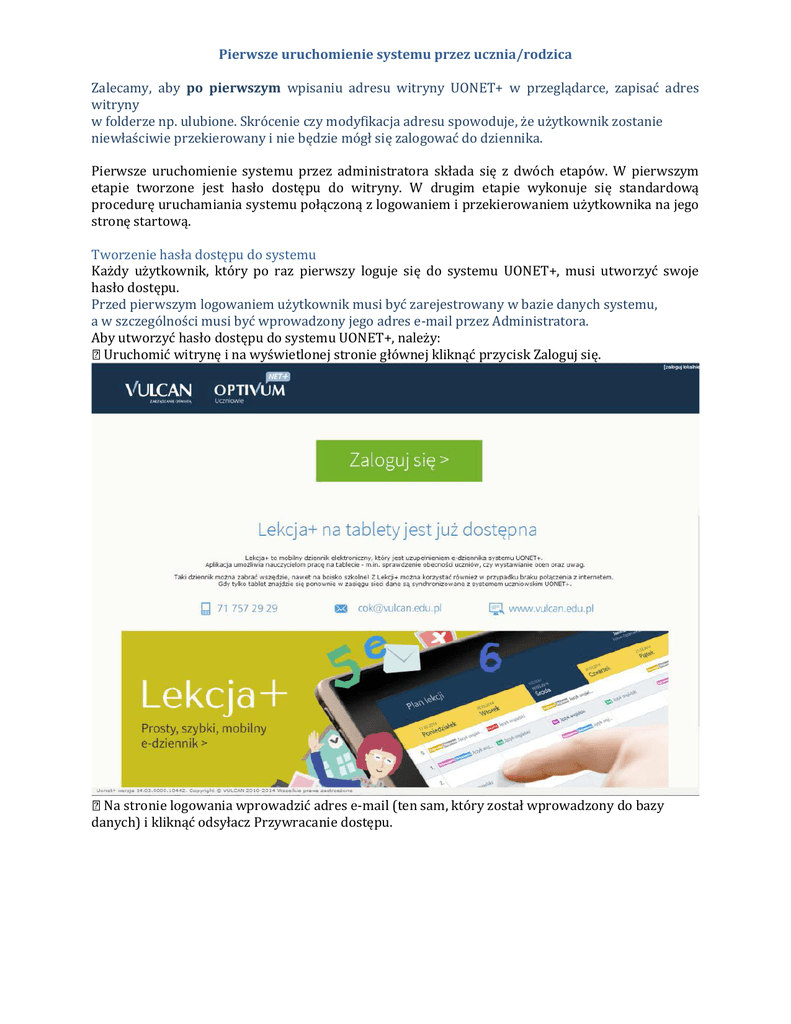 Pierwsze uruchomienie systemu przez ucznia/rodzica Zalecamy, aby po pierwszym wpisaniu adresu witryny UONET+ w przeglądarce, zapisać adres witryny w folderze np. ulubione. Skrócenie czy modyfikacja adresu spowoduje, że użytkownik zostanie niewłaściwie przekierowany i nie będzie mógł się zalogować do dziennika. Pierwsze uruchomienie systemu przez administratora składa się z dwóch etapów. W pierwszym etapie tworzone jest hasło dostępu do witryny. W drugim etapie wykonuje się standardową procedurę uruchamiania systemu połączoną z logowaniem i przekierowaniem użytkownika na jego stronę startową. Tworzenie hasła dostępu do systemu Każdy użytkownik, który po raz pierwszy loguje się do systemu UONET+, musi utworzyć swoje hasło dostępu. Przed pierwszym logowaniem użytkownik musi być zarejestrowany w bazie danych systemu, a w szczególności musi być wprowadzony jego adres e-mail przez Administratora. Aby utworzyć hasło dostępu do systemu UONET+, należy: Uruchomić witrynę i na wyświetlonej stronie głównej kliknąć przycisk Zaloguj się. Na stronie logowania wprowadzić adres e-mail (ten sam, który został wprowadzony do bazy danych) i kliknąć odsyłacz Przywracanie dostępu. Na stronie Przywracanie dostępu dokonać autoryzacji operacji poprzez przepisanie liter z obrazka. Jeśli tekst jest nieczytelny, można wygenerować następny za pomocą ikony Zmień próbkę. Następnie wprowadzić adres email i kliknąć przycisk Wyślij wiadomość. Wyświetli się strona Podsumowanie operacji informująca, że na zapisany w systemie adres wysłano wiadomość, zawierającą dalsze instrukcje. Odebrać wiadomość, przeczytać ją i kliknąć odsyłacz do strony, na której możliwe będzie wprowadzenie hasła dostępu. Na stronie Aktywacja konta dokonać ponownie autoryzacji operacji, wprowadzić hasło w polach Nowe hasło i Powtórz nowe hasło i kliknąć przycisk Ustaw nowe hasło. Wyświetli się strona Podsumowanie operacji zawierająca informację, że hasło zostało zmienione. Zamknąć okno przeglądarki. Po utworzeniu hasła dostępu należy ponownie uruchomić witrynę systemu i zalogować się. Wówczas nastąpi przekierowanie użytkownika na jego stronę startową, która zawiera komplet informacji kierowanych do niego. Ze strony startowej użytkownik może również uruchamiać moduły, do których ma dostęp. Ustalanie nowego hasła Po 30 dniach ustalone hasło wygasa i staje się nieaktywne. Aby zalogować się do systemu należy ustalić nowe unikalne hasło: Na stronie logowania wprowadzić adres e-mail (ten sam, który został wprowadzony do bazy danych) i kliknąć odsyłacz Przywracanie dostępu. W oknie Przywracanie dostępu w polu Hasło wprowadzić stare hasło. A następnie wpisać nowe hasło w polach Nowe hasło i Powtórz i kliknąć przycisk Ustaw nowe hasło. Nowe hasło zostało ustalone.