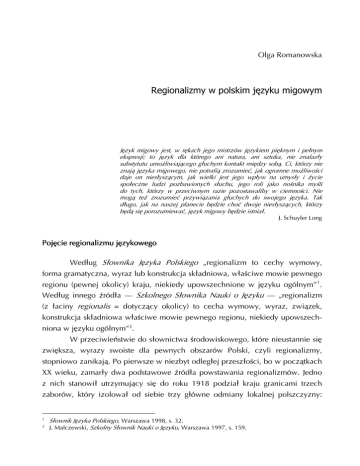 Olga Romanowska Regionalizmy w polskim języku migowym Język migowy jest, w rękach jego mistrzów językiem pięknym i pełnym ekspresji; to język dla którego ani natura, ani sztuka, nie znalazły substytutu umożliwiającego głuchym kontakt między sobą. Ci, którzy nie znają języka migowego, nie potrafią zrozumieć, jak ogromne możliwości daje on niesłyszącym, jak wielki jest jego wpływ na umysły i życie społeczne ludzi pozbawionych słuchu, jego roli jako nośnika myśli do tych, którzy w przeciwnym razie pozostawaliby w ciemności. Nie mogą też zrozumieć przywiązania głuchych do swojego języka. Tak długo, jak na naszej planecie będzie choć dwoje niesłyszących, którzy będą się porozumiewać, język migowy będzie istniał. J. Schuyler Long Pojęcie regionalizmu językowego Według Słownika Języka Polskiego „regionalizm to cechy wymowy, forma gramatyczna, wyraz lub konstrukcja składniowa, właściwe mowie pewnego regionu (pewnej okolicy) kraju, niekiedy upowszechnione w języku ogólnym”1. Według innego źródła — Szkolnego Słownika Nauki o Języku — „regionalizm (z łaciny regionalis = dotyczący okolicy) to cecha wymowy, wyraz, związek, konstrukcja składniowa właściwe mowie pewnego regionu, niekiedy upowszechniona w języku ogólnym”2. W przeciwieństwie do słownictwa środowiskowego, które nieustannie się zwiększa, wyrazy swoiste dla pewnych obszarów Polski, czyli regionalizmy, stopniowo zanikają. Po pierwsze w niezbyt odległej przeszłości, bo w początkach XX wieku, zamarły dwa podstawowe źródła powstawania regionalizmów. Jedno z nich stanowił utrzymujący się do roku 1918 podział kraju granicami trzech zaborów, który izolował od siebie trzy główne odmiany lokalnej polszczyzny: 1 2 Słownik Języka Polskiego, Warszawa 1998, s. 32. J. Malczewski, Szkolny Słownik Nauki o Języku, Warszawa 1997, s. 159. O. Romanowska, Regionalizmy w polskim języku migowym królewiecką (pod zaborem rosyjskim), galicyjską (pod zaborem austriackim) i wielkopolską (pod zaborem pruskim) oraz prowadził do ich niezależnego rozwoju. Drugie źródło regionalizmów — wpływ gwar ludowych na język miejski — charakterystyczne jeszcze dla okresu międzywojennego, w naszych czasach niemal zupełnie zanikło. Trzeba pamiętać, że regionalizmy to zwykłe słowa, co najmniej dziewiętnastowieczne, oznaczające często przedmioty, które stopniowo wychodzą z użycia. Oczywiście wyrazy regionalne wycofują się z obiegu stopniowo. Najszybciej wyzbywa się ich młodzież, najdłużej utrzymują się w języku starszego pokolenia. Regionalizmy — zdaniem wielu osób, zwłaszcza wychowanych w środowisku stołecznym — to wyrazy „gorsze” ujawniające prowincjonalność osób, które się nimi posługują. Jest to opinia niesłuszna. Właśnie w lokalnych odmianach polszczyzny zachowało się wiele pięknych wyrazów rodzimych, niepotrzebnie potem wypartych przez pożyczki, jak choćby przechadzka, która ustąpiła miejsca obcemu spacerowi. Regionalizmy ubarwiają język codzienny, który staje się coraz bardziej „znormalizowany”, a przez to pozbawiony jakiegoś indywidualnego piękna. Pełnią też w kontaktach między ludźmi ważną funkcję, którą nazywa się prezentacyjną: niezależne od swej podstawowej treści informują o środowisku terytorialnym, z którego wywodzi się nadawca wypowiedzi, albo o miejscu jego zamieszkania, a czasem nawet o zmiennych kolejach jego losu, jeżeli używa on regionalizmów różnych dzielnic3. Zróżnicowanie regionalne polszczyzny, utrzymujące się przez całe wieki, w wieku XX zaczęło się zacierać. Wpłynęło na to wiele czynników, takich jak upowszechnienie szkoły polskiej po odzyskaniu niepodległości w 1918 roku, a wraz z nią znajomości polszczyzny literackiej, dalszy postęp w rozwoju oświaty na wsi po drugiej wojnie światowej, wpływ ogólnopolskiej wersji języka mówionego w środkach masowego przekazu (radio, telewizja) oraz przemieszczanie się ludności wiejskiej do miast, spowodowało, że na wsi posługują się gwarą najczęściej osoby starsze. W polskim języku migowym również występują odmiany regionalne. Rozbiory Polski, w końcu XVIII wieku, spowodowały ograniczenie kontaktów 3 D. Buttle, Język i my 2. s. 67–72. 80 Podręcznik do języka polskiego dla szkół średnich, Warszawa 1994, O. Romanowska, Regionalizmy w polskim języku migowym Polaków znajdujących się w różnych zaborach. Powstałe w XIX wieku w różnych zaborach szkoły dla dzieci niesłyszących stały się źródłem tworzenia odrębnych języków migowych, właściwych tym szkołom. Z tego też względu w każdym z trzech zaborów rozwijał się inny język migowy. Po odzyskaniu niepodległości przez Polskę, okazało się, że na terenie kraju istnieją znaczne różnice dialektalne w języku migowym. Po II wojnie światowej nastąpiły kolejne istotne zmiany. Przesunięcie granic Polski na zachód spowodowało, że pozostało na terenie Polski wielu niesłyszących pochodzenia niemieckiego, posługujących się całkowicie odmiennym językiem migowym. Wszystko to spowodowało, że po II wojnie światowej na obszarze Polski funkcjonowało równolegle kilka języków migowych. Dopiero w latach sześćdziesiątych powołano Komisję Unifikacyjną, a także wydano pierwsze słowniki i podręczniki do nauki języka migowego. Mimo unifikacji znaków nadal w wielu regionach Polski spotykamy odmienne od zunifikowanych znaki migowe, specyficzne dla danego regionu. Regionalizmy w języku migowym to całkowicie nowy i niepodejmowany dotychczas temat badań. Brak jest jakiejkolwiek literatury, opracowań czy też tekstów źródłowych na ten temat. W praktyce, w codziennym życiu, można spotkać się bardzo często z różnicami regionalnymi w języku migowym. Szczególnie są one widoczne podczas pierwszych miesięcy nauki w szkołach średnich dla niesłyszących. Celem b