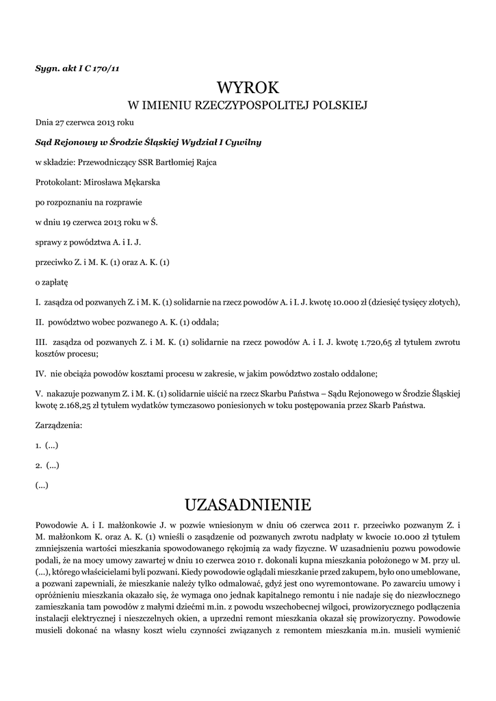 Sygn. akt I C 170/11 WYROK W IMIENIU RZECZYPOSPOLITEJ POLSKIEJ Dnia 27 czerwca 2013 roku Sąd Rejonowy w Środzie Śląskiej Wydział I Cywilny w składzie: Przewodniczący SSR Bartłomiej Rajca Protokolant: Mirosława Mękarska po rozpoznaniu na rozprawie w dniu 19 czerwca 2013 roku w Ś. sprawy z powództwa A. i I. J. przeciwko Z. i M. K. (1) oraz A. K. (1) o zapłatę I. zasądza od pozwanych Z. i M. K. (1) solidarnie na rzecz powodów A. i I. J. kwotę 10.000 zł (dziesięć tysięcy złotych), II. powództwo wobec pozwanego A. K. (1) oddala; III. zasądza od pozwanych Z. i M. K. (1) solidarnie na rzecz powodów A. i I. J. kwotę 1.720,65 zł tytułem zwrotu kosztów procesu; IV. nie obciąża powodów kosztami procesu w zakresie, w jakim powództwo zostało oddalone; V. nakazuje pozwanym Z. i M. K. (1) solidarnie uiścić na rzecz Skarbu Państwa – Sądu Rejonowego w Środzie Śląskiej kwotę 2.168,25 zł tytułem wydatków tymczasowo poniesionych w toku postępowania przez Skarb Państwa. Zarządzenia: 1. (...) 2. (...) (...) UZASADNIENIE Powodowie A. i I. małżonkowie J. w pozwie wniesionym w dniu 06 czerwca 2011 r. przeciwko pozwanym Z. i M. małżonkom K. oraz A. K. (1) wnieśli o zasądzenie od pozwanych zwrotu nadpłaty w kwocie 10.000 zł tytułem zmniejszenia wartości mieszkania spowodowanego rękojmią za wady fizyczne. W uzasadnieniu pozwu powodowie podali, że na mocy umowy zawartej w dniu 10 czerwca 2010 r. dokonali kupna mieszkania położonego w M. przy ul. (...), którego właścicielami byli pozwani. Kiedy powodowie oglądali mieszkanie przed zakupem, było ono umeblowane, a pozwani zapewniali, że mieszkanie należy tylko odmalować, gdyż jest ono wyremontowane. Po zawarciu umowy i opróżnieniu mieszkania okazało się, że wymaga ono jednak kapitalnego remontu i nie nadaje się do niezwłocznego zamieszkania tam powodów z małymi dziećmi m.in. z powodu wszechobecnej wilgoci, prowizorycznego podłączenia instalacji elektrycznej i nieszczelnych okien, a uprzedni remont mieszkania okazał się prowizoryczny. Powodowie musieli dokonać na własny koszt wielu czynności związanych z remontem mieszkania m.in. musieli wymienić instalację elektryczną, wodną i kanalizacyjną oraz uzupełnić brakujący mur między ścianą a oknem w jednym pokoju. Zdaniem powodów pozwani wiedzieli, że mieszkanie trzeba wyremontować, a mimo to nie poinformowali powodów o tym fakcie. W toku postępowania powodowie sprecyzowali, że żądają zapłaty ww. kwoty od pozwanych solidarnie oraz wskazali, że kwota dochodzona pozwem stanowi równowartość kosztów materiałów potrzebnych do przeprowadzenia remontu ww. mieszkania. Pozwani wnieśli o oddalenie powództwa w całości oraz o zasądzenie od powodów kosztów procesu, w tym kosztów zastępstwa procesowego według norm przepisanych. Pozwani przyznali, że dokonali sprzedaży ww. mieszkania powodom, zaprzeczyli jednak by stan techniczny był taki jak twierdzili powodowie, podnosząc, że rodzina pozwanego A. K. (1) zamieszkiwała tam, prowadząc normalne gospodarstwo domowe. Stan techniczny mieszkania był dobry, co potwierdzili powodowie w umowie przedwstępnej po obejrzeniu mieszkania. Mieszkanie spełniało wszystkie wymogi techniczne i sanitarne. Sąd ustalił w sprawie następujący stan faktyczny: W dniu 10 czerwca 2010 r. pozwani Z. i M. K. (1), reprezentowani przez pełnomocnika – ich syna, pozwanego A. K. (1), zawarli z powodami umowę sprzedaży na ich rzecz lokalu mieszkalnego nr (...) przy ul. (...), za cenę 203.000 zł. Strony ustaliły, że wydanie ww. lokalu nastąpi do 24 czerwca 2010 r. Dowód: - umowa sprzedaży w formie aktu notarialnego z dnia 10.06.2010 r. zawarta przed notariuszem B. S. w Kancelarii Notarialnej we W. rep. A nr 1888/2010 z protokołem sprostowania omyłki pisarskiej – k. 7-13, 14-15 Powodowie dokonali zakupu ww. mieszkania za pomocą biura pośrednictwa nieruchomości, które zamieszczało w internecie oferty sprzedaży tego mieszkania. Przed zawarciem umowy sprzedaży powodowie oglądali ww. mieszkanie, które było wówczas zamieszkałe przez pozwanego A. K. (1) z rodziną. W mieszkaniu były wówczas meble, na podłogach dywany, a na ścianach płytki ścienne, a w oknach zasłony. Pozwany zapewniał powodów, że stopniowo przeprowadzał remonty tego mieszkania. Dowód: - przesłuchanie powodów – k. 182-183, - przesłuchanie pozwanego A. K. – k.184, - wydruk ogłoszenia internetowego – k.59-63 Po zawarciu umowy sprzedaży i zapłaceniu umówionej ceny okazało się, że mieszkanie wymaga przeprowadzenia wielu kosztownych prac remontowych. Panele podłogowe były porozsuwane i podczas ich odkrywania okazało się, że posadzki podłogowe pod nimi są spękane z licznymi ubytkami bez fachowego podkładu. Posadzki należało wyrównać i wylać nową ich warstwę. W czasie zrywania paneli podłogowych i ściennych w pokoju pierwszym z lewej strony, widać było pod spodem mysie odchody. W części przedpokoju i w mniejszym pokoju po lewej stronie sąsiadującym z kuchnią, ściany były poprzykrywane zwykłymi standardowymi panelami naściennym z tworzywa. Po odkryciu tych paneli okazało się, że tynki ścienne są stare, zmurszałe, sypiące się. Instalacja elektryczna przechodziła pomiędzy samoróbną konstrukcją paneli, na której się utrzymywały. Przewody elektryczne przechodziły luźno, tylko gdzieniegdzie były przyłapane do tej konstrukcji. Instalacja miejscami była nie fachowo łączona tj. przewody były łączone za pomocą jedynie taśmy izolacyjnej. Wszystkie sufity wymagały poprawienia tj. trzeba je było wszystkie wyrównać za pomocą gładzi tynkowych wzmocnionej dodatkiem droższej zaprawy C., stosowanej na starsze powierzchnie. W przedpokoju wszystkie ościeżnice do drzwi do wszystkich pomieszczeń były nierówno wmontowane. Również ściany były do poprawienia, a to ze względu na uskoki ościeżnic, przy pomocy płyty kartonowo- gips