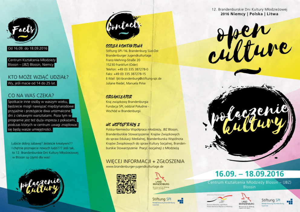Facts ~ Od 16.09. do 18.09.2016 12. Brandenburskie Dni Kultury Młodzieżowej 2016 Niemcy | Polska | Litwa Contacts ~ OSOBA KONTAKTOWA Wy, jeśli macie od 14 do 25 lat. Stiftung SPI / NL Brandenburg Süd-Ost Brandenburger Jugendkulturtage Franz-Mehring-Straße 20 15230 Frankfurt (Oder) Telefon: +49 (0) 335 387278-0 Faks: +49 (0) 335 387278-15 E-Mail: [email protected] Juliane Riedel, Manuela Pirke CO NA WAS CZEKA? ORGANIZATOR Centrum Kształcenia Młodzieży Blossin – (JBZ) Blossin, Niemcy KTO MOŻE WZIĄĆ UDZIAŁ? Spotkacie inne osoby w waszym wieku, będziecie mogli nawiązać międzynarodowe przyjaźnie i przeżyjecie dwa urozmaicone dni z ciekawymi warsztatami. Poza tym w programie jest też duża impreza z pokazami, podczas których w centrum uwagi znajdować się będą wasze umiejętności. Lubicie dobrą zabawę? Jesteście kreatywni?? I chętnie poznajecie nowych ludzi??? Jeśli tak, to 12. Brandenburskie Dni Kultury Młodzieżowej w Blossin są czymś dla was! Kraj związkowy Brandenburgia Fundacja SPI, oddział Południe Wschód w Brandenburgii WE WSPÓŁPRACY Z Polska-Niemiecka Współpraca młodzieży, JBZ Blossin, Brandenburskie Stowarzyszenie Krajów Związkowych do spraw Edukacji Medialnej, Brandenburska Wspólnota Krajów Związkowych do spraw Kultury Socjalnej, Brandenburskie Stowarzyszenie Pracy( -socjalnej) z Młodzieżą openure cult ~ e i n e z c poła ury kult WIĘCEJ INFORMACJI + ZGŁOSZENIA www.brandenburger-jugendkulturtage.de 16.09. – 18.09.2016 e i n e z c a ł o p ltury ku Centrum Kształcenia Młodzieży Blossin – (JBZ) Blossin Stiftung SPI Niederlassung Brandenburg Süd-Ost Stiftung SPI Niederlassung Brandenburg Süd-Ost Details ~ CZY ZNANE SĄ JUŻ SZCZEGÓŁY WARSZTATÓW? Oczywiście! Wraz z niemal 220 młodymi osobami z Niemiec, Polski i Litwy będziecie mogli przez cały weekend poeksperymentować i poszaleć z muzyką (hip hop, DJ-owanie, muzyka gitarowa, elektroniczna …), tańcem (jazz dance, breakdance, street dance …), mediami (filmami/wideo, fotografią, nowymi mediami, Internetem …), teatrem (teatrem & cyrkiem młodzieżowym) i sztukami pięknymi (plastyką, malarstwem, graffiti itp.). To, czego nauczycie się na profesjonalnie prowadzonych warsztatach, pomoże wam nie tylko w organizacji i planowaniu waszej imprezy końcowej, lecz także później w domu, waszych klubach, a nawet w szkole. Chcemy pracować z wami w luźnej atmosferze oraz świętować, bez jakiegokolwiek stresu i zasad. Wasza kreatywność nie zna granic, więc nie będziemy tych granic wyznaczać.Macie mieć przyjemność z zajmowania się sztuką i kulturą z innymi. Czy i ile doświadczenia już posiadacie, nie ma tu żadnego znaczenia. Liczy się tylko to, co możemy wspólnie osiągnąć. Cieszylibyśmy się ogromnie, gdybyśmy mogli powitać was w Blossin na warsztatach z mottem „OPEN CULTURE połączenie kultury”. Nie zastanawiajcie się jednak zbyt długo, bowiem ilość bardzo pożądanych miejsc jest ograniczona. Szkoda by było, gdybyście właśnie wy nie mogli do nas dołączyć… Timetable ~ PIĄTEK ~ 16.09. przyjazd od godz. 11:00 do godz. 13:00 Powitanie / omówienie spraw organizatorskich, oficjalne otwarcie, warsztaty, kolacja, wieczór niemiecko-polsko-litewski, DJ-owanie / występy na żywo, klub filmowy, ognisko SOBOTA ~ 17.09. Śniadanie, następnie warsztaty, obiad, warsztaty, kolacja, impreza z prezentacjami przy użyciu wszelkich dostępnych środków (sali, klubu, sceny, terenu), impreza, ognisko, klub filmowy s p o h s k r o W ~ TEMATYKA POSZCZEGÓLNYCH WARSZTATÓW: MUZYKA hip hop, rap, DJ-owanie, bębny, gitara, muzyka elektroniczna / beats, programming TEATR teatr młodzieżowy, cyrk młodzieżowy, performance, kabaret TANIEC NIEDZIELA ~ 18.09. Wspólne śniadanie, ewaluacja w grupach roboczych / warsztatowych, mała przekąska obiadowa, dokumentacja fotograficzna warsztatów i imprezy wieczornej (fotografia warsztatowa), luźne zakończenie, pożegnanie i odjazd (godz. 16:00) Join! ~ CHCECIE DO NAS DOŁĄCZYĆ? Zgłoście się w swoich grupach i/lub instytucjach młodzieżowych. Dalsze informacje i aktualny program otrzymacie od nas oczywiście także po potwierdzeniu uczestnictwa. street dance, jazz dance, breakdance, tańce latynoskie, capoeira SZTUKI PIEKNE malarstwo, plastyka, komiksy, graffiti FILM/WIDEO fotografia, film, tożsamość online, media społecznościowe, radio / telewizja internetowa INNE OFERTY organizacja imprez , czasopisma uczniowskie, demokratyczne formy współdecydowania, polityka + kultura + ja WWW.BRANDENBURGER-JUGENDKULTURTAGE.DE