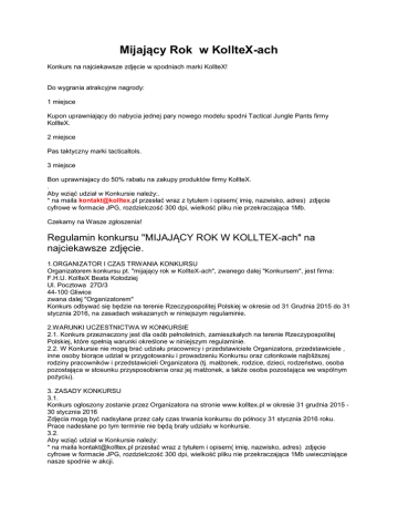 Mijający Rok w KollteX-ach Konkurs na najciekawsze zdjęcie w spodniach marki KollteX! Do wygrania atrakcyjne nagrody: 1 miejsce Kupon uprawniający do nabycia jednej pary nowego modelu spodni Tactical Jungle Pants firmy KollteX. 2 miejsce Pas taktyczny marki tacticaltols. 3 miejsce Bon uprawniajacy do 50% rabatu na zakupy produktów firmy KollteX. . Aby wziąć udział w Konkursie należy:. * na maila [email protected] przesłać wraz z tytułem i opisem( imię, nazwisko, adres) zdjęcie cyfrowe w formacie JPG, rozdzielczość 300 dpi, wielkość pliku nie przekraczająca 1Mb. Czekamy na Wasze zgłoszenia! Regulamin konkursu "MIJAJĄCY ROK W KOLLTEX-ach" na najciekawsze zdjęcie. 1.ORGANIZATOR I CZAS TRWANIA KONKURSU Organizatorem konkursu pt. "mijający rok w KollteX-ach", zwanego dalej "Konkursem", jest firma: F.H.U. KollteX Beata Kołodziej Ul. Pocztowa 27D/3 44-100 Gliwice zwana dalej "Organizatorem" Konkurs odbywać się będzie na terenie Rzeczypospolitej Polskiej w okresie od 31 Grudnia 2015 do 31 stycznia 2016, na zasadach wskazanych w niniejszym regulaminie. 2.WARUNKI UCZESTNICTWA W KONKURSIE 2.1. Konkurs przeznaczony jest dla osób pełnoletnich, zamieszkałych na terenie Rzeczypospolitej Polskiej, które spełnią warunki określone w niniejszym regulaminie. 2.2. W Konkursie nie mogą brać udziału pracownicy i przedstawiciele Organizatora, przedstawiciele , inne osoby biorące udział w przygotowaniu i prowadzeniu Konkursu oraz członkowie najbliższej rodziny pracowników i przedstawicieli Organizatora (tj. małżonek, rodzice, dzieci, rodzeństwo, osoba pozostająca w stosunku przysposobienia oraz jej małżonek, a także osoba pozostająca we wspólnym pożyciu). 3. ZASADY KONKURSU 3.1. Konkurs ogłoszony zostanie przez Organizatora na stronie www.kolltex.pl w okresie 31 grudnia 2015 30 stycznia 2016 Zdjęcia mogą być nadsyłane przez cały czas trwania konkursu do północy 31 stycznia 2016 roku. Prace nadesłane po tym terminie nie będą brały udziału w konkursie. 3.2. Aby wziąć udział w Konkursie należy: * na maila [email protected] przesłać wraz z tytułem i opisem( imię, nazwisko, adres) zdjęcie cyfrowe w formacie JPG, rozdzielczość 300 dpi, wielkość pliku nie przekraczająca 1Mb uwieczniające nasze spodnie w akcji. 3.3. Dopuszczalna jest ingerencja komputerowa w wygląd zdjęć jedynie w zakresie działań odpowiadających zabiegom stosowanym w ciemni fotograficznej polegających na: kadrowaniu, rozjaśnianiu, kontrastowaniu, redukcji koloru, wypalaniu, poszerzeniu tonalności, wyostrzeniu, redukcji szumu. Wszelkie inne zmiany opracowania, fotomontaż są niedopuszczalne. 3.4. Do konkursu nie zostaną dopuszczone fotografie, które: a)naruszają prawo obowiązujące w Polsce, b)naruszają prawa i uczucia osób trzecich, c)zawierają treści powszechnie uznane za społecznie niewłaściwe i naganne moralnie (np. fotografie zawierające treści obraźliwe, wulgarne, obsceniczne, nawołujące do nienawiści i przemocy), d)zawierają wizerunki obiektów , będących znakami zastrzeżonymi w Przędzie Patentowym, e)zawierają treści o charakterze komercyjnym (reklama), f)naruszają inne postanowienia zawarte w regulaminie konkursu. Uczestnicy konkursu zobowiązani są do zapoznania się z Regulaminem Konkursu. Udział w konkursie, oznacza akceptację wszystkich punktów Regulaminu Konkursu. Przystępujący do konkursu oświadczają, że nadesłane do Konkursu zdjęcia nie naruszają prawa ani prawem chronionych dóbr i interesów osób trzecich, w szczególności praw osób trzecich na dobrach niematerialnych, oraz że ponoszą wyłączną odpowiedzialność za niezgodność tego oświadczenia z prawdą. Zgłoszenia które nie będą spełniały warunków opisanych w punkcie 3.2, 3.3 i 3.4, jak również zawierające zdjęcia innego autorstwa, nie będą brały udziału w Konkursie. 3.5. Organizator nie zwraca kosztów przesłania materiałów na konkurs. Organizator nie ponosi odpowiedzialności za: a) materiały, które nie dotarły z przyczyn od niego niezależnych, b) podanie nieprawdziwych danych lub danych osoby trzeciej przez Uczestników, Podanie nieprawdziwych danych skutkuje odebraniem prawa do nagrody. 4. NAGRODY 4.1.Wśród wszystkich uczestników, którzy przyślą prawidłowe zgłoszenie do Konkursu, Komisja składająca się z Właścicieli firmy Kolltex wybierze łącznie 3 najciekawsze zdjęcia, których autorzy zostaną nagrodzeni w następujący sposób: Organizator funduje następujące nagrody: pas taktyczny firmy Prawo do darmowego nabycia mowego modelu sponi firmy KollteX Tactical Jungle Pants za pierwsze miejsce, Pas taktyczny firmy tacticaltols zł za 2 miejsce oraz Bon rabatowy uprawniający do 50% zniżki na zakupy produktów firmy KollteX za 3 miejsce. Najciekawsze zdjęcia zostaną opublikowane i podpisane imieniem i nazwiskiem autora na stronie internetowej www.kolltex.pl na co uczestnicy przystępując do Konkursu wyrażają zgodę. W Konkursie jeden uczestnik może otrzymać prawo do jednej nagrody. 4.2. Organizator opublikuje na stronie www.kolltex.pl listę uczestników, którym przyznano prawo do nagród w Konkursie, zawierającą ich imiona, nazwiska i miejscowości zamieszkania oraz informację o przyznaniu im prawa do nagrody, albo inną informację dla uczestników Konkursu dotyczącą ogłoszenia jego wyników. 5. PRAWA AUTORSKIE 5.1. Uczestnicy Konkursu poprzez dokonanie zgłoszenia, oświadczają, że przysługują im wyłączne i nieograniczone prawa autorskie oraz prawa pokrewne do zdjęć, a także, że wszystkie osoby występujące lub uwiecznione na zdjęciach, w tym Uczestnicy, wyrażają zgodę na nieodpłatne rozpowszechnianie ich wizerunku w sposób określony w Regulaminie. 5.2. W przypadku gdy na zgłaszanych zdjęciach widnieją rozpoznawalne osoby Uczestnicy są zobowiązani uzyskać zgodę tych osób na opublikowanie i publiczną prezentację fotografii i móc na żądanie Organizatora przedstaw